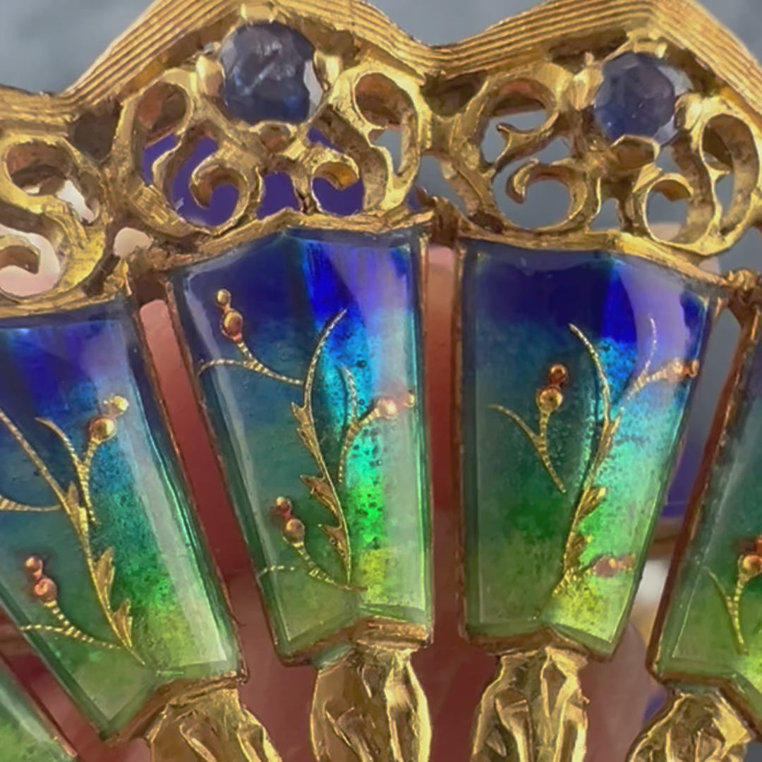 **Vintage-Fächerbrosche aus 18 Karat Gold mit Saphiren und Emaille**