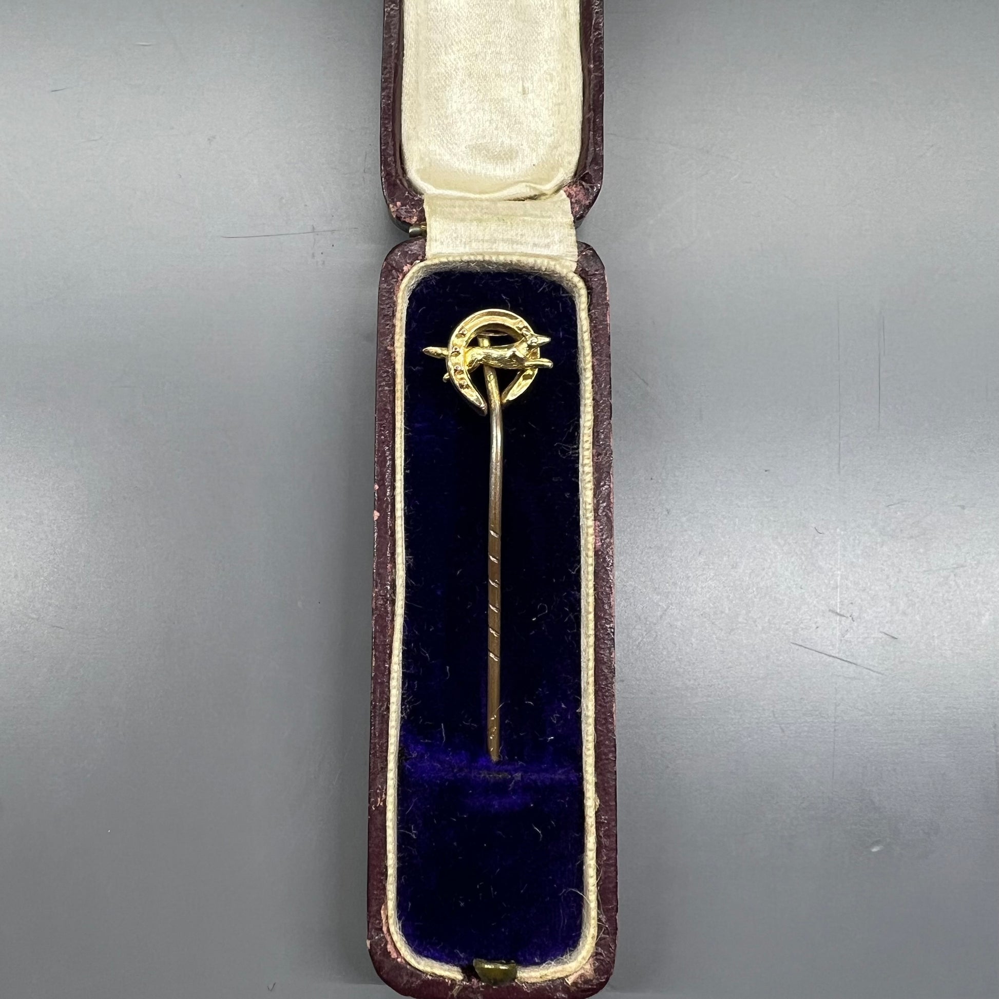 Diese bezaubernde viktorianische Krawattennadel zelebriert die ikonischen Symbole des englischen Sports und stellt ein Hufeisen und einen Fuchs dar. Das Stück wurde im Wachsausschmelzverfahren hergestellt und anschließend von Hand gemeißelt, was exquisite Details und hochwertige Handwerkskunst gewährleistet.