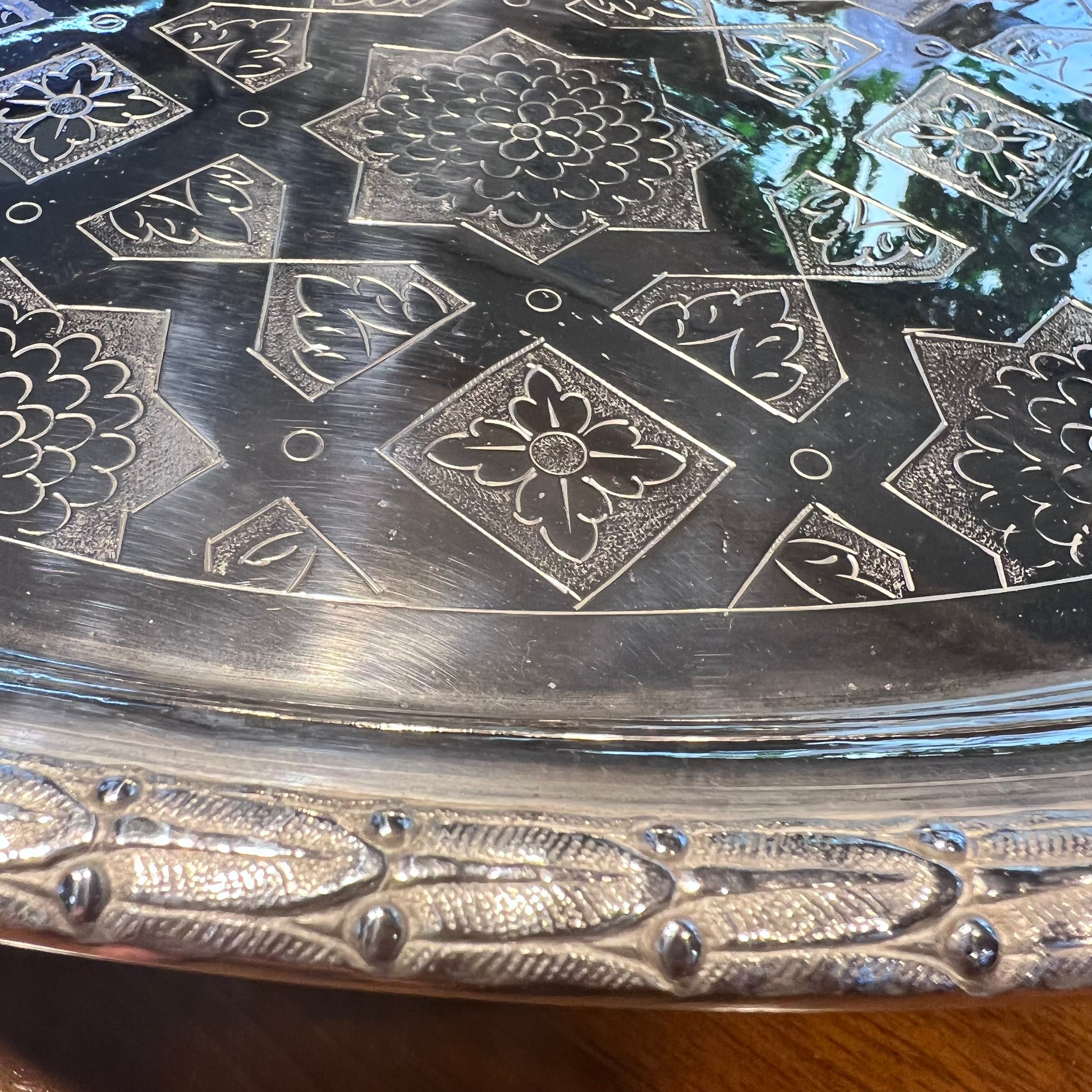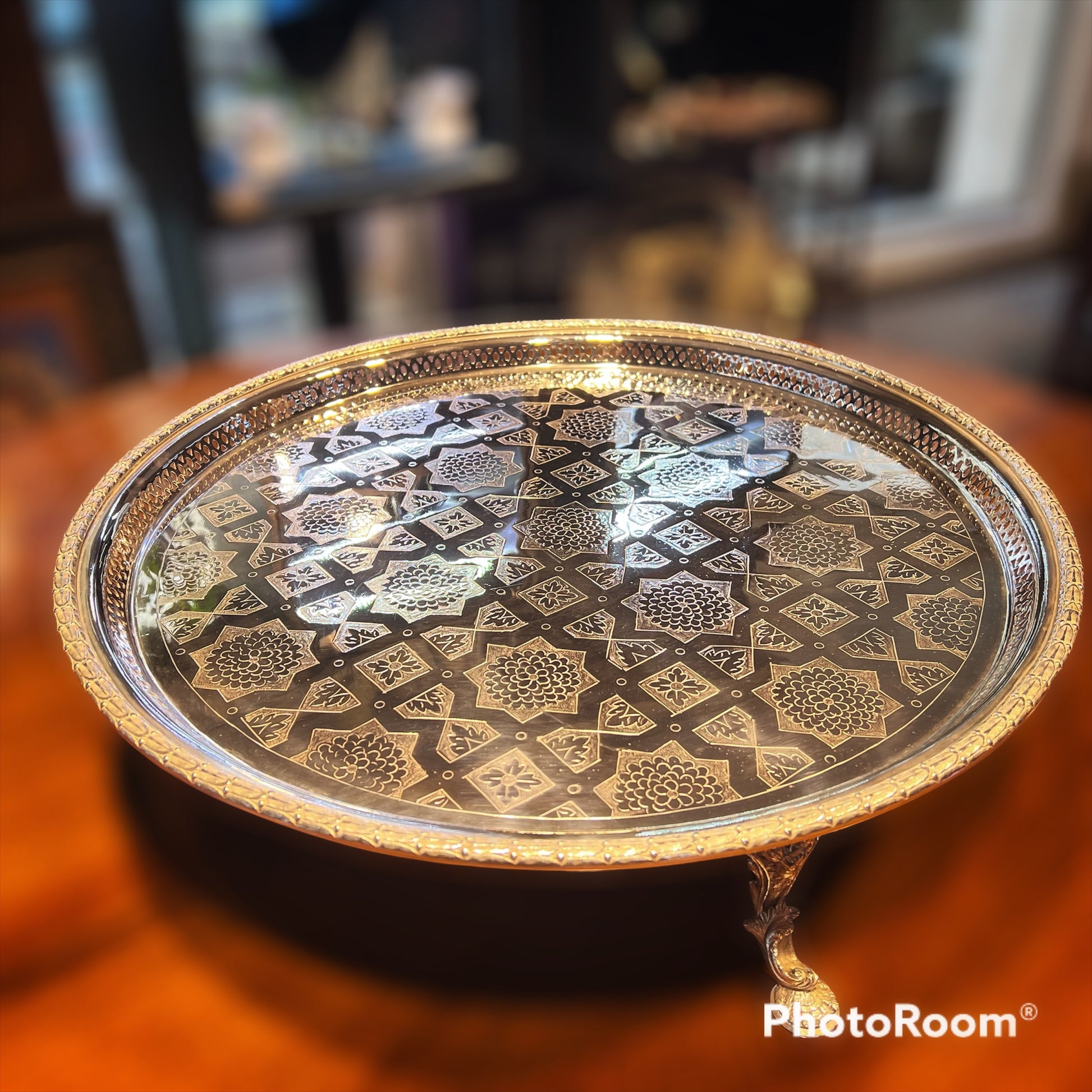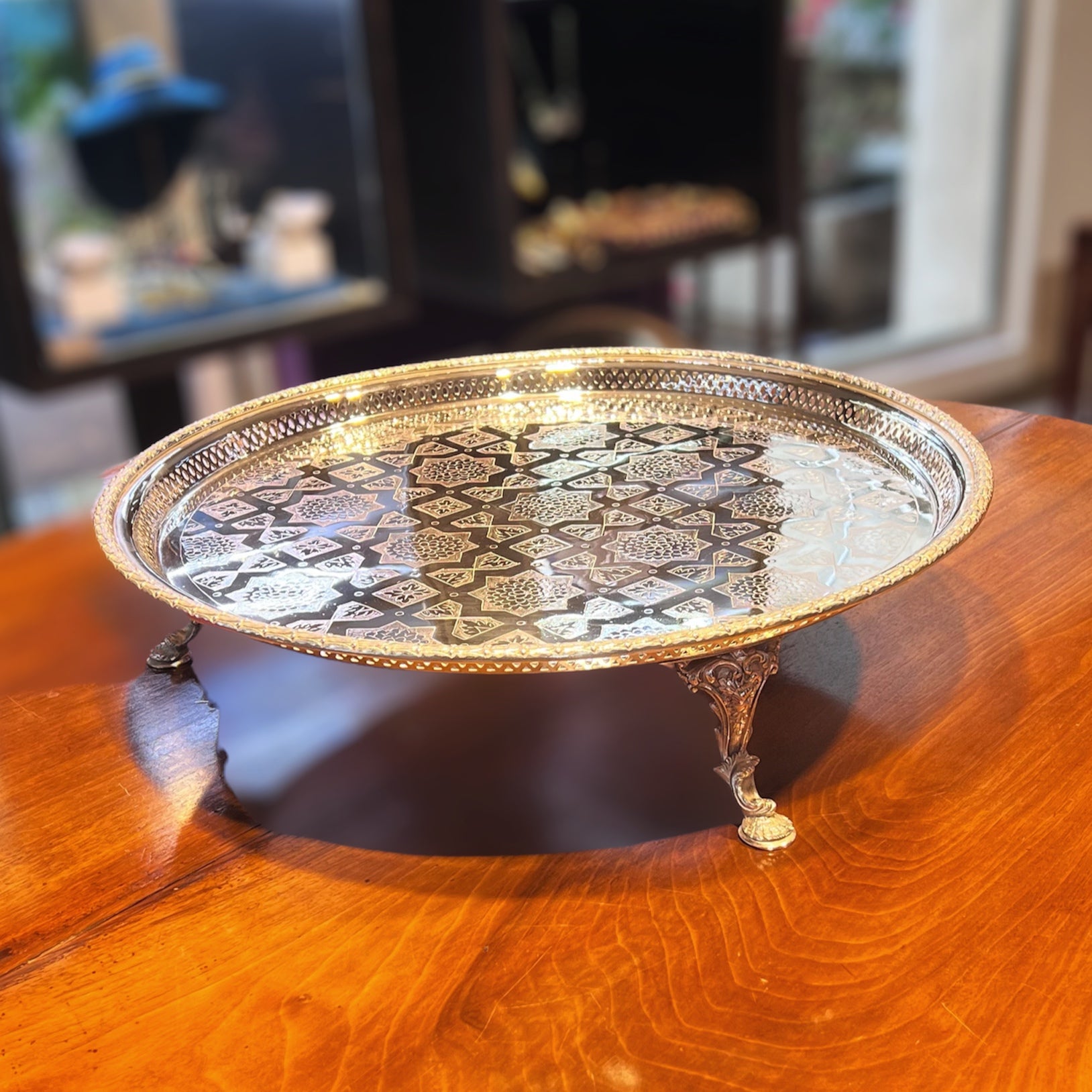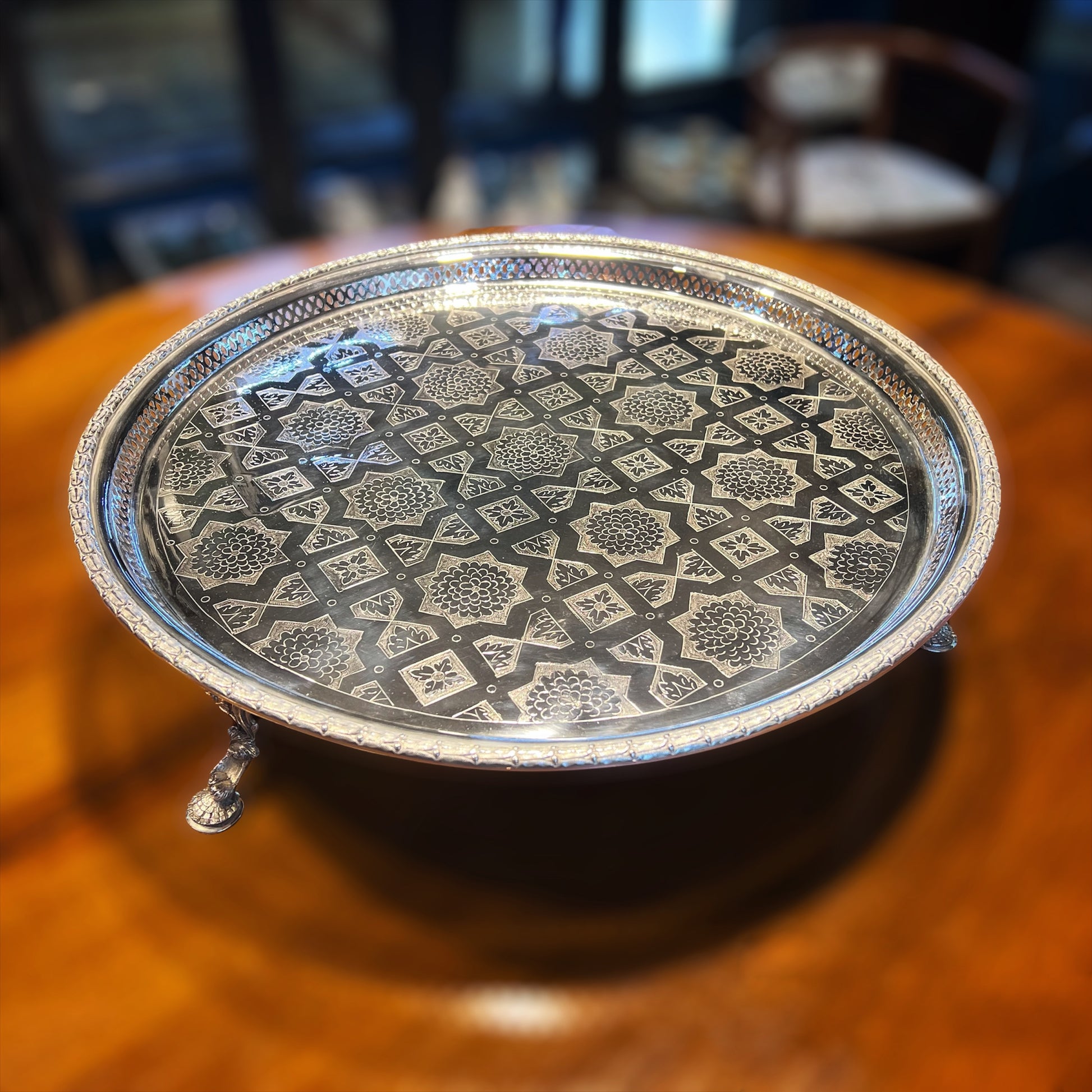 Eine prächtige und seltene flache Tortenplatte von beachtlicher Größe, getragen von drei hohen, gemeißelten Gussbeinen. Die Oberseite ist fein mit ungewöhnlichen geometrischen Motiven handgraviert und mit einem kleinen durchbrochenen Rand versehen, der mit Lorbeerblättern verziert ist. Die Unterseite trägt die Spuren eines Herstellers aus der viktorianischen Zeit um 1870. Es ist unmöglich, die Wirkung persönlich zu vermitteln, aber das Video hilft, die Proportionen zu veranschaulichen. Die vielseitige Verwendung ist offensichtlich, da die geräumige, flache Oberseite die Präsentation unzähliger Sammlungen ermöglicht, als Tafelaufsatz für Gäste oder einfach als spektakuläres Mittelstück, das Ihren Raum mit Geschmack und Persönlichkeit erhellt.