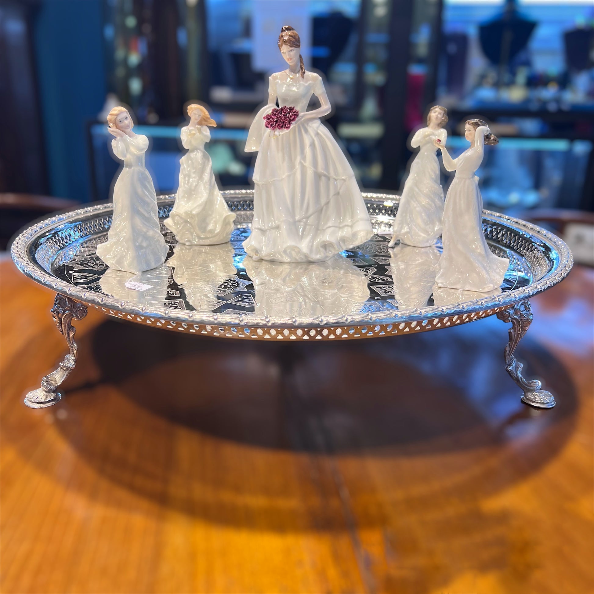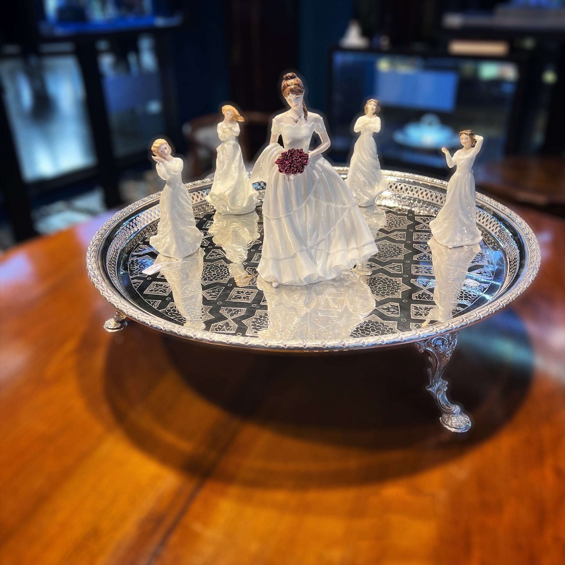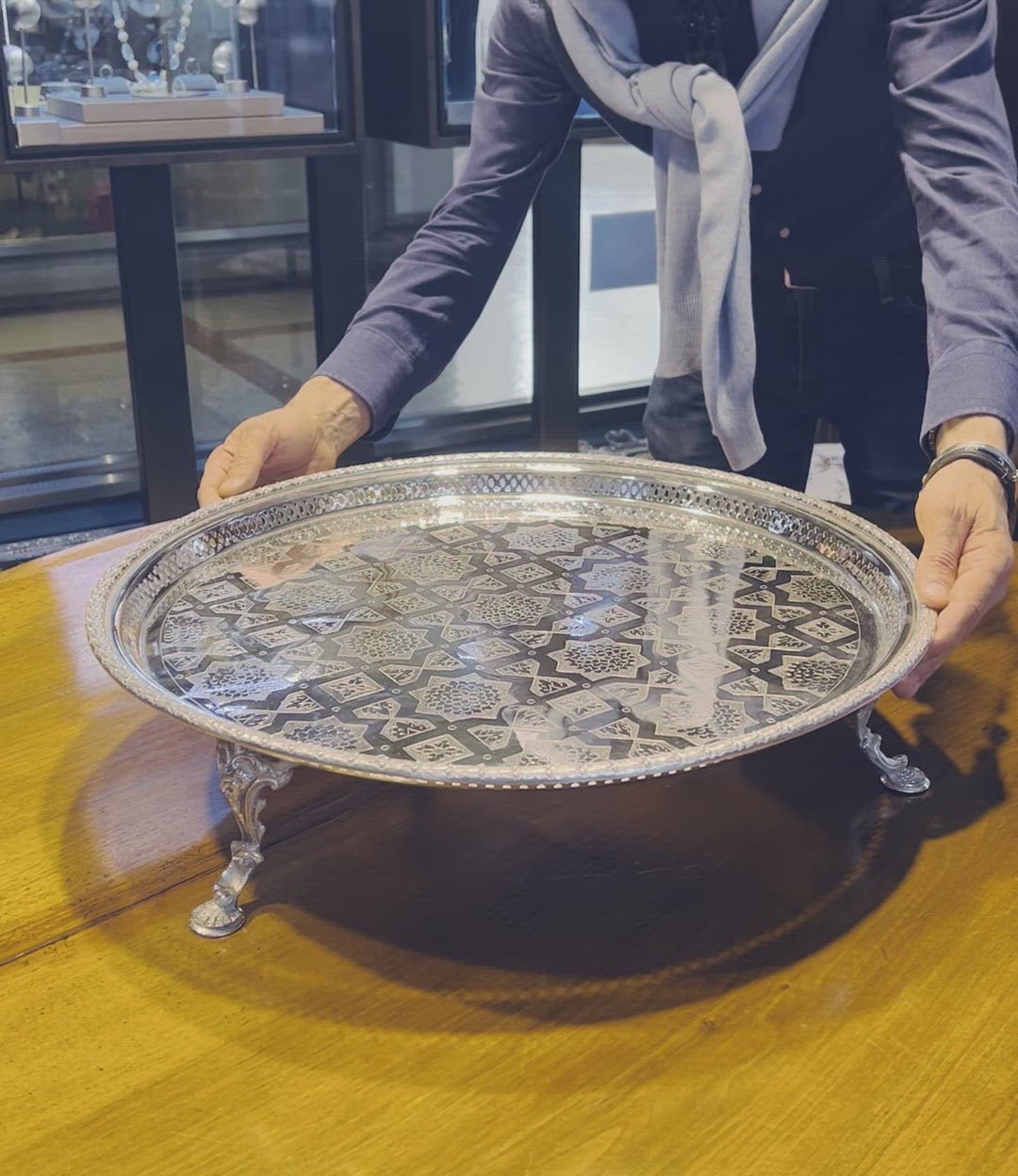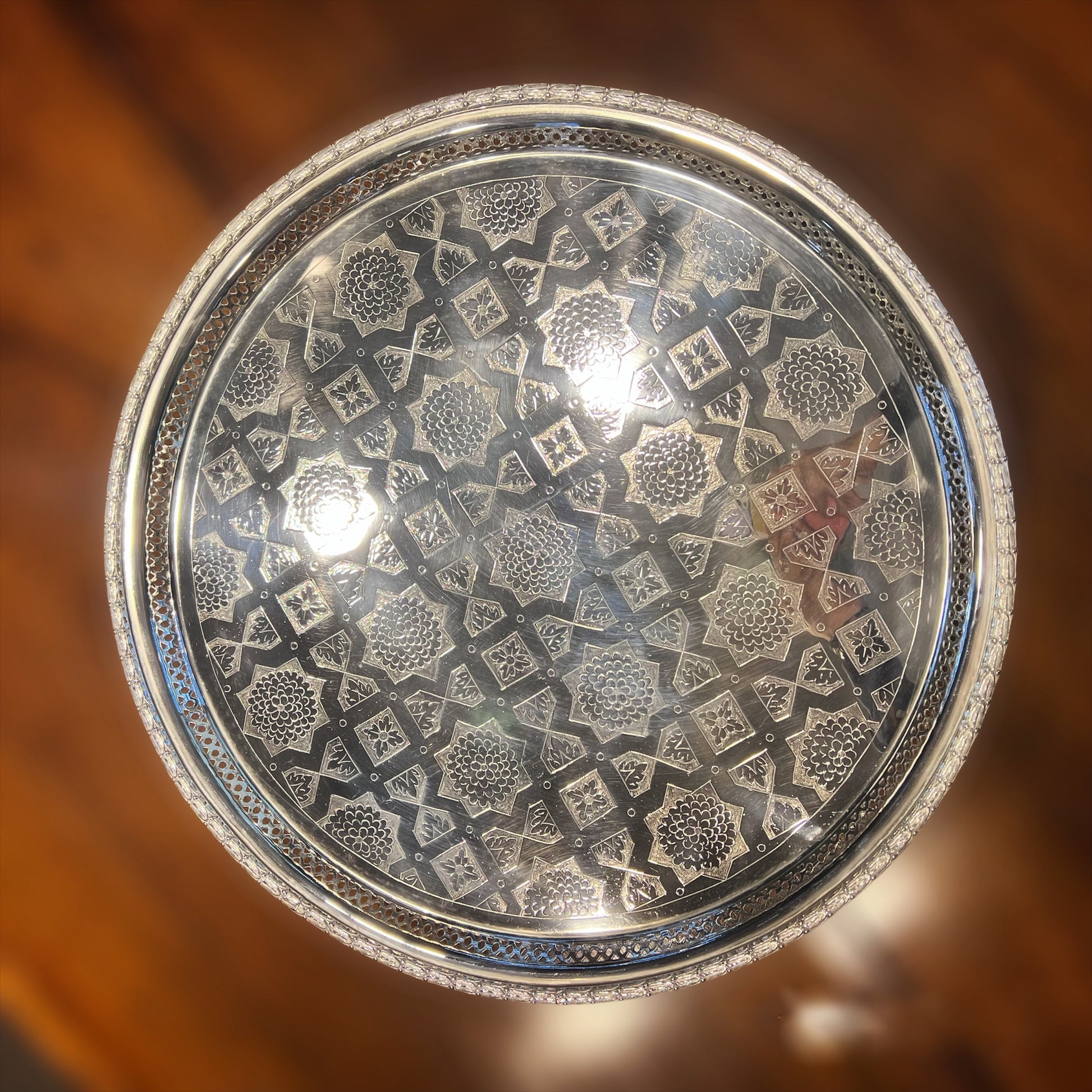 Eine prächtige und seltene flache Tortenplatte von beachtlicher Größe, getragen von drei hohen, gemeißelten Gussbeinen. Die Oberseite ist fein mit ungewöhnlichen geometrischen Motiven handgraviert und mit einem kleinen durchbrochenen Rand versehen, der mit Lorbeerblättern verziert ist. Die Unterseite trägt die Spuren eines Herstellers aus der viktorianischen Zeit um 1870. Es ist unmöglich, die Wirkung persönlich zu vermitteln, aber das Video hilft, die Proportionen zu veranschaulichen. Die vielseitige Verwendung ist offensichtlich, da die geräumige, flache Oberseite die Präsentation unzähliger Sammlungen ermöglicht, als Tafelaufsatz für Gäste oder einfach als spektakuläres Mittelstück, das Ihren Raum mit Geschmack und Persönlichkeit erhellt.