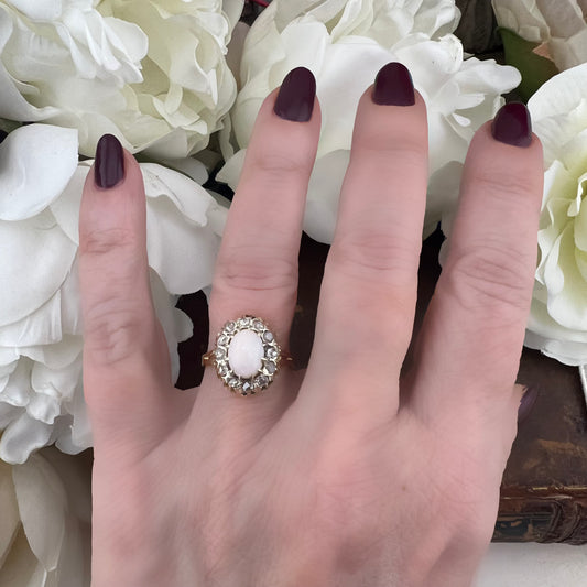 Anello inglese antico edoardiano 1900-1915 in oro giallo 18 k, opale cabochon e diamanti