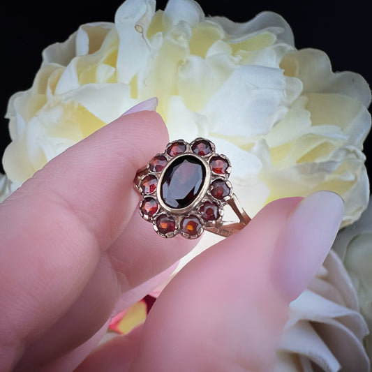 Vintage Gold Daisy Ring with Cabochon Garnet