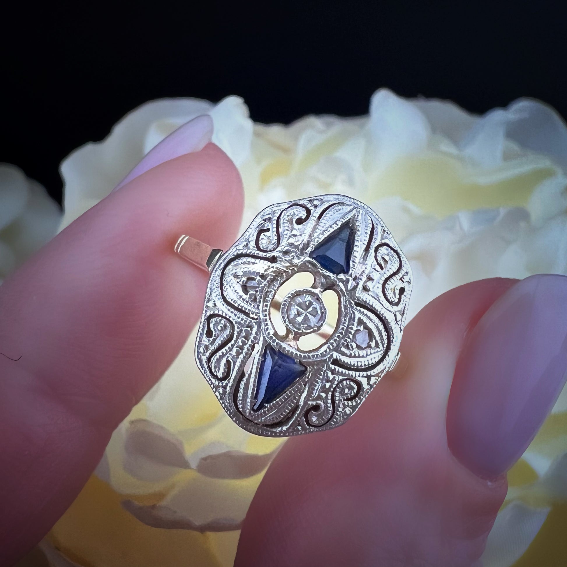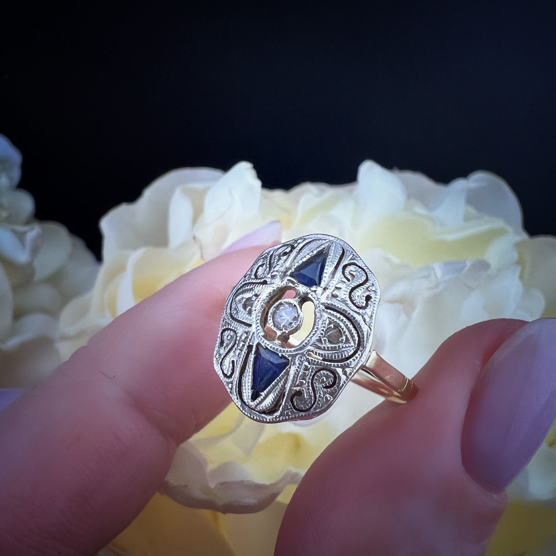 The ring's head, finely pierced and hand-chiseled, features an elegant symmetrical motif with a central wire setting enclosing a small rose-cut diamond (coroné), framed by two triangular sapphires of intense blue. The contrast between the 14-karat gold and platinum plating enhances the refinement and elegance typical of the era.