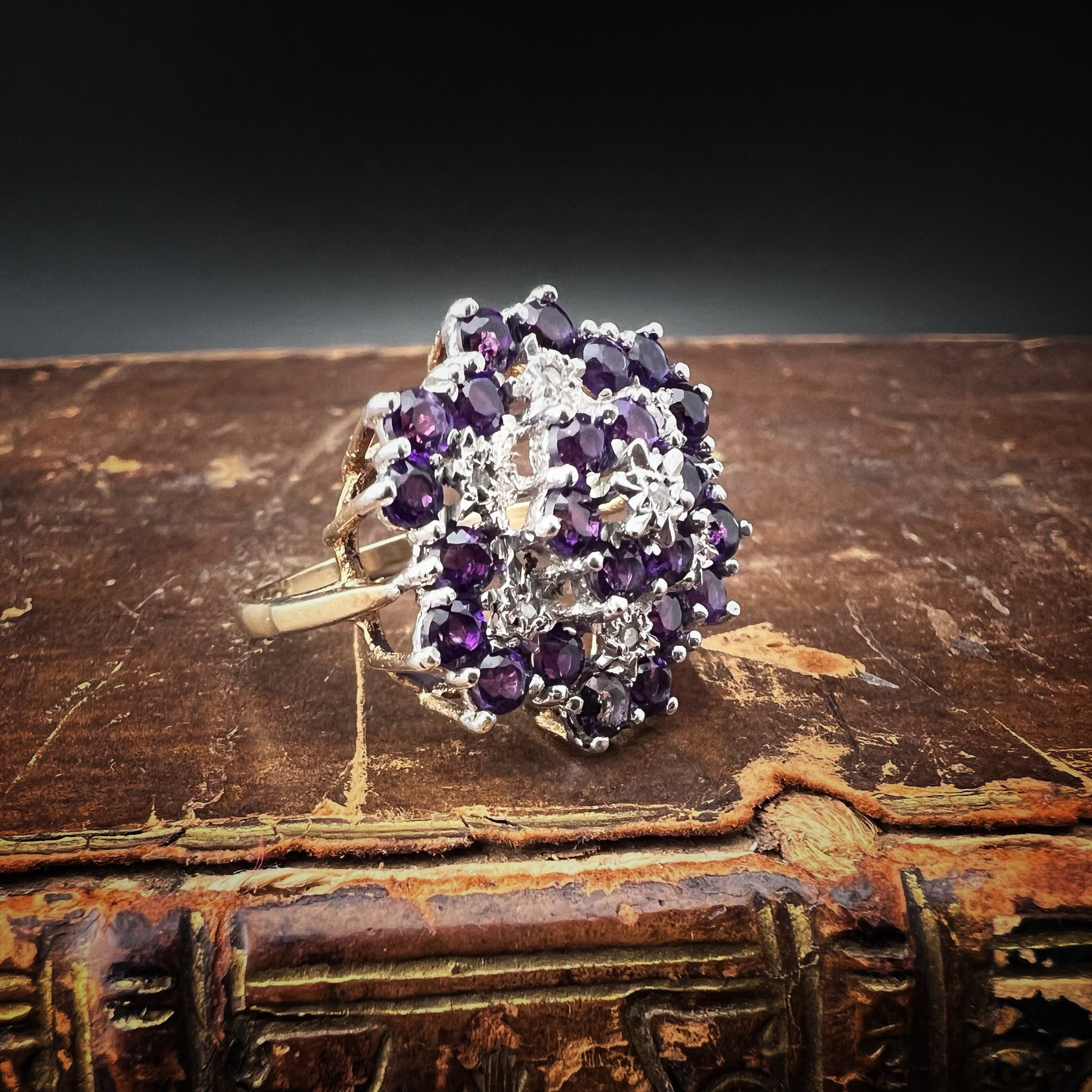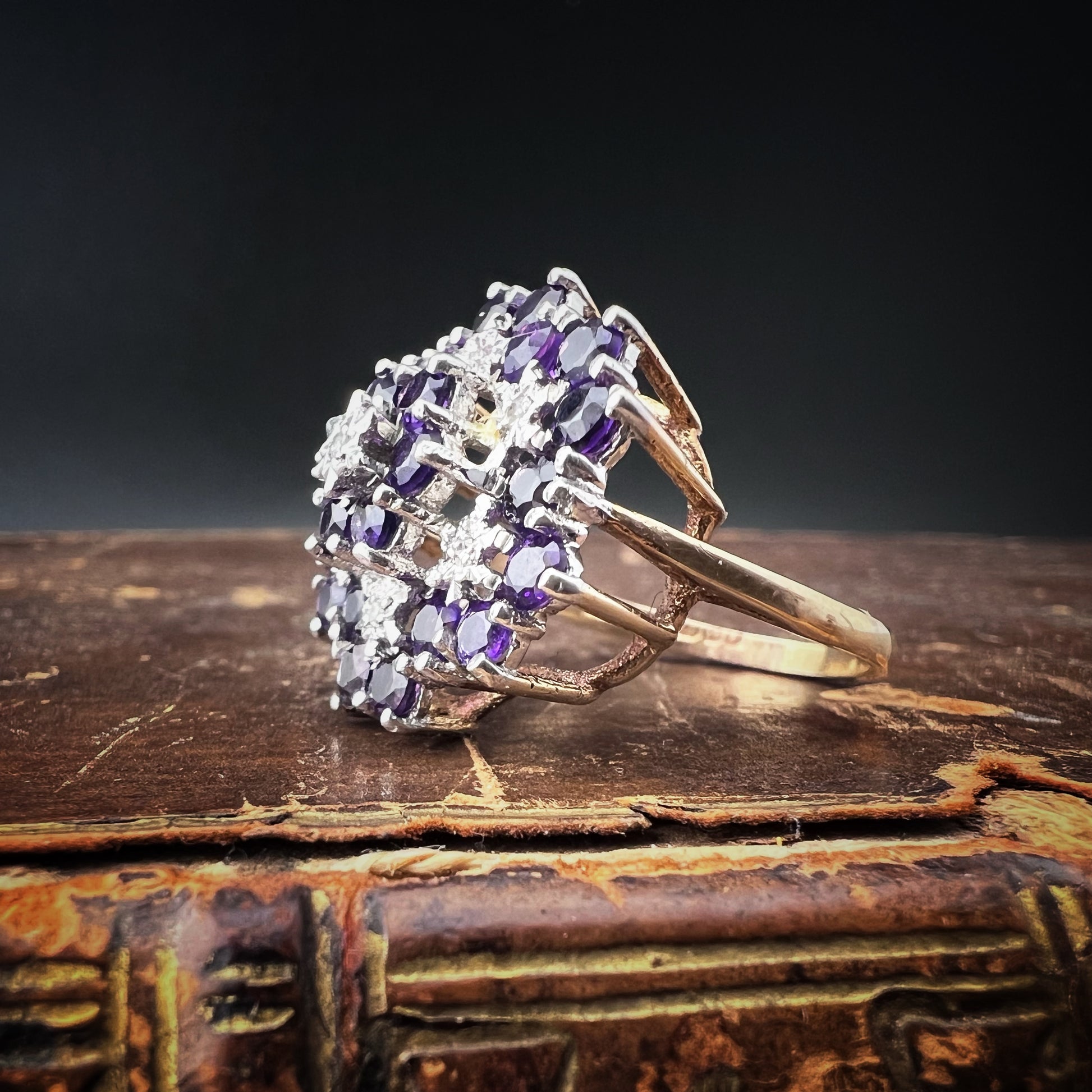 This ring embodies the timeless elegance of vintage design, enhanced by precious and refined details. It's a rare, hard-to-find piece that combines historical value and quality craftsmanship, perfect for those who love collecting unique jewelry or want a standout accessory. Its refined craftsmanship and harmonious combination of amethysts and diamonds make it a special gift or a perfect addition to any personal collection.