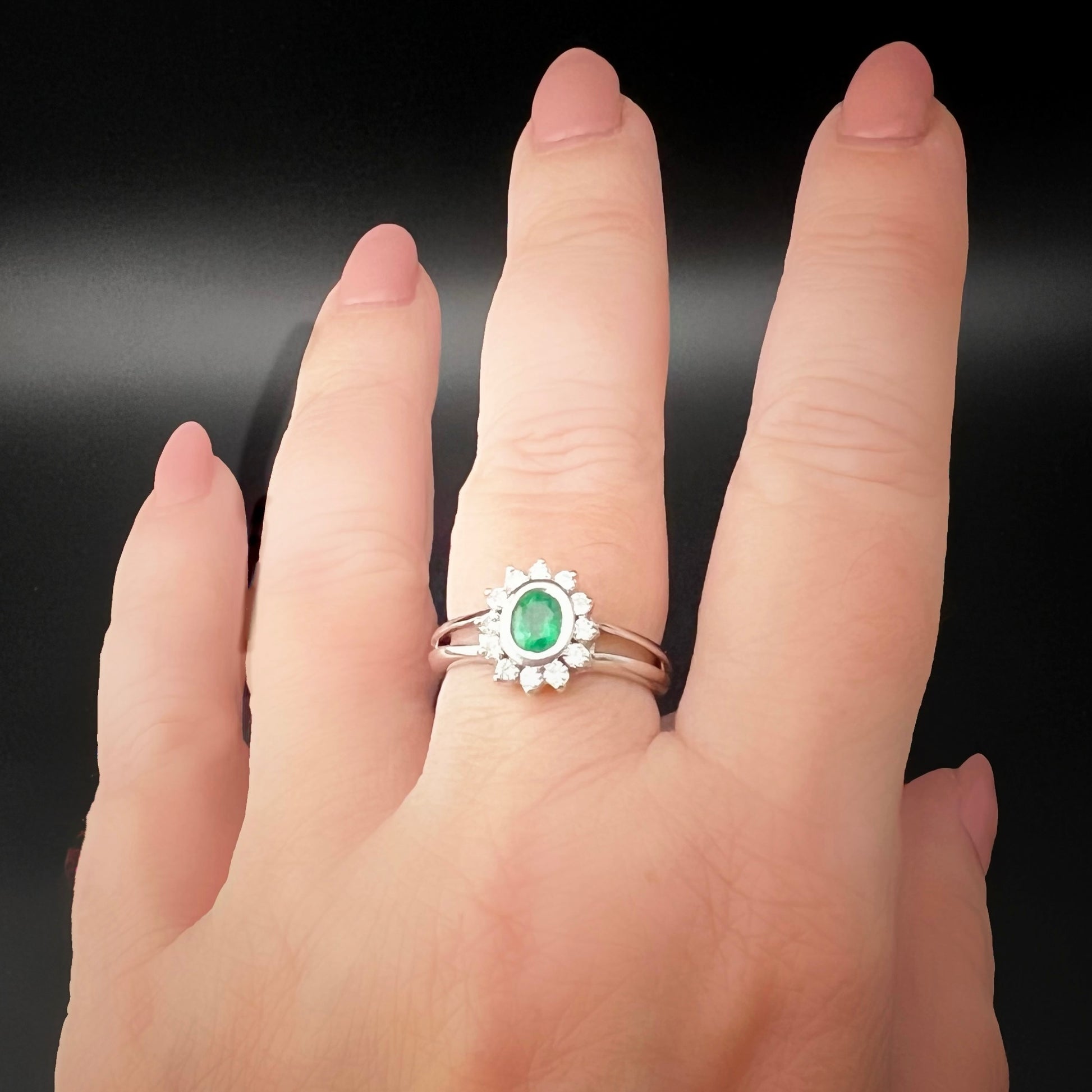 Crafted from 18k white gold, the ring showcases an oval emerald, faceted to best reflect its extraordinary transparency and vivid, natural, luminous green color.