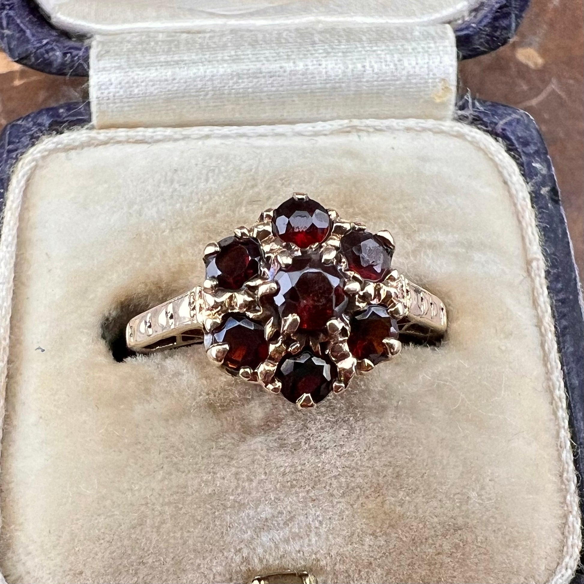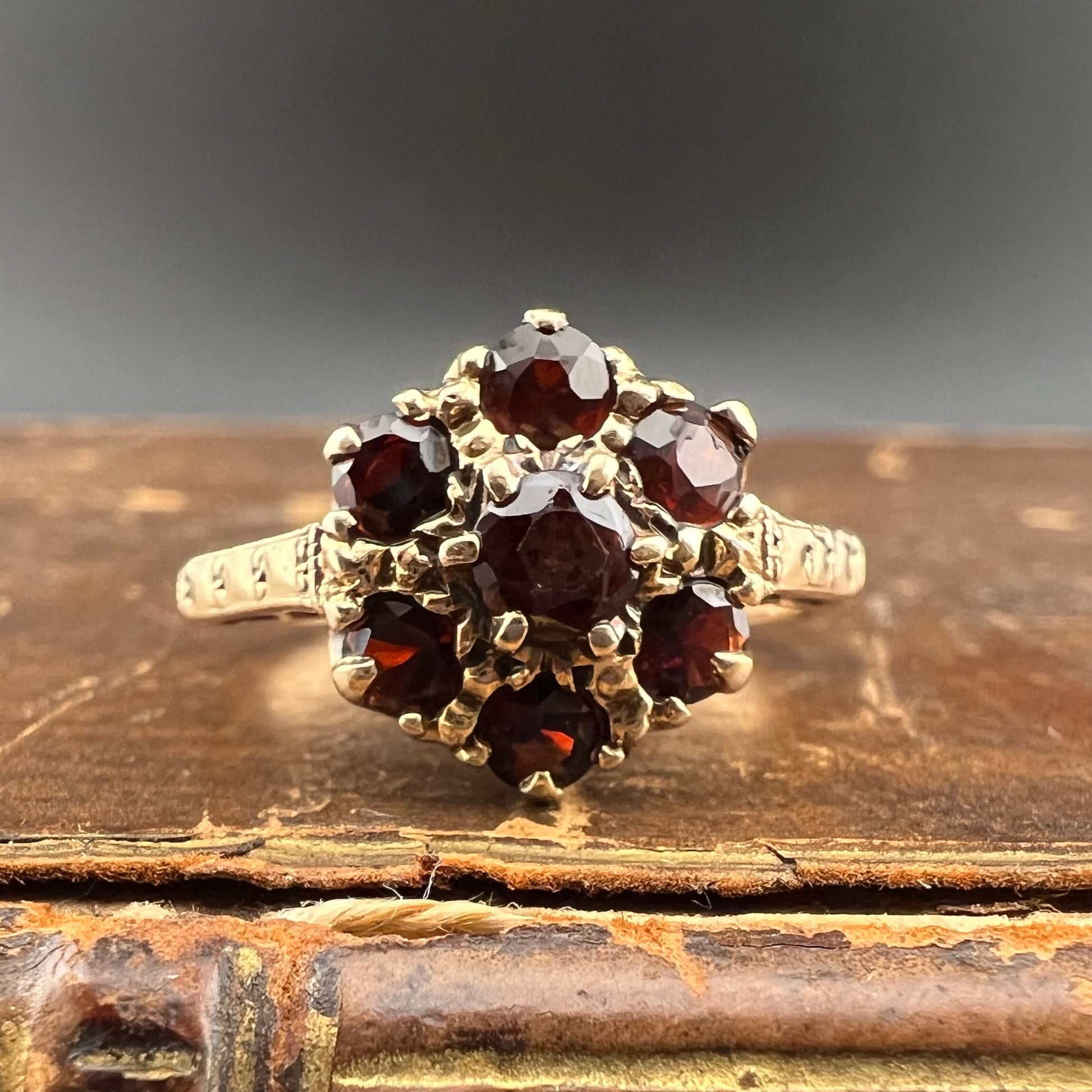 Vintage daisy-shaped ring composed of seven garnets, crafted in 9-karat yellow gold according to English tradition. The shoulders, decorated in relief, split into a gallery, creating an elegant and refined design. The garnets are supported by prongs and an elaborate and meticulously crafted setting, enhancing their beauty and allure.