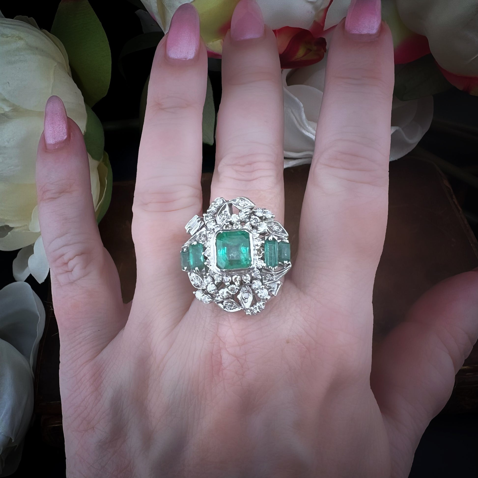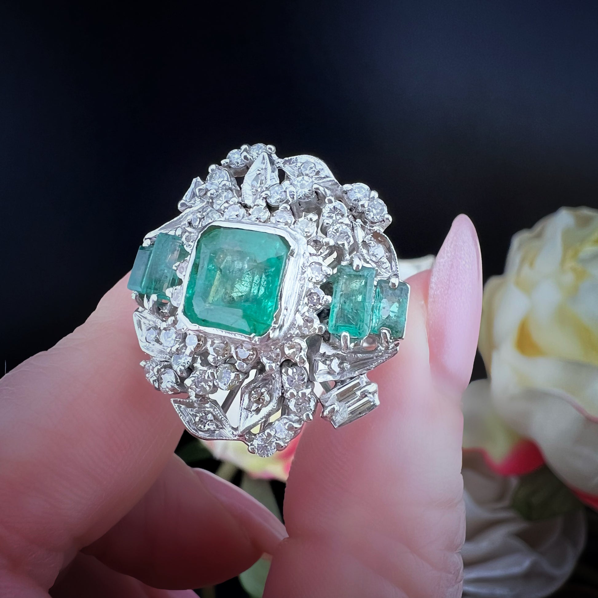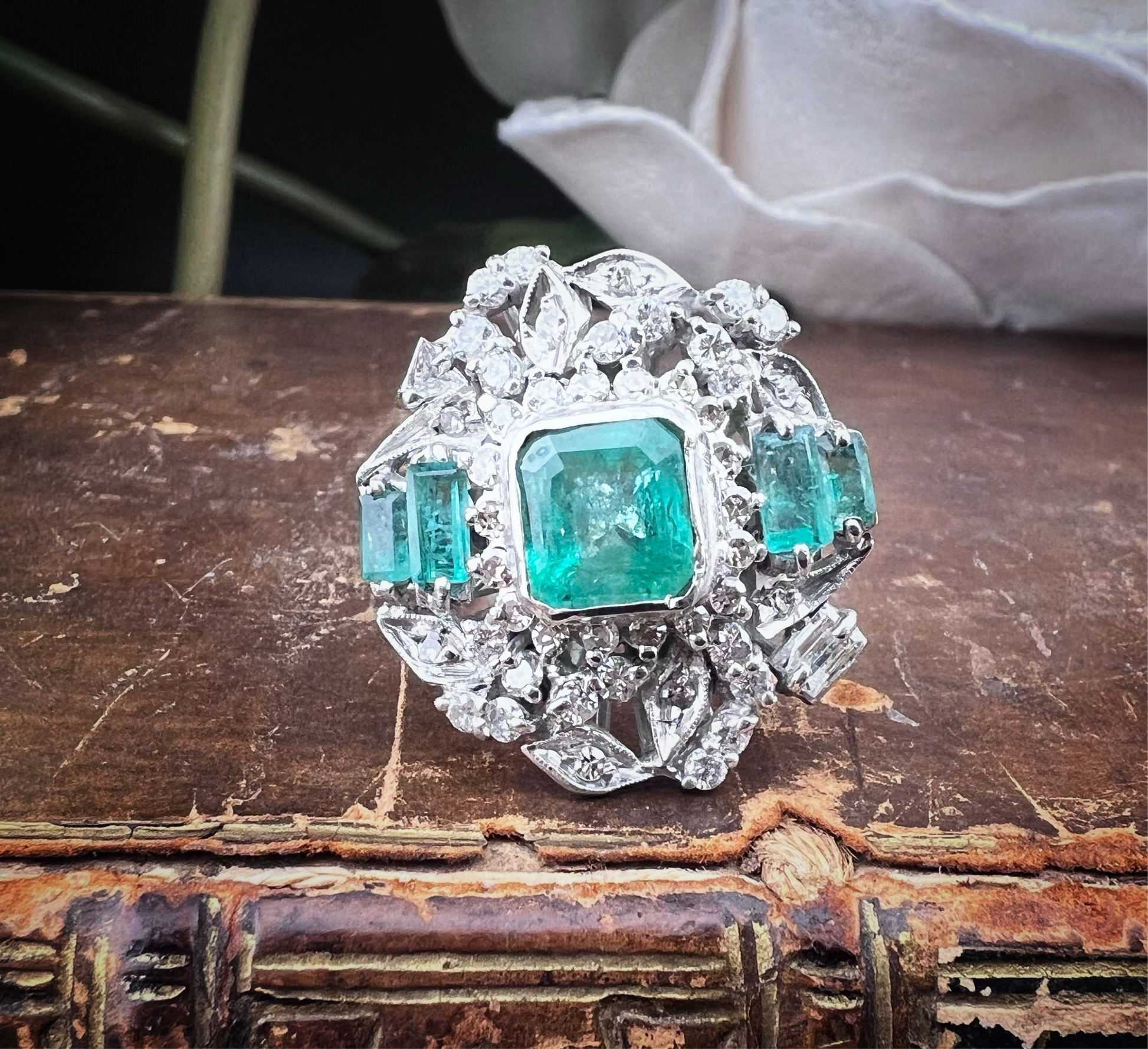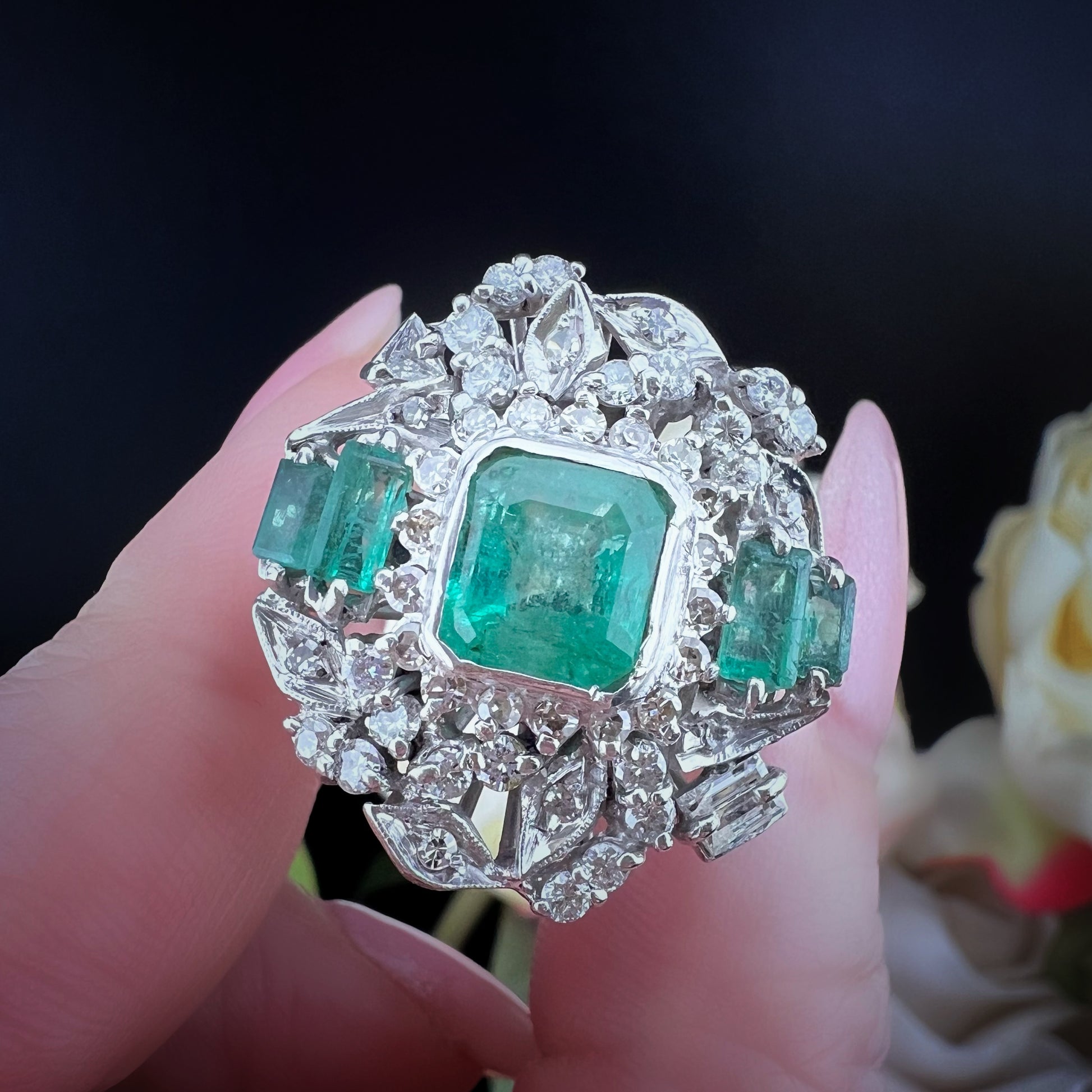 At the center, a magnificent, vivid, and transparent Colombian emerald weighing approximately 2.30 ct is set flush and framed by a floral and geometric composition of round-cut diamonds. On either side, four elongated emeralds—two on each side—are held in place by prongs that highlight their clarity and intense color, for an estimated total of 0.25 ct and 0.18 ct per pair.