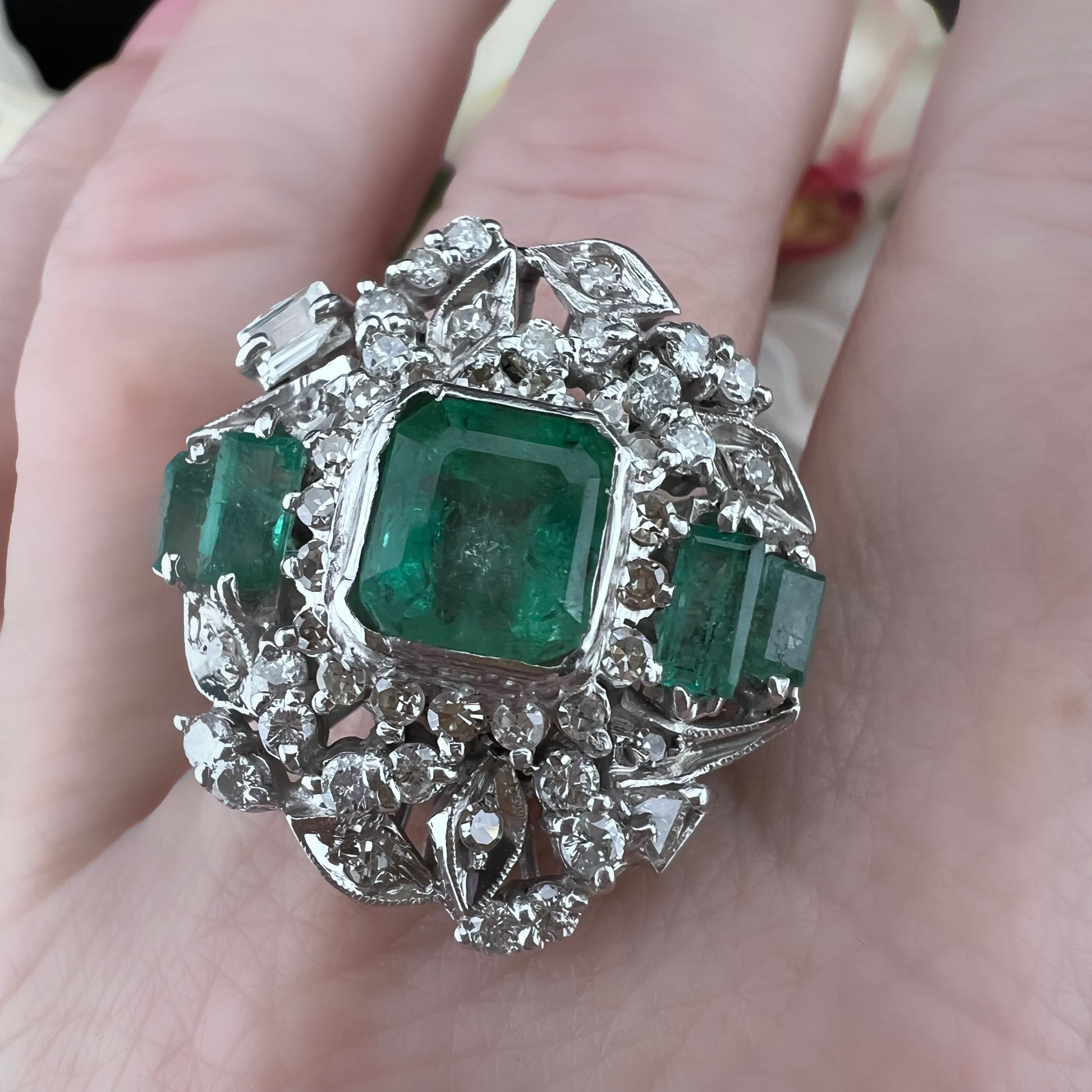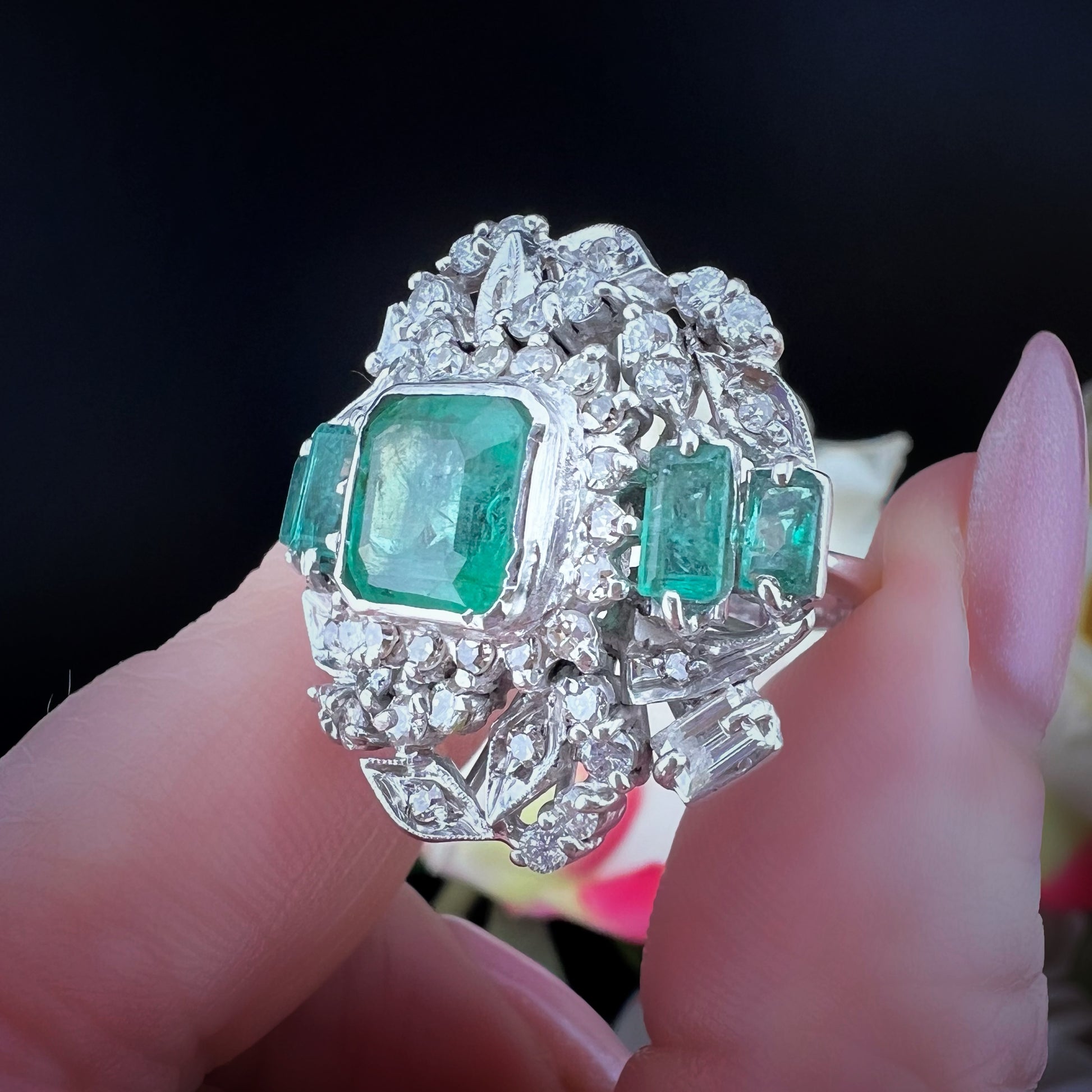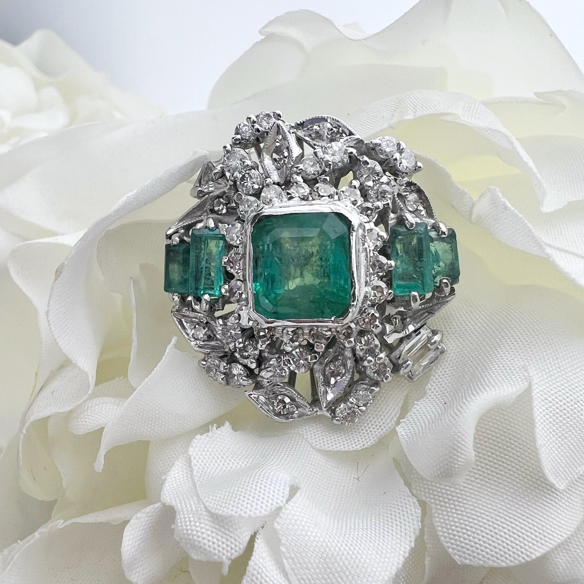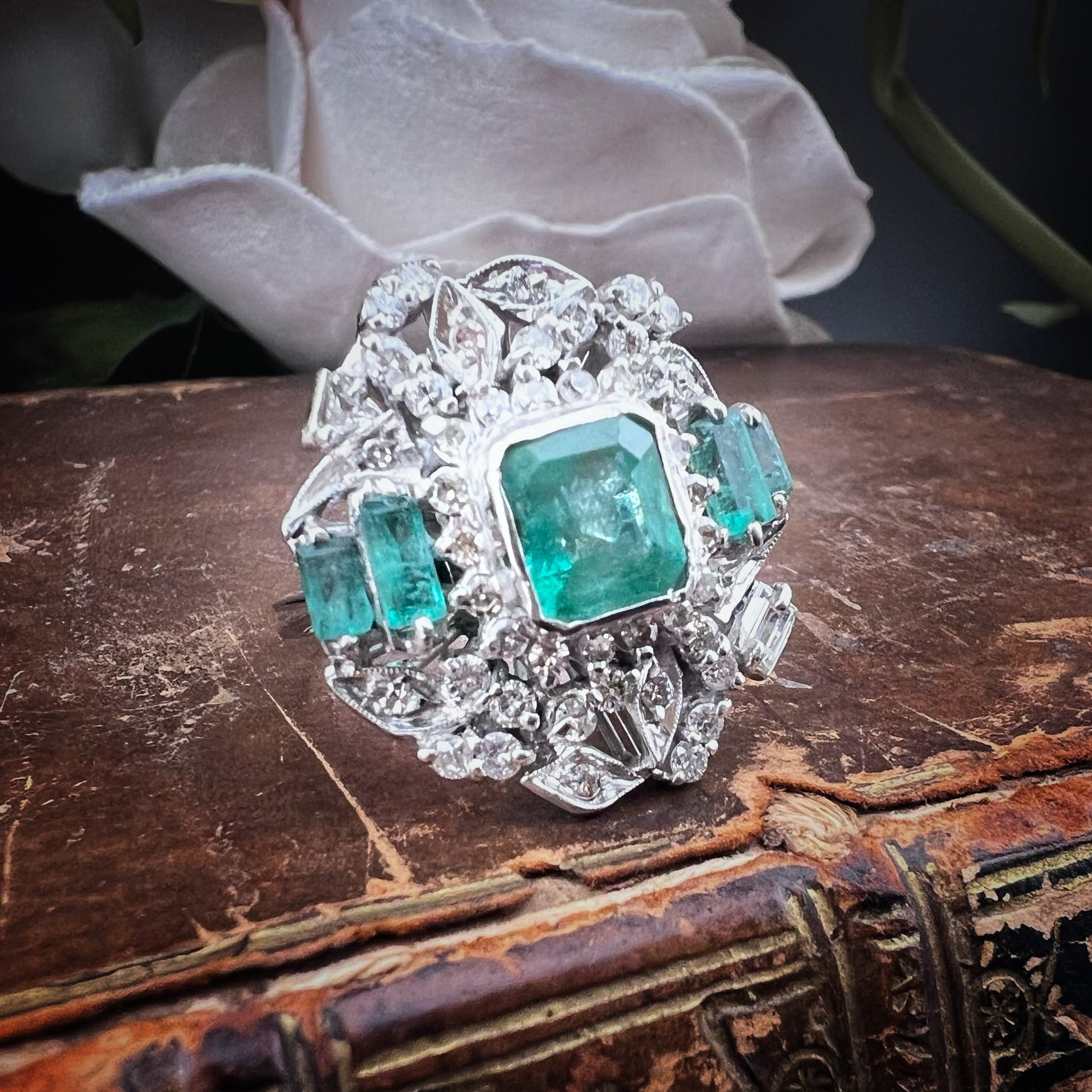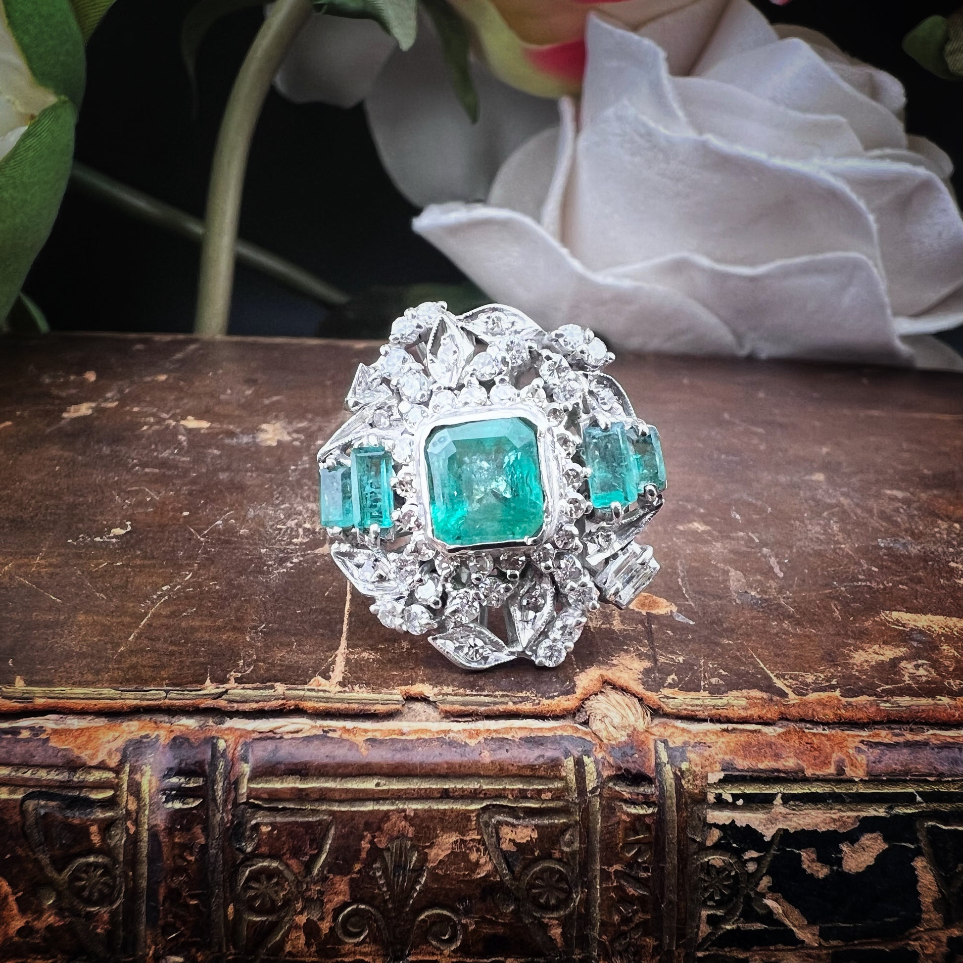 At the center, a magnificent, vivid, and transparent Colombian emerald weighing approximately 2.30 ct is set flush and framed by a floral and geometric composition of round-cut diamonds. On either side, four elongated emeralds—two on each side—are held in place by prongs that highlight their clarity and intense color, for an estimated total of 0.25 ct and 0.18 ct per pair.