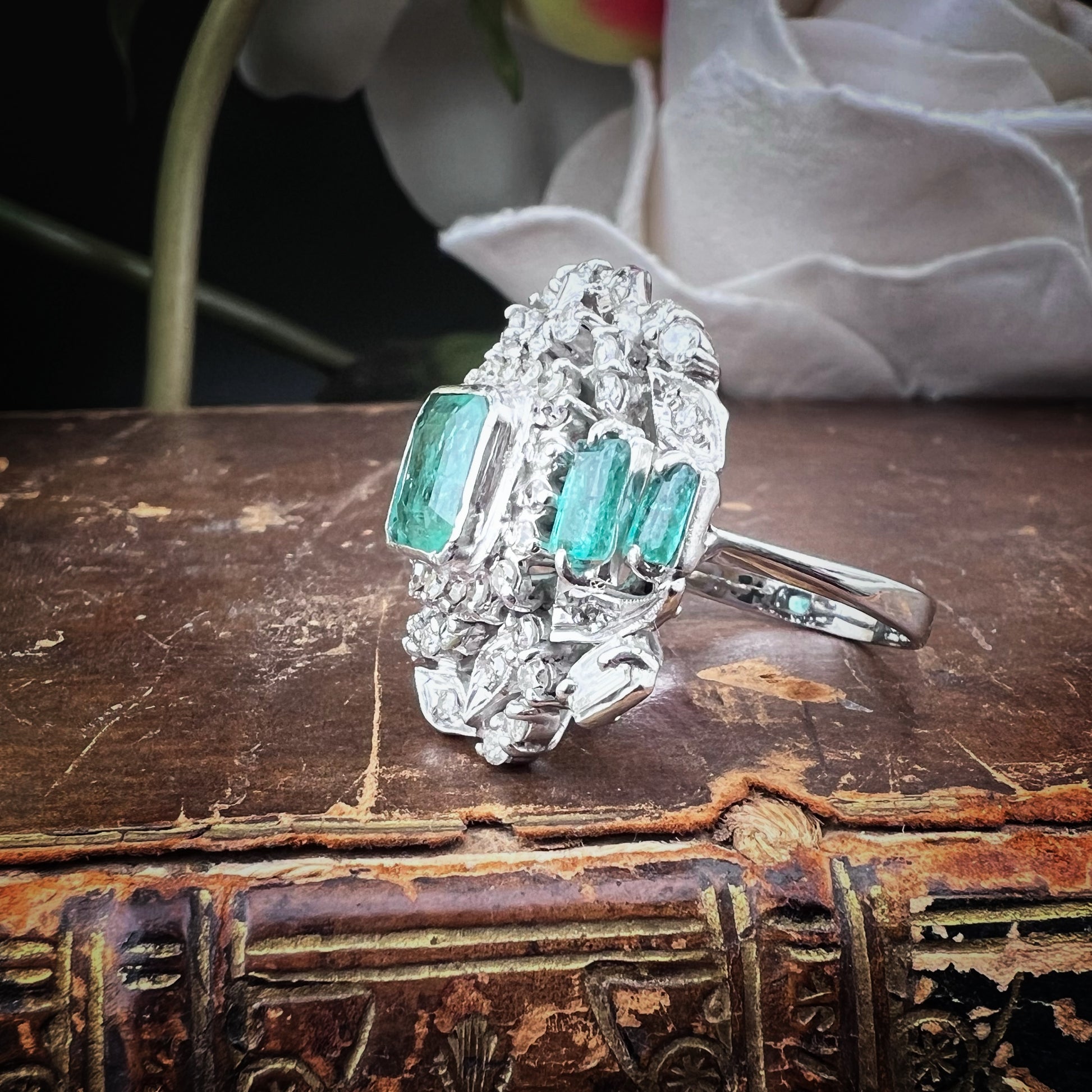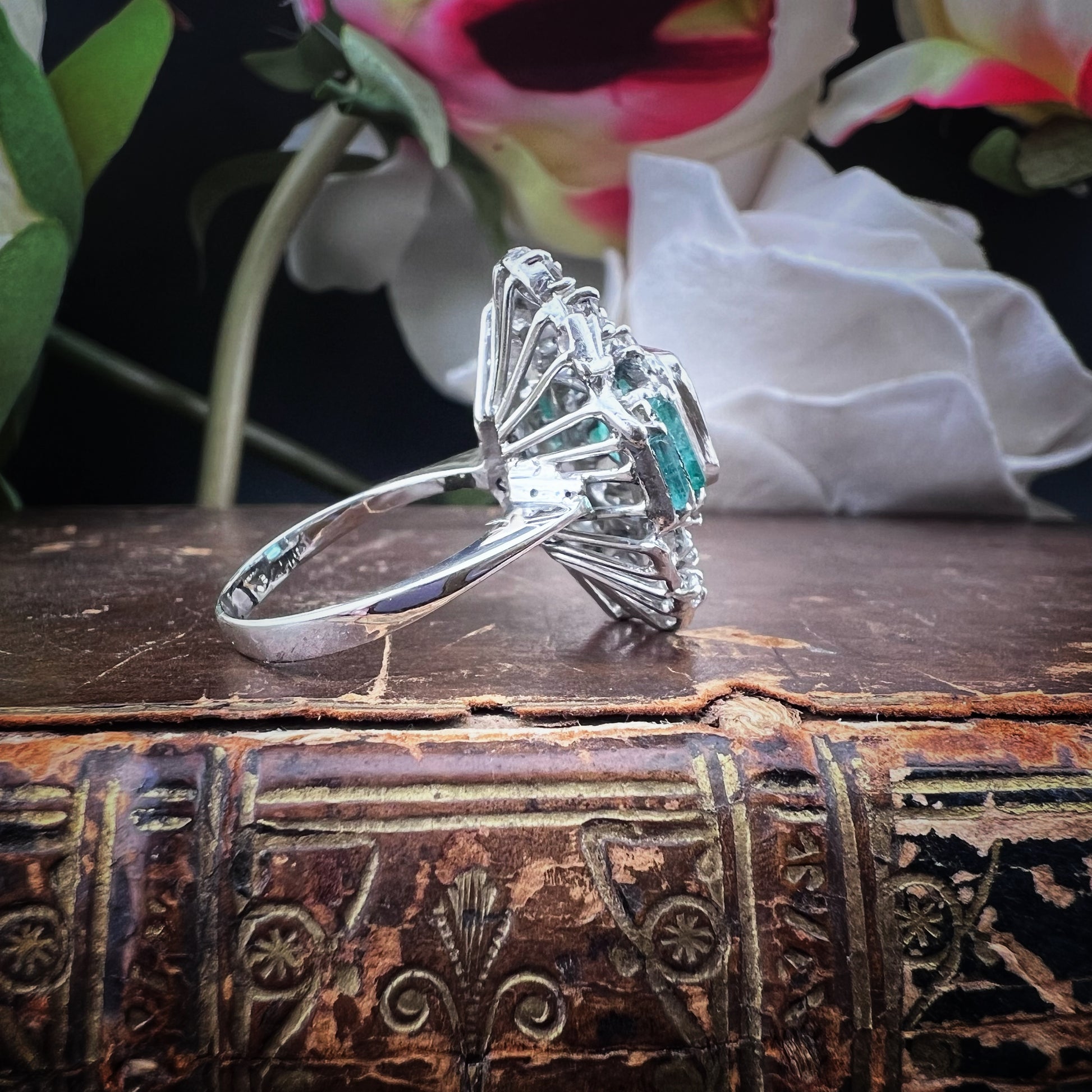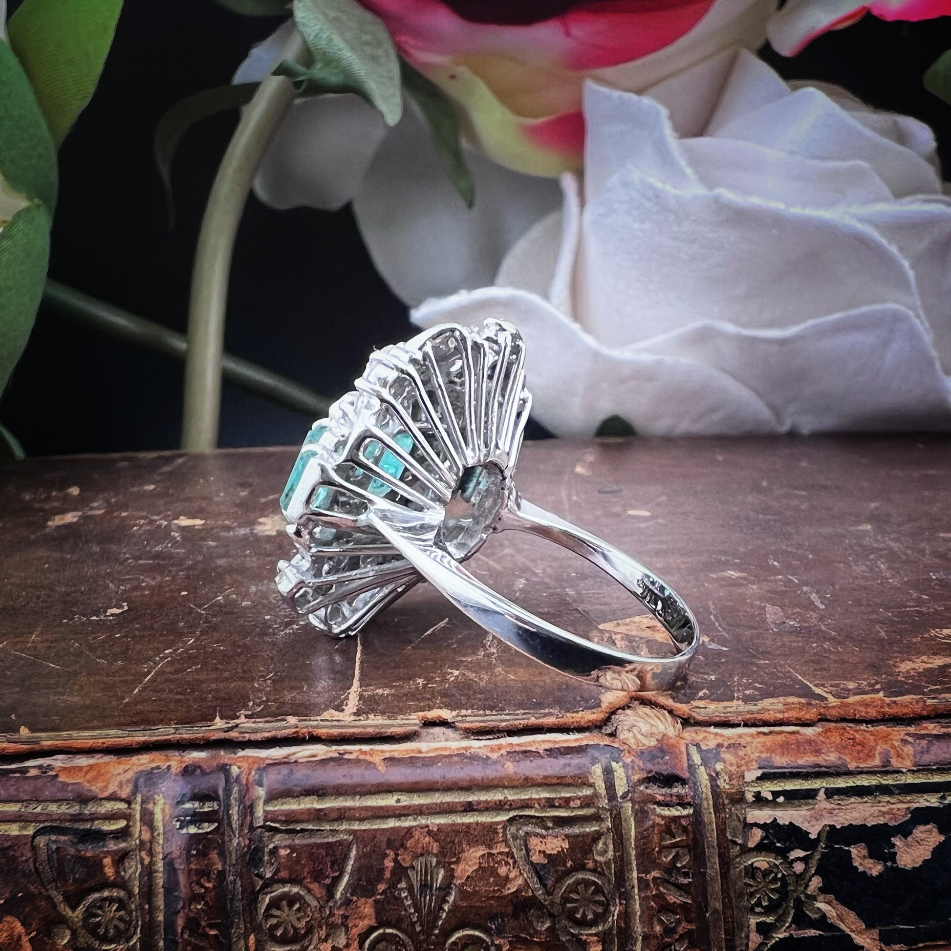 A 1950s masterpiece that embodies the elegance and creativity of vintage fine jewelry. This white gold ring stands out for its elaborate and dramatic design, the fruit of the imagination and skill of an expert goldsmith.
