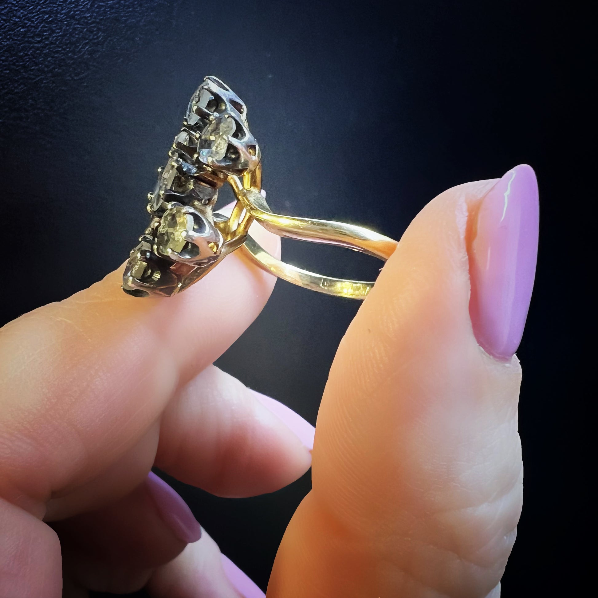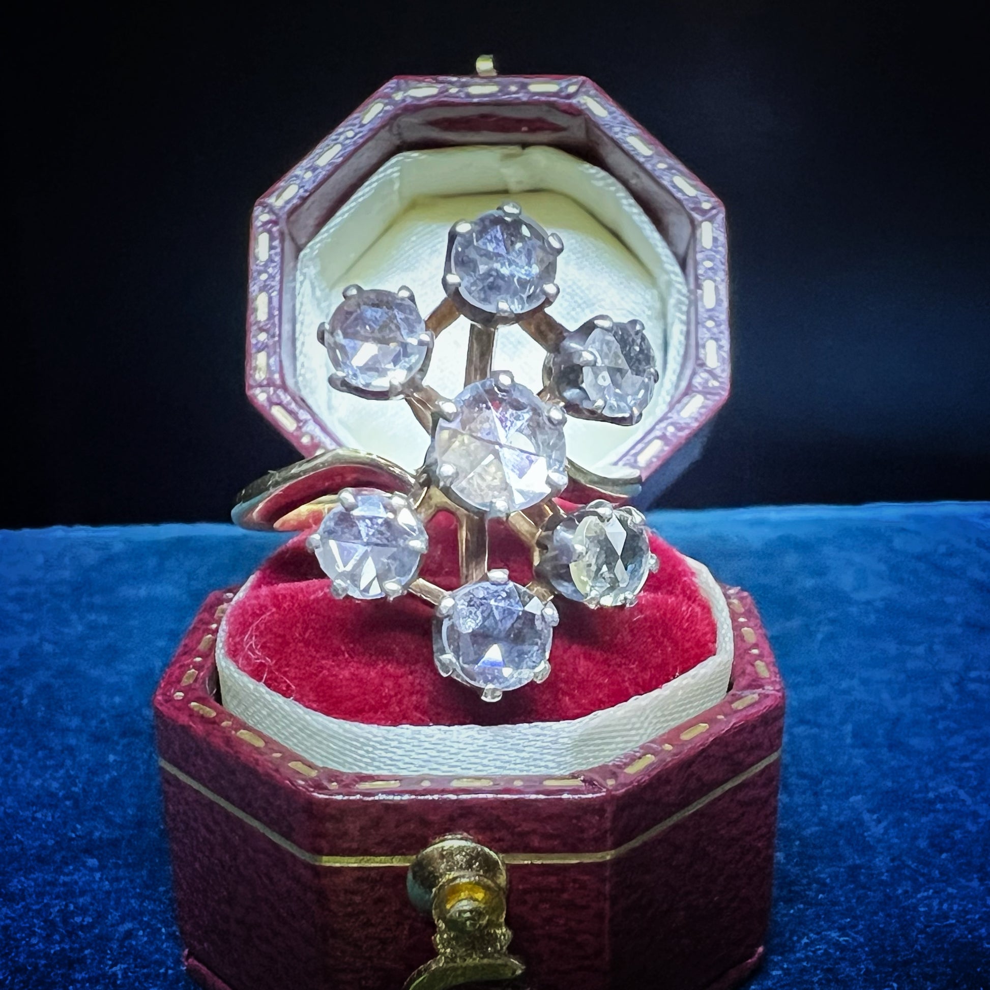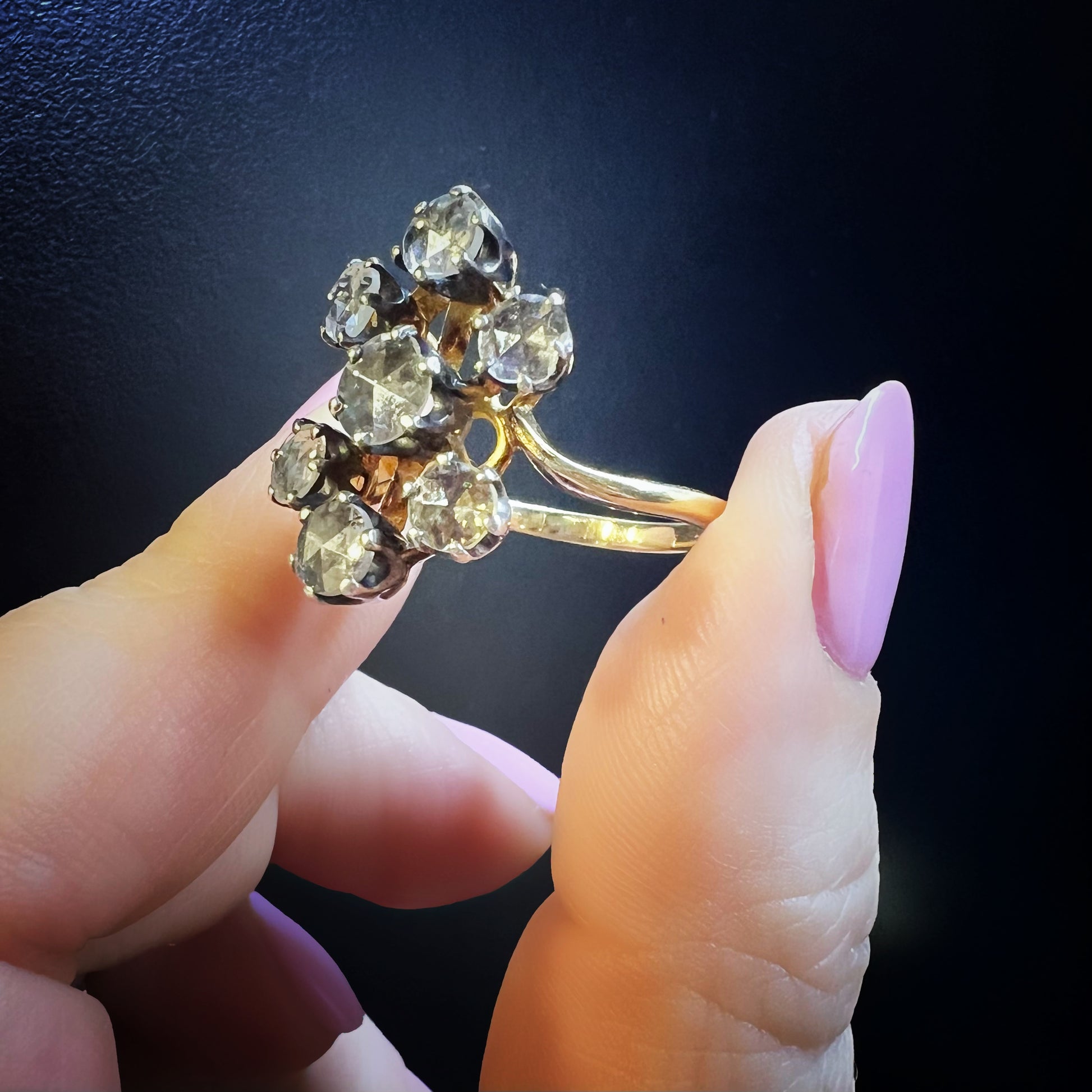 A charming antique ring with a unique and original structure. Crafted in the early 1900s in 18-karat yellow gold, it features silver bezels supporting seven rose-cut diamonds, arranged in a refined floral motif. What makes this piece special is the free-flowing diamonds, which add a touch of dynamism and brilliance.