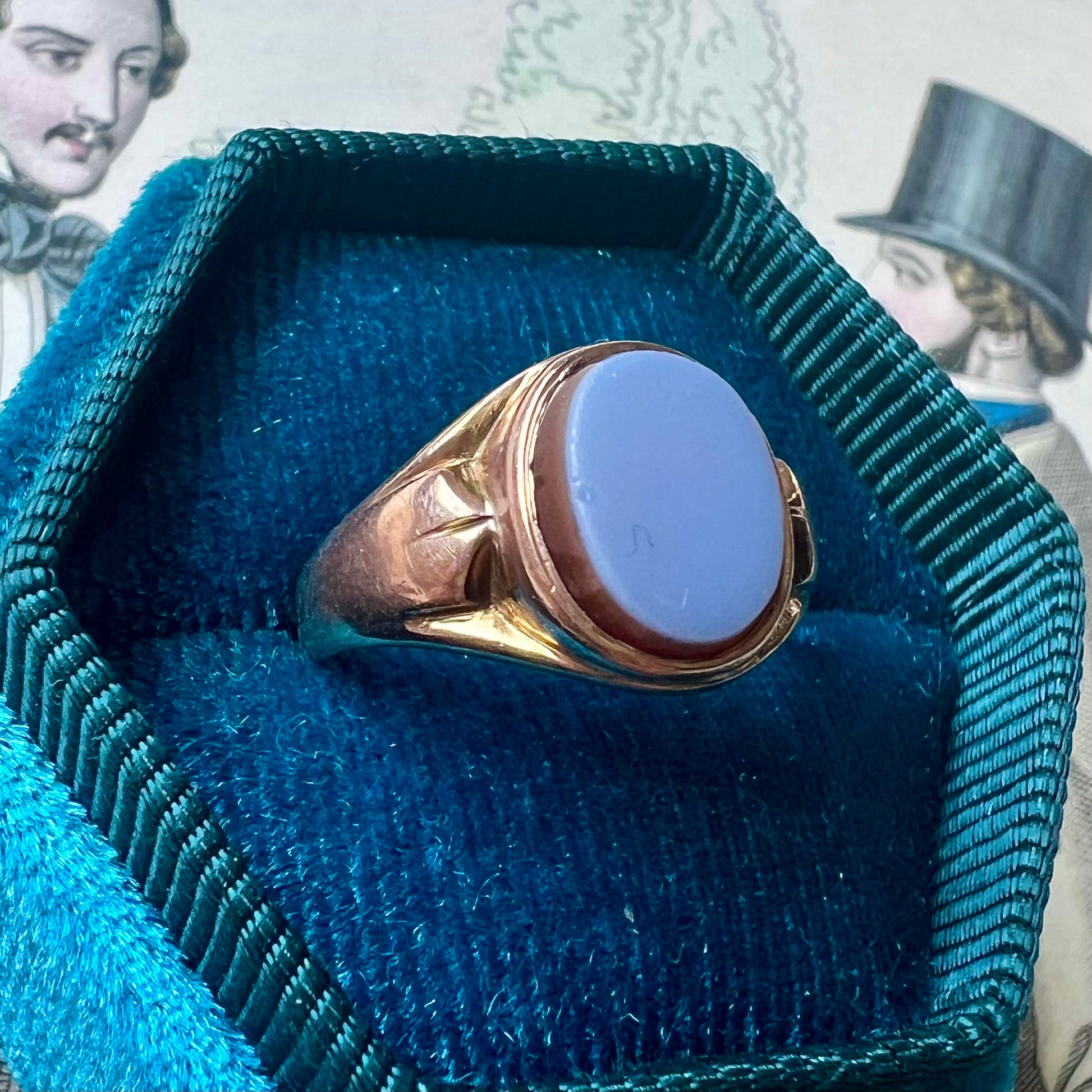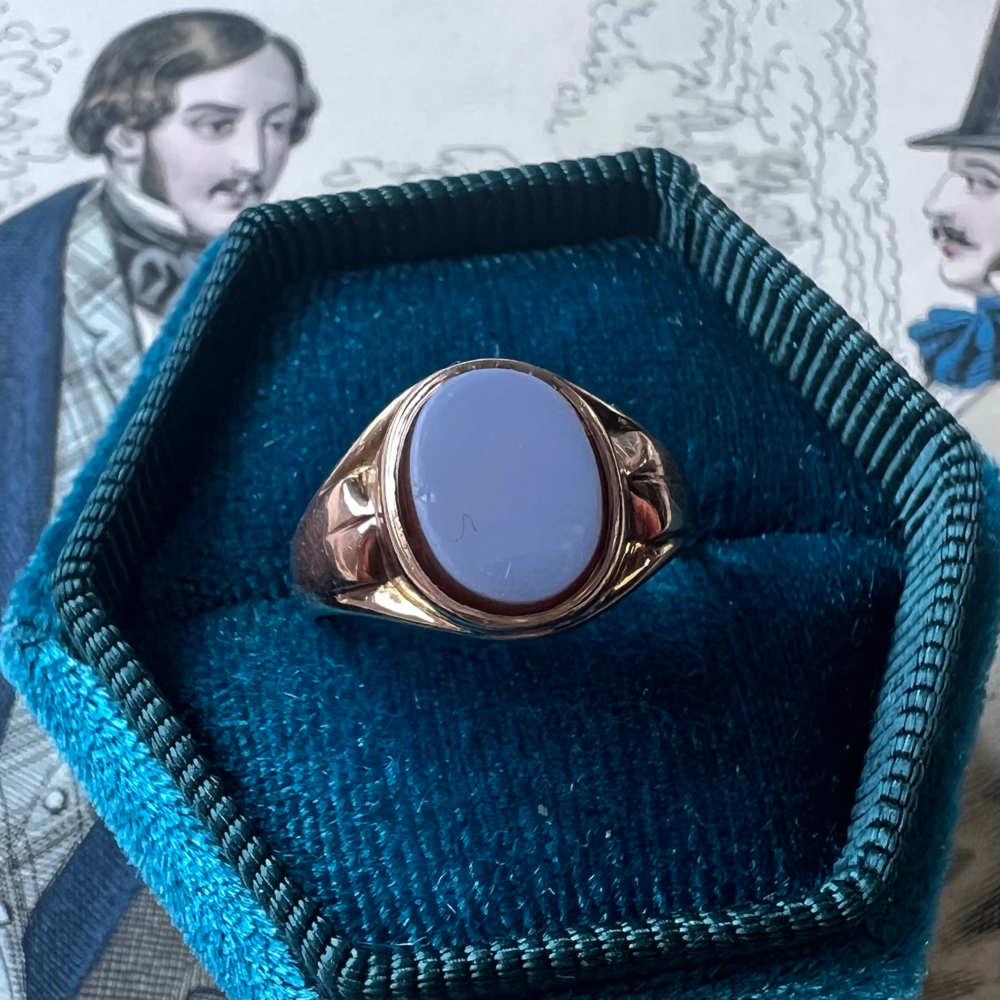 Antique ring with sword-point shoulders. The front features an unengraved oval-cut chalcedony. Inside, the hallmarks of the 375 (9 carat) gold content are partially visible and a letter "o" can be seen in a shield dating back to around 1910.