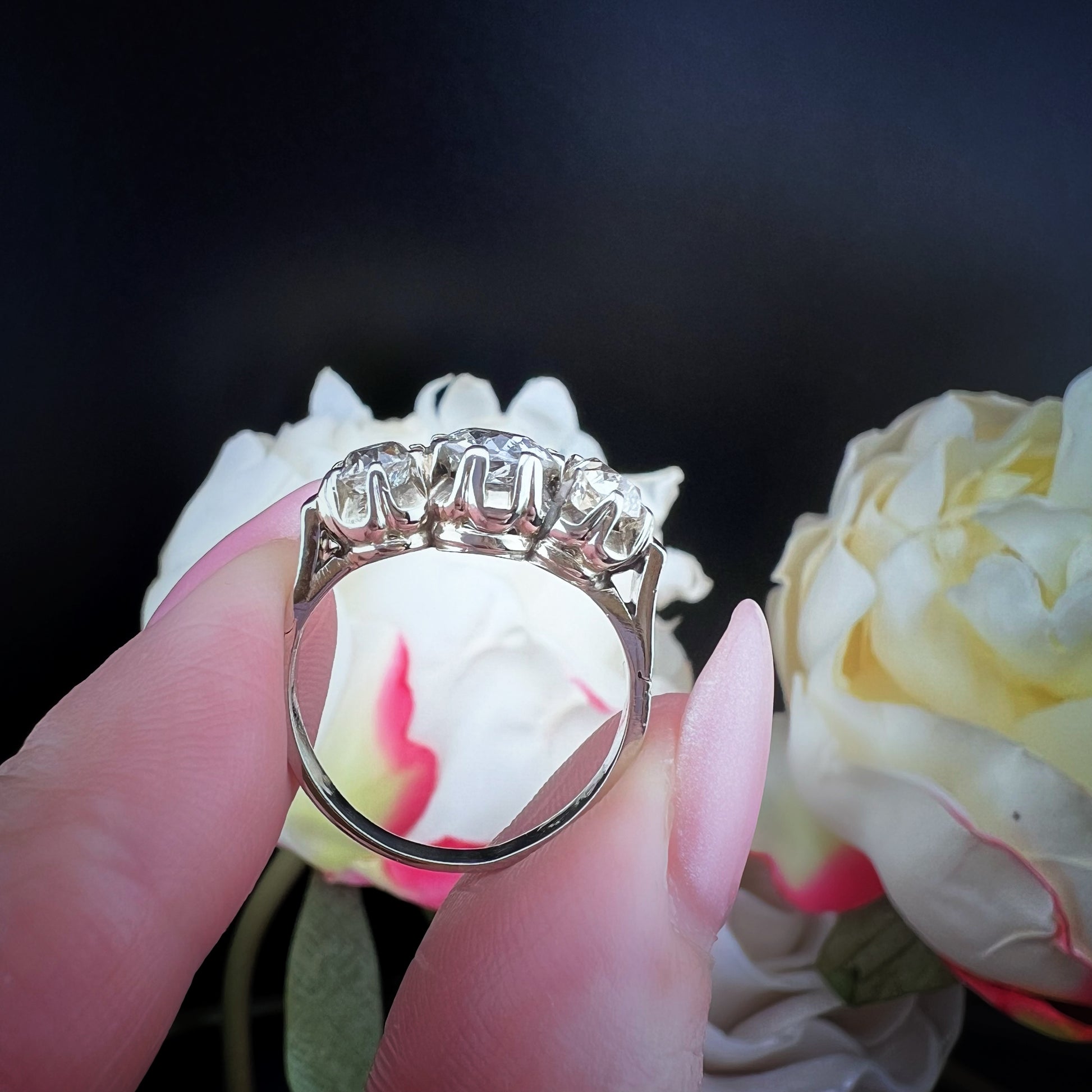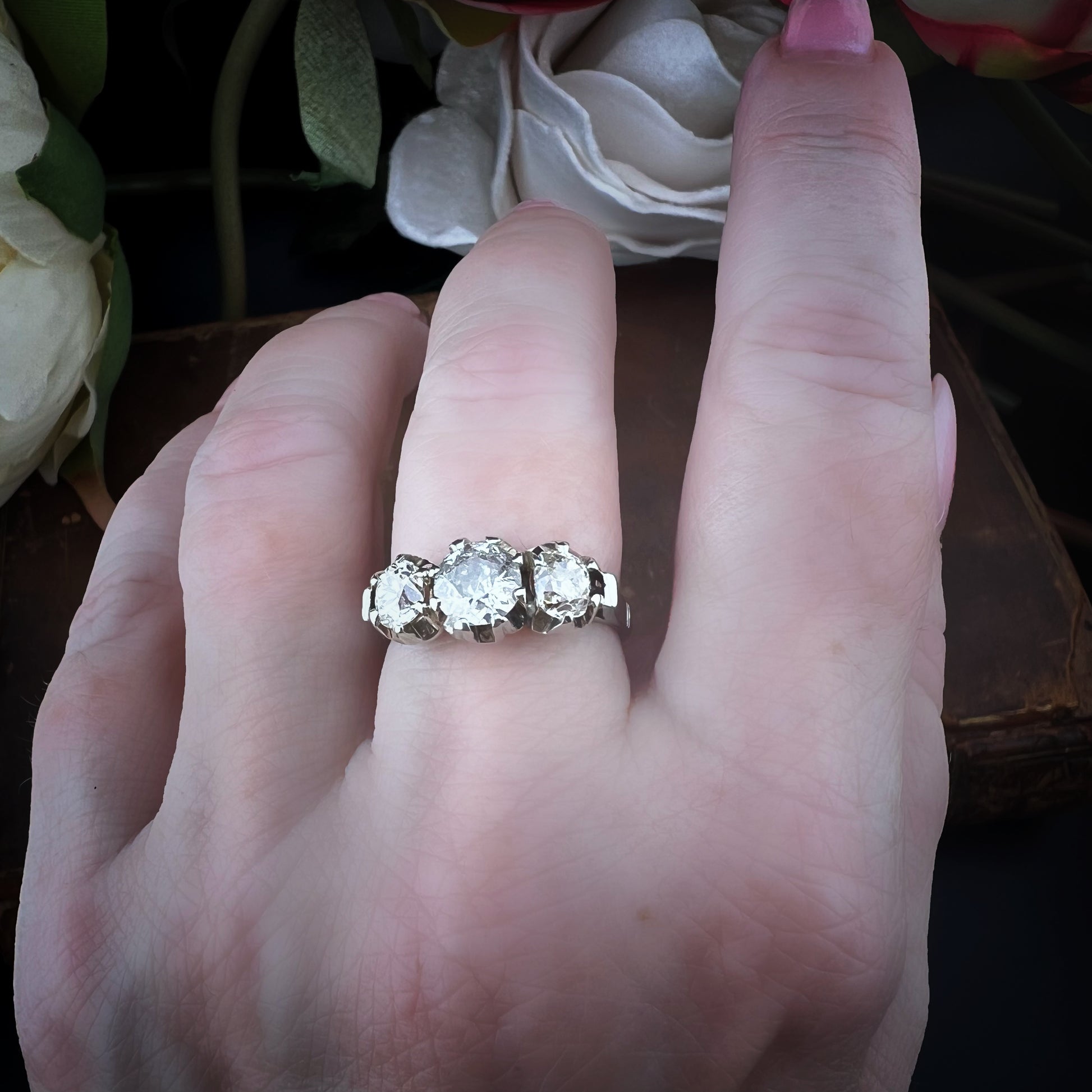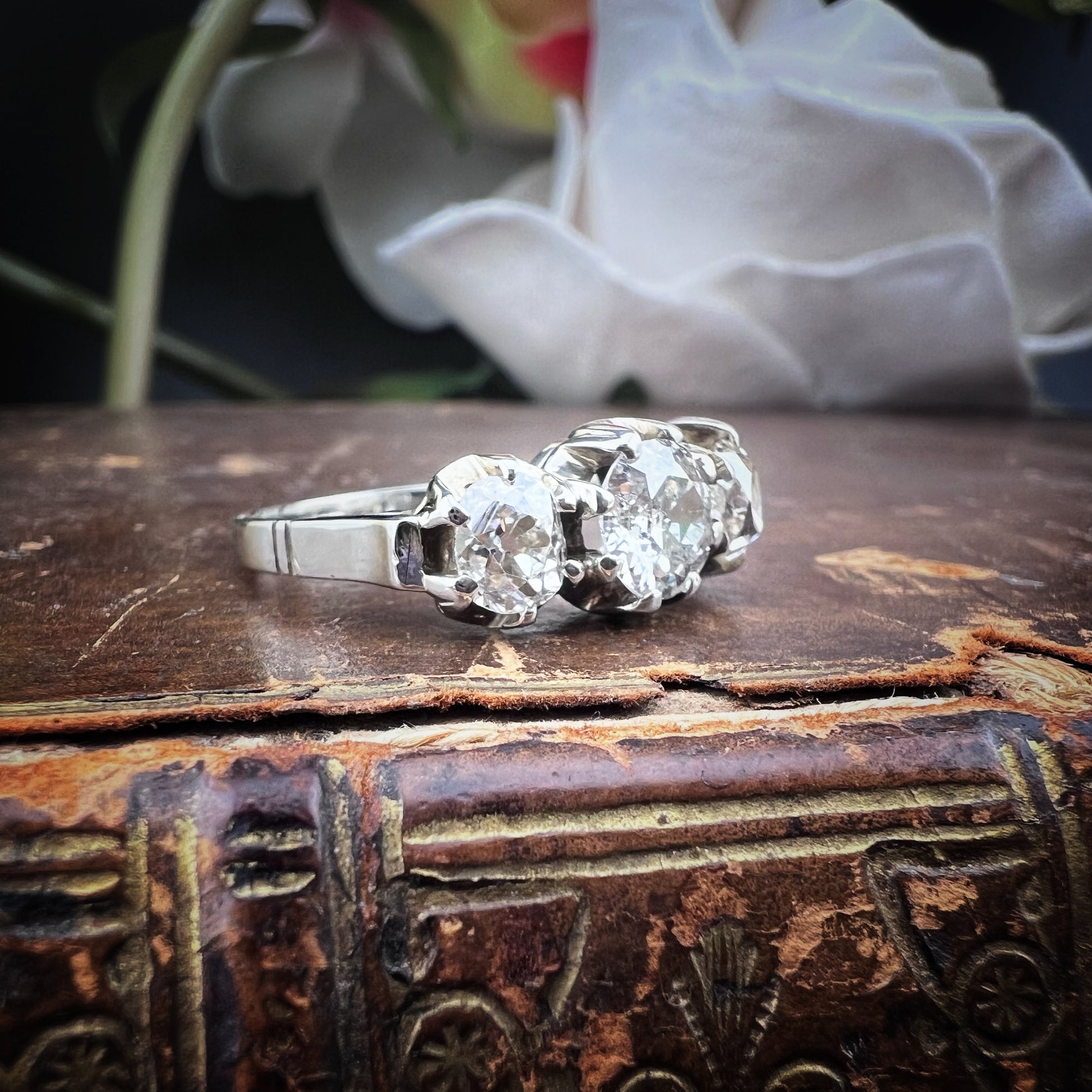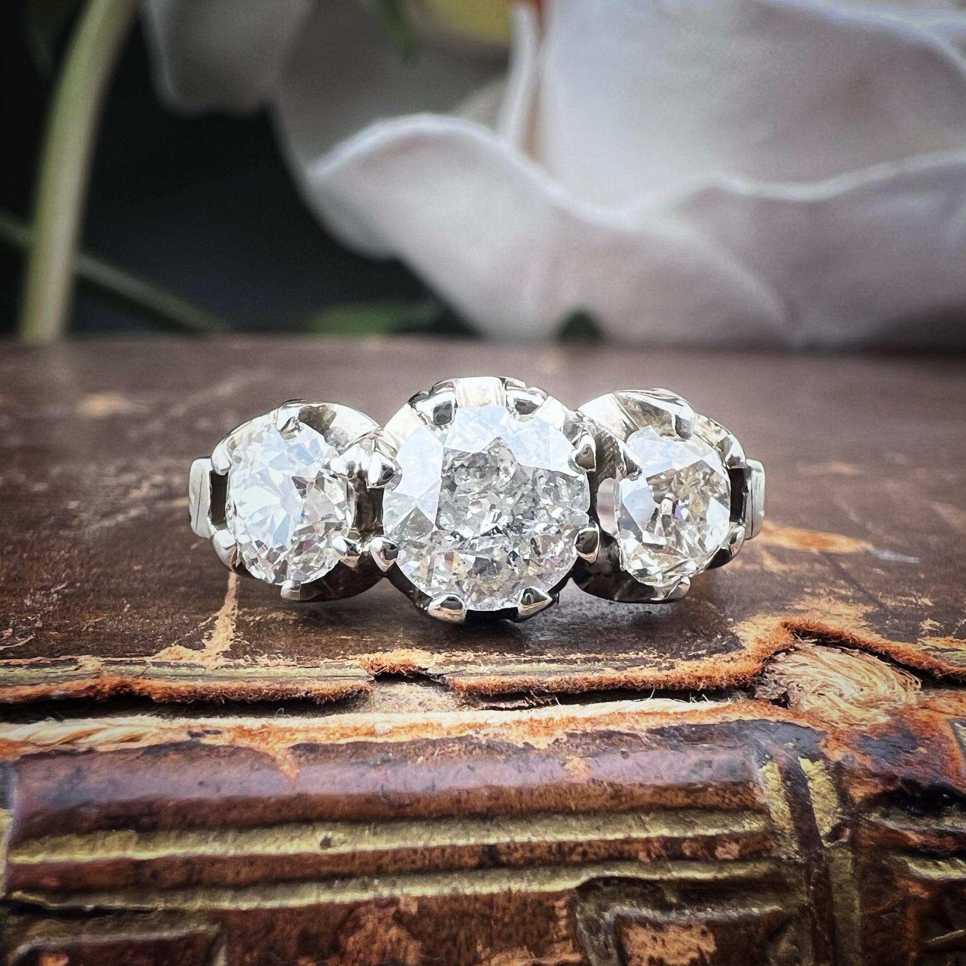Antique Trilogy Ring with Old Mine Cut Diamonds – 18kt White Gold Setting