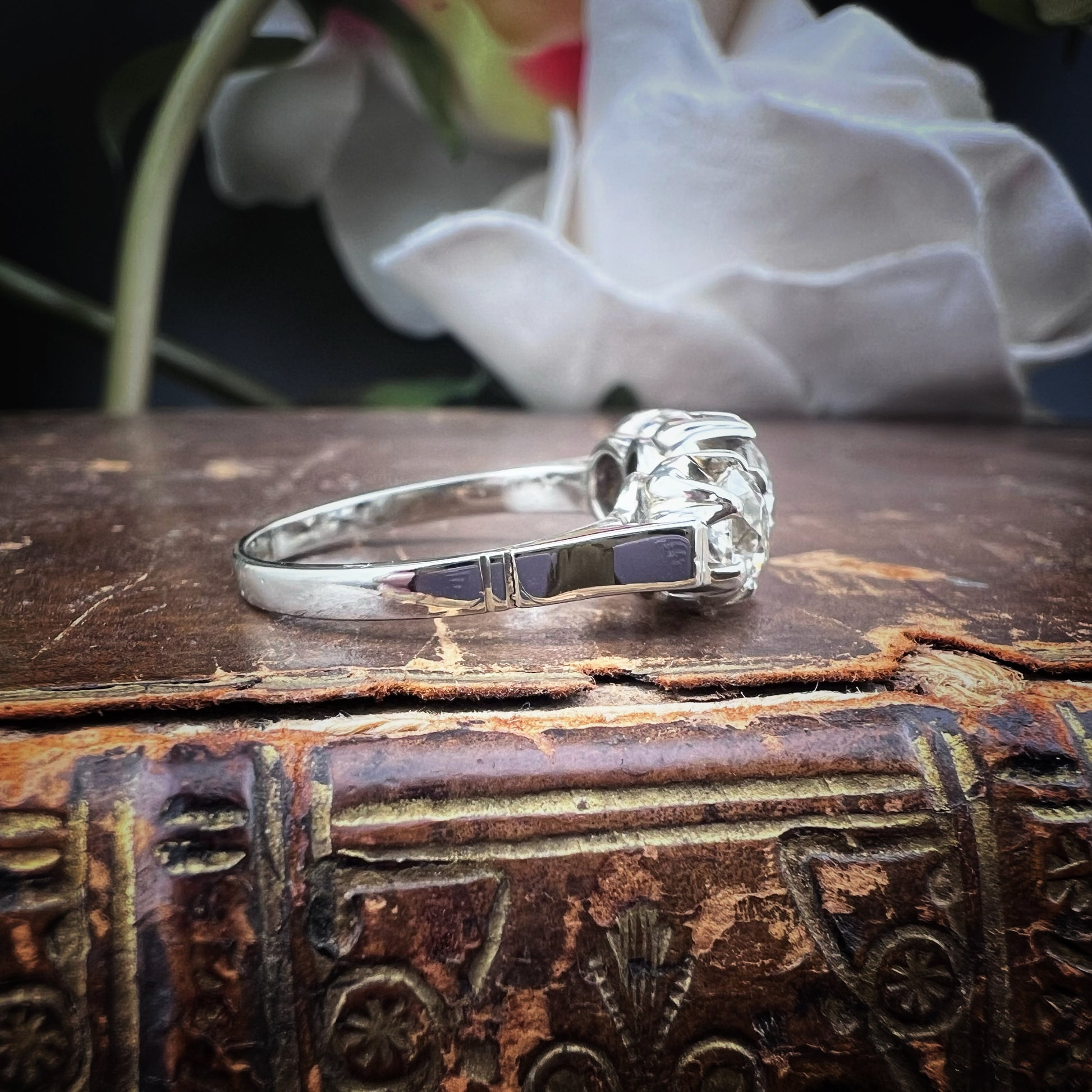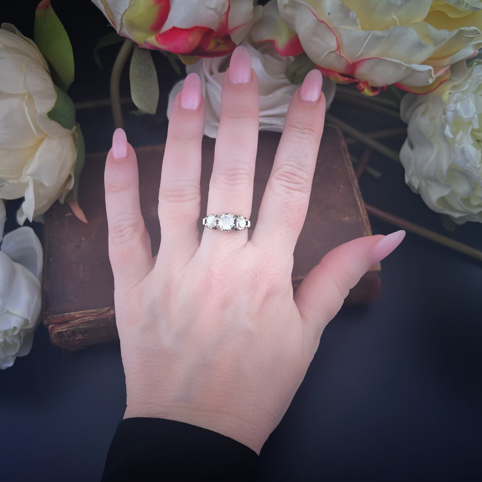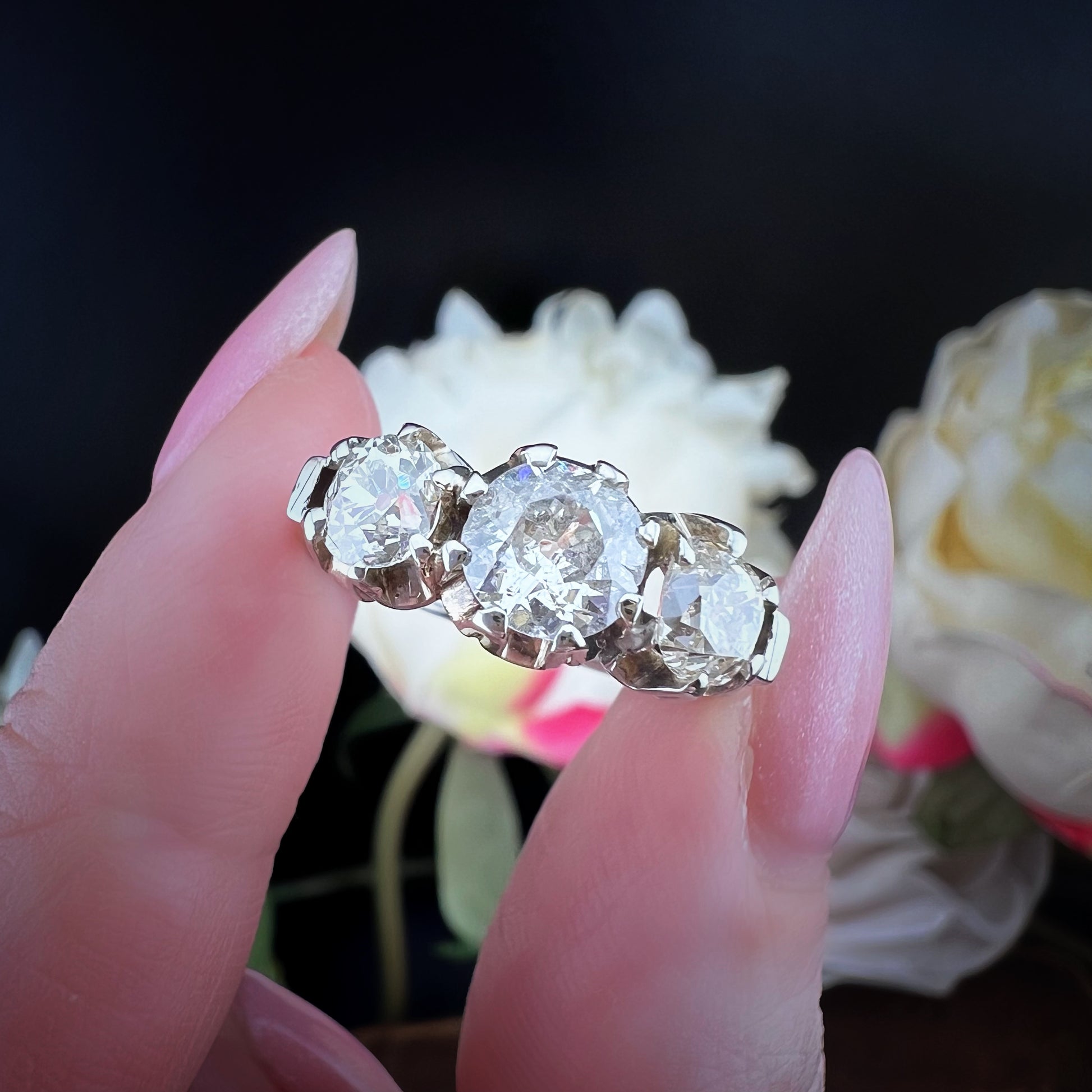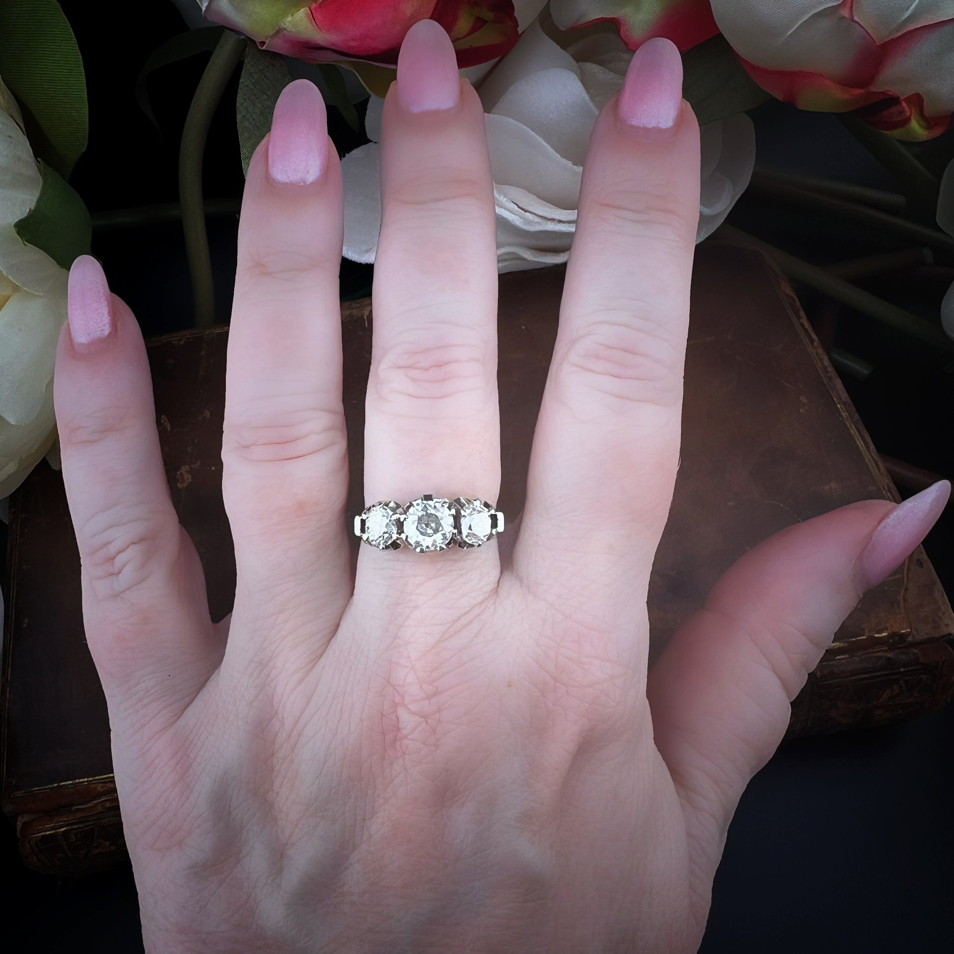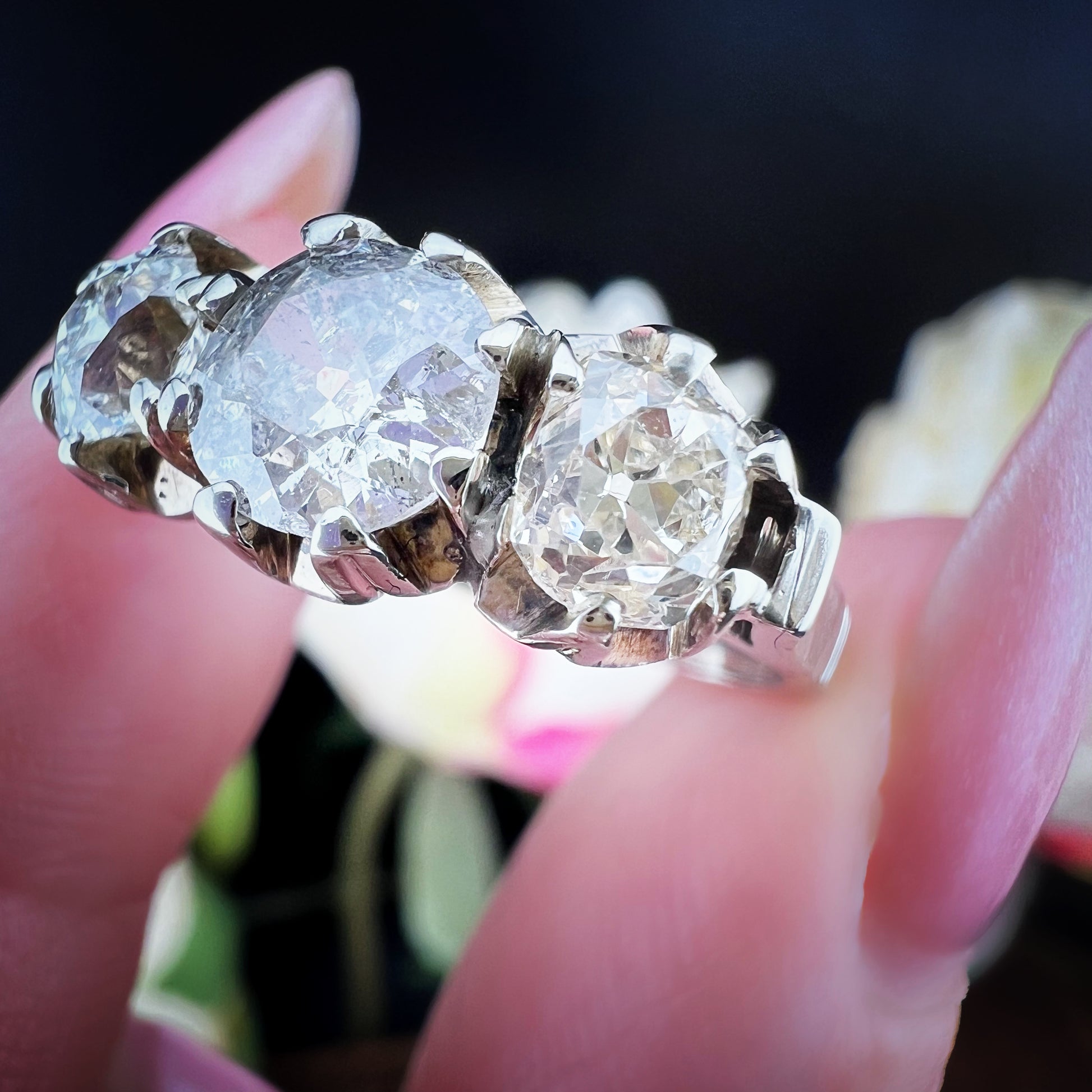 Antique Trilogy Ring with Old Mine Cut Diamonds – 18kt White Gold Setting