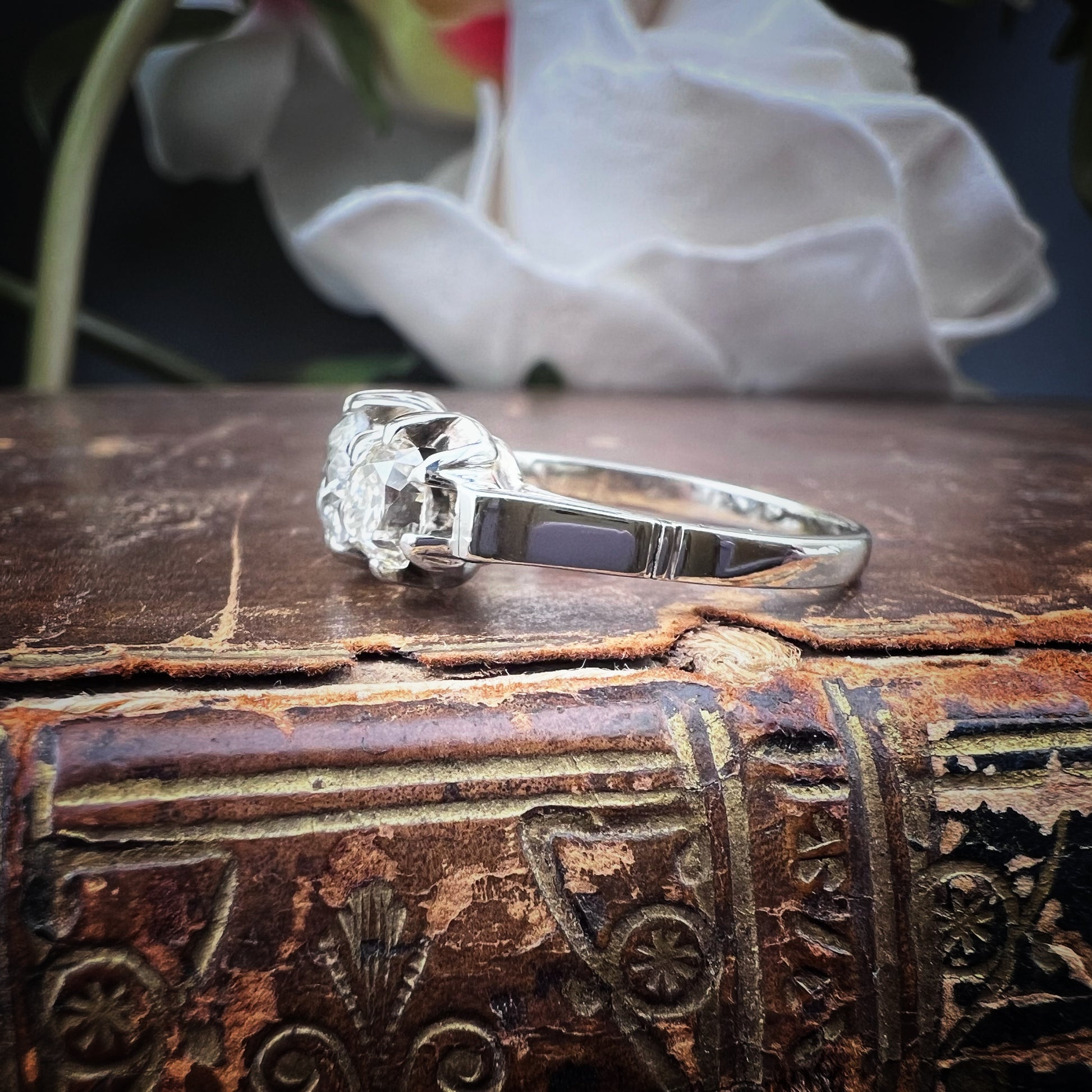 At the center shines a cool-toned diamond, close to color I on the modern scale, while the sides, slightly warmer, are close to color K. A slight chromatic difference that emphasizes the naturalness and authenticity of the antique gems, making this ring unique and unrepeatable.