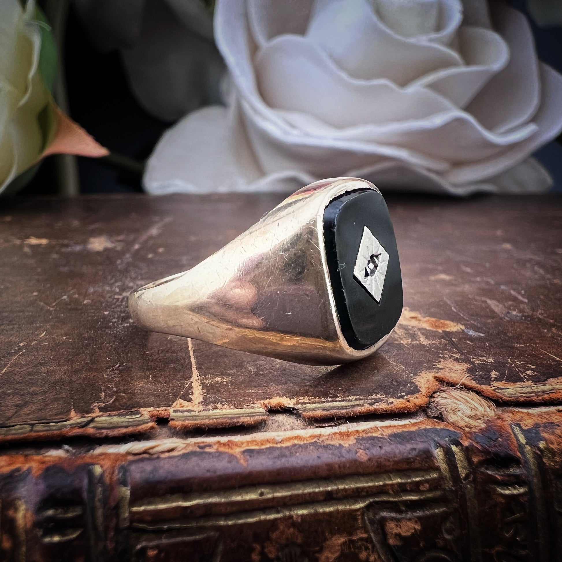 The elegant and refined setting is in 9-carat (375) yellow gold, housing a precisely set slab of black onyx. At the centre of the onyx is a geometric gold plaque enclosing a small brilliant diamond, used as a highlight.