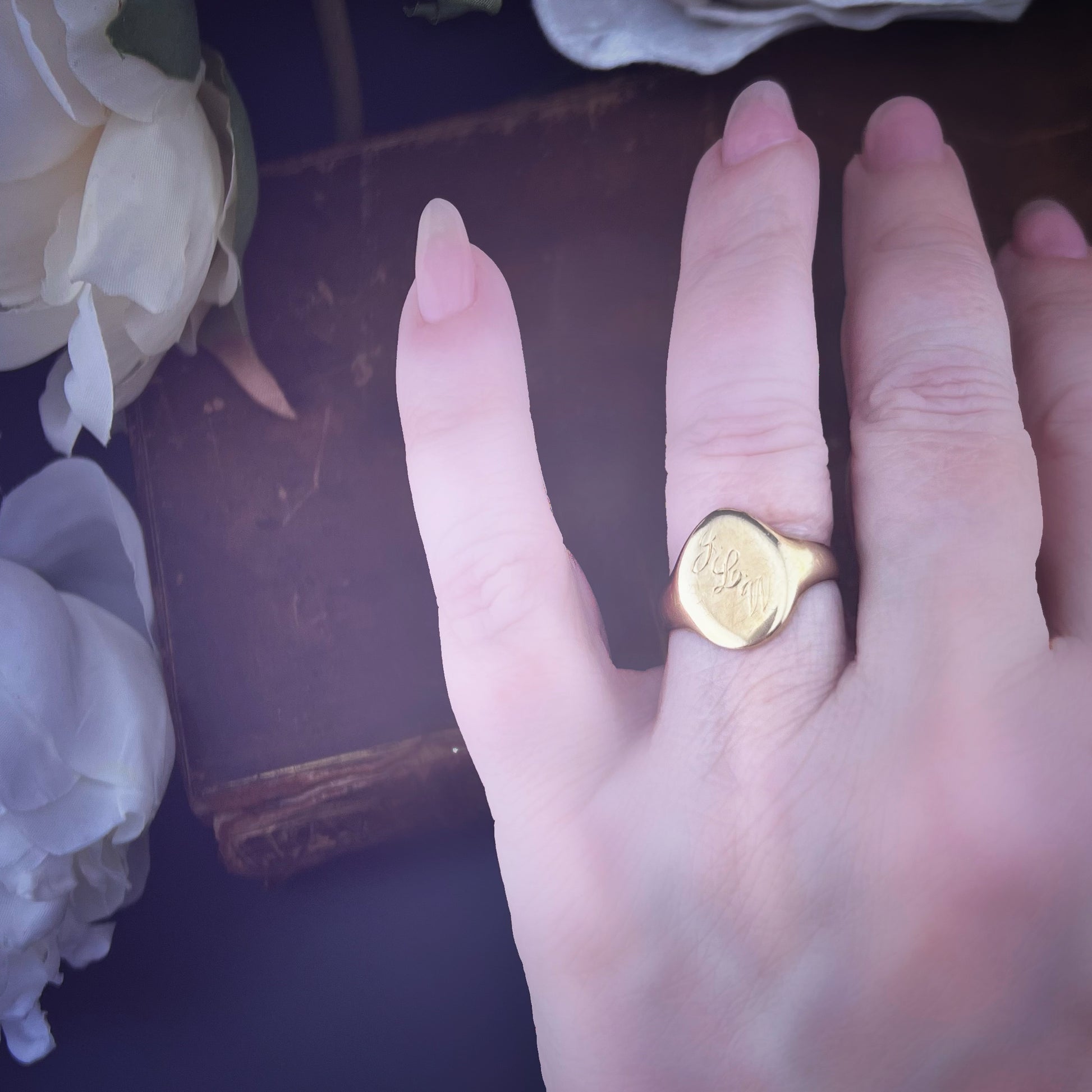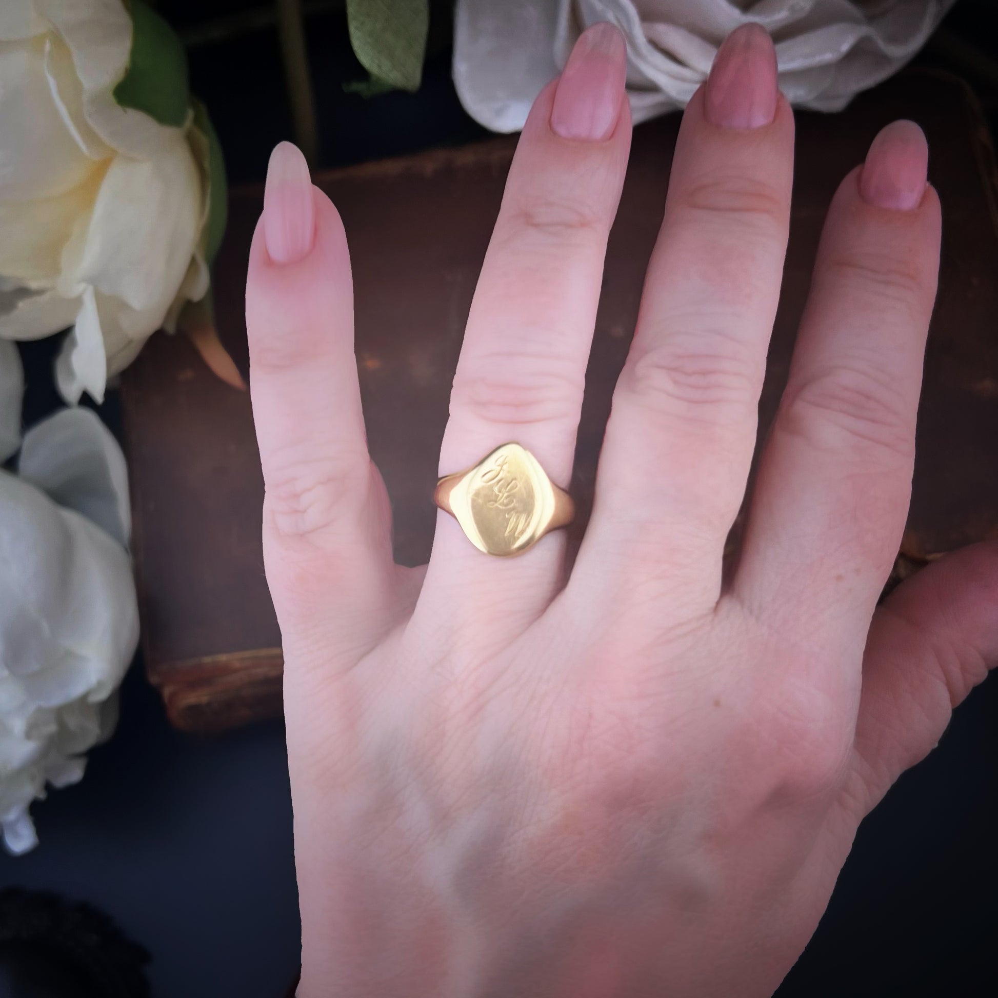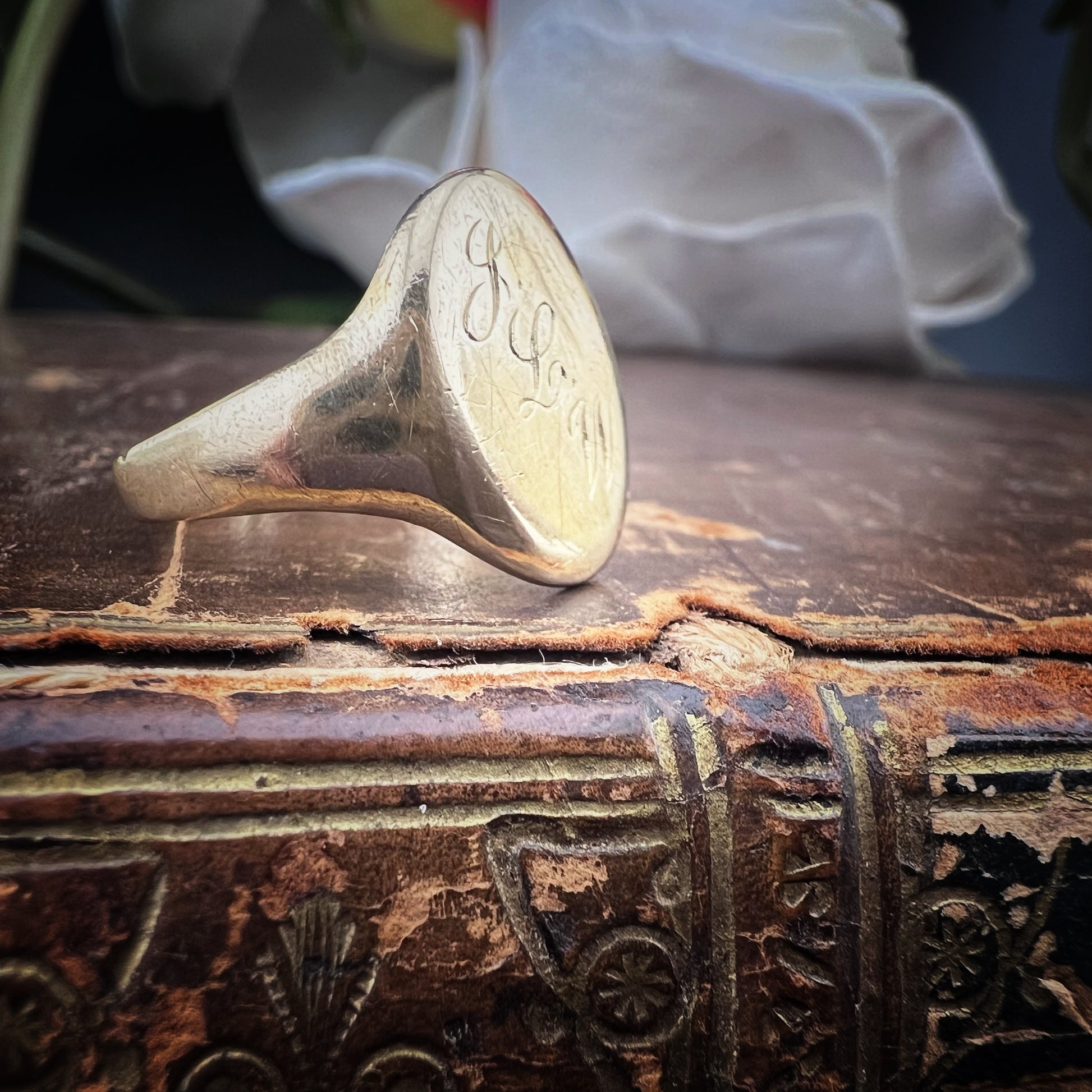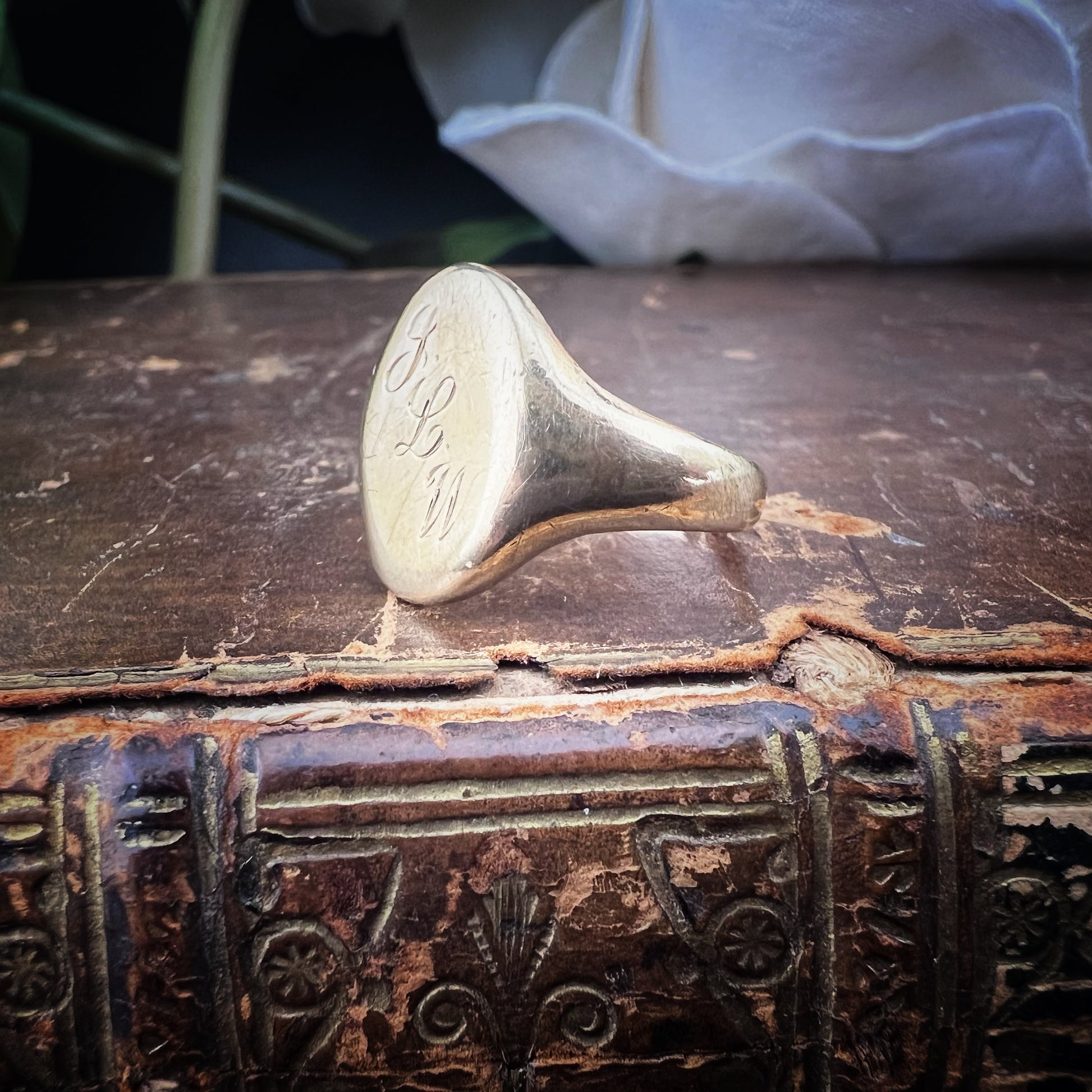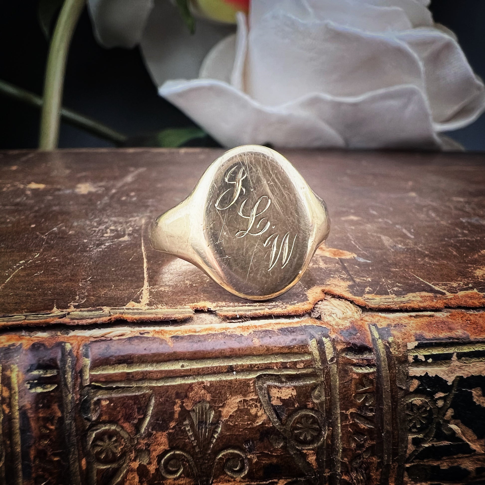 An authentic vintage signet ring, crafted from 9-karat gold, with the timeless elegance of hand-engraved jewelry. On the front, the cushion-shaped oval is finely engraved with the initials "ILW," a testament to an era when details spoke volumes about style and identity.