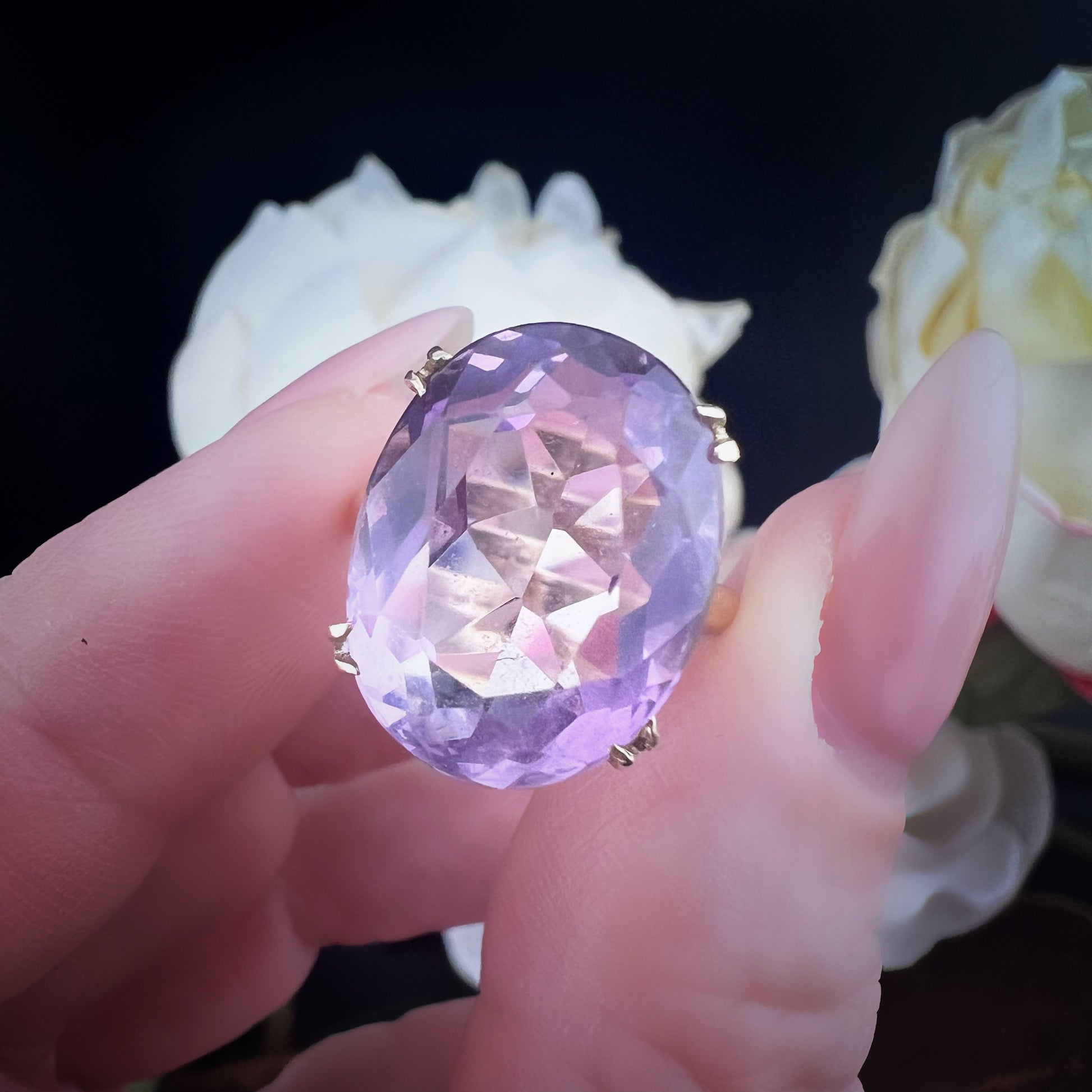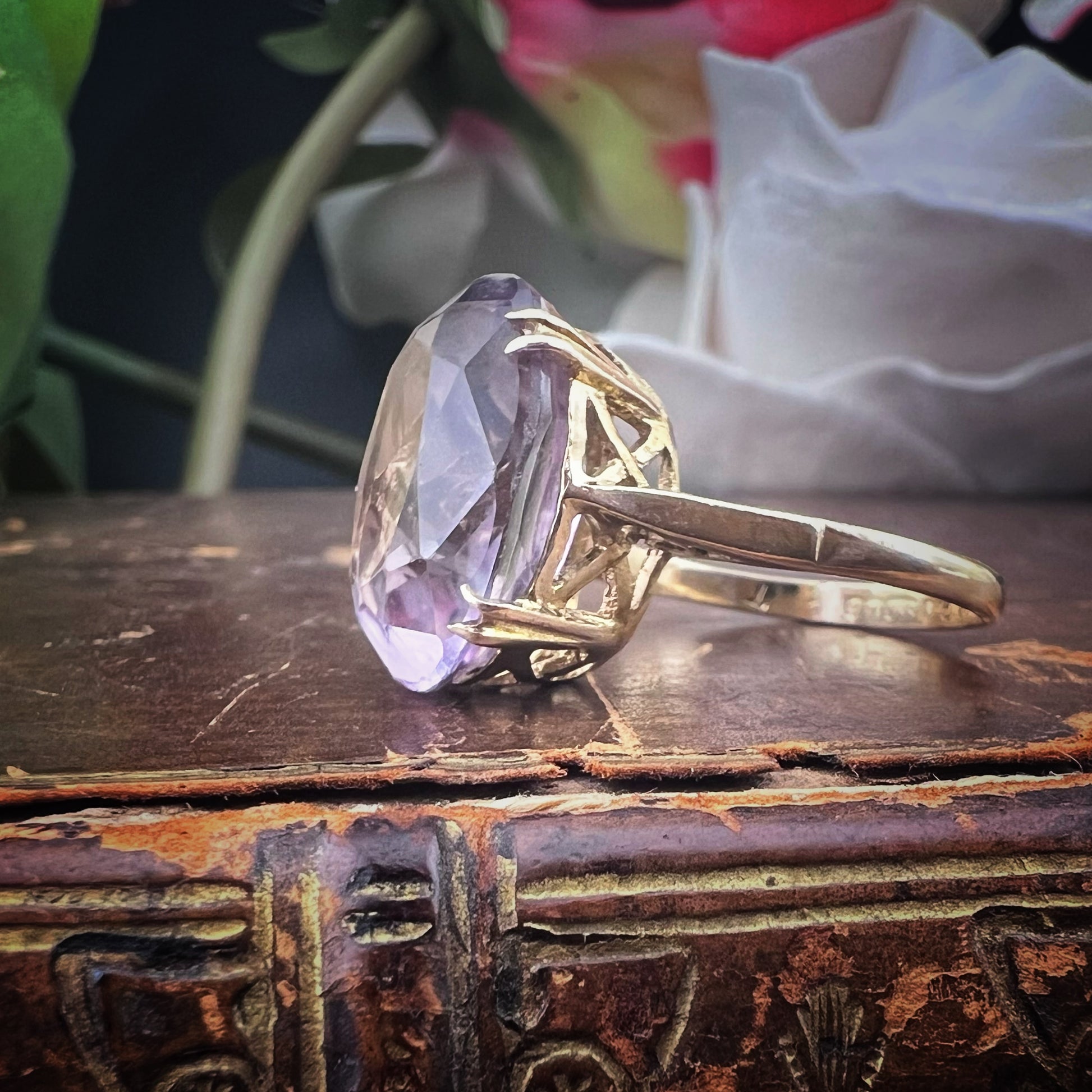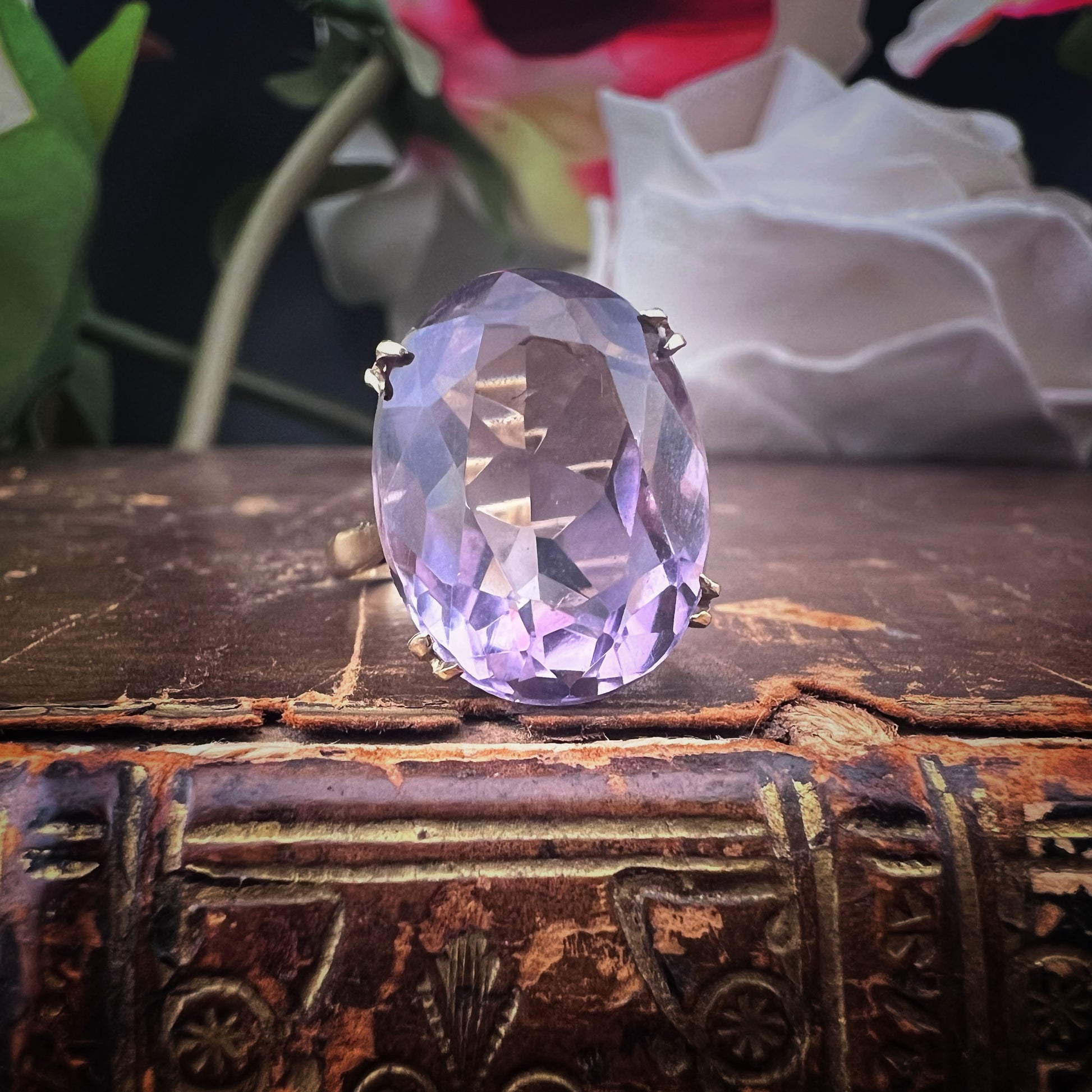 Elegant and timelessly alluring, this vintage cocktail ring features a natural, faceted oval-cut amethyst with a clear, luminous hue. The generously sized stone is set with four double prongs, enhancing its beauty with understated refinement.