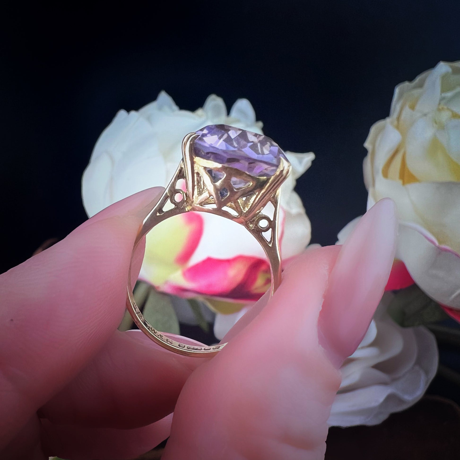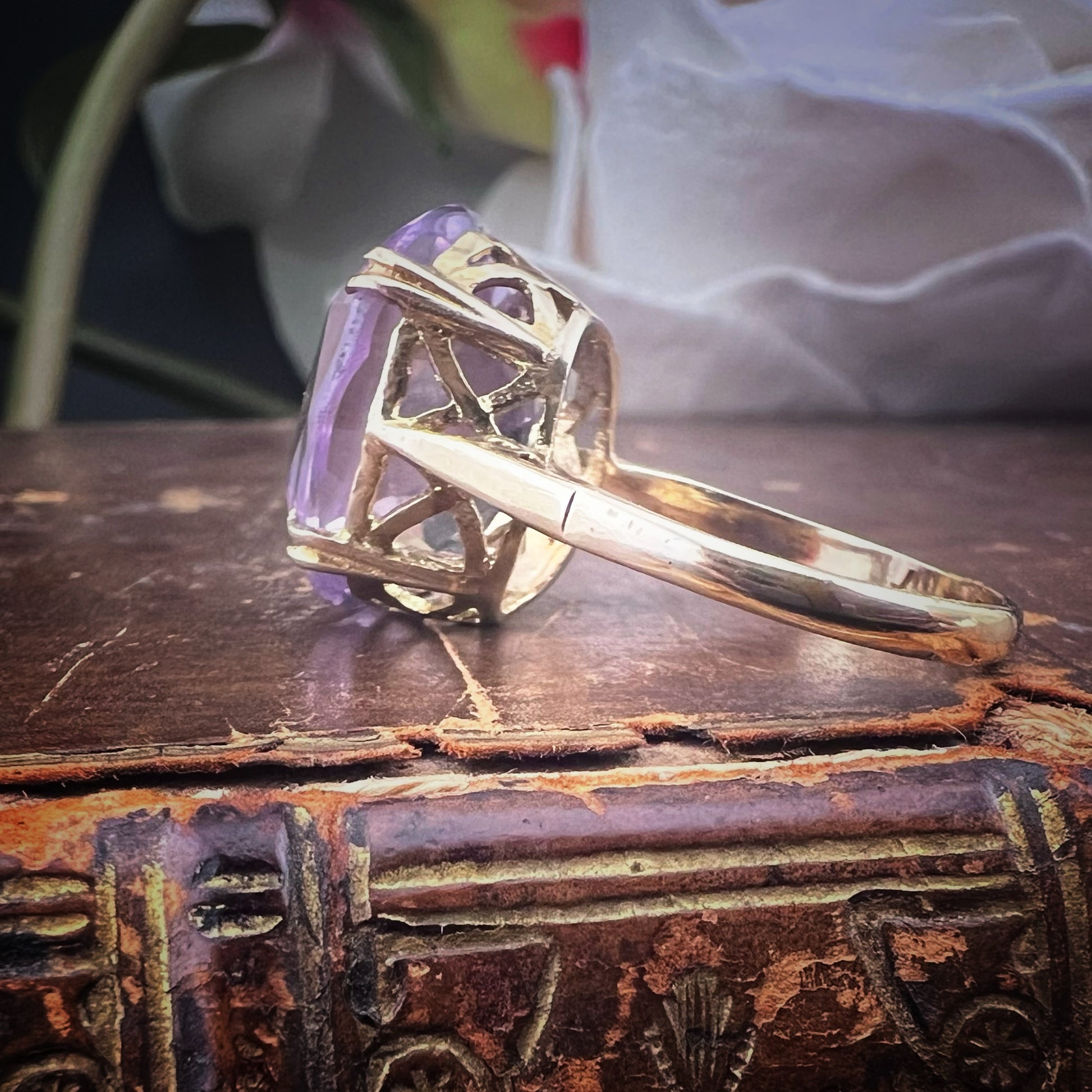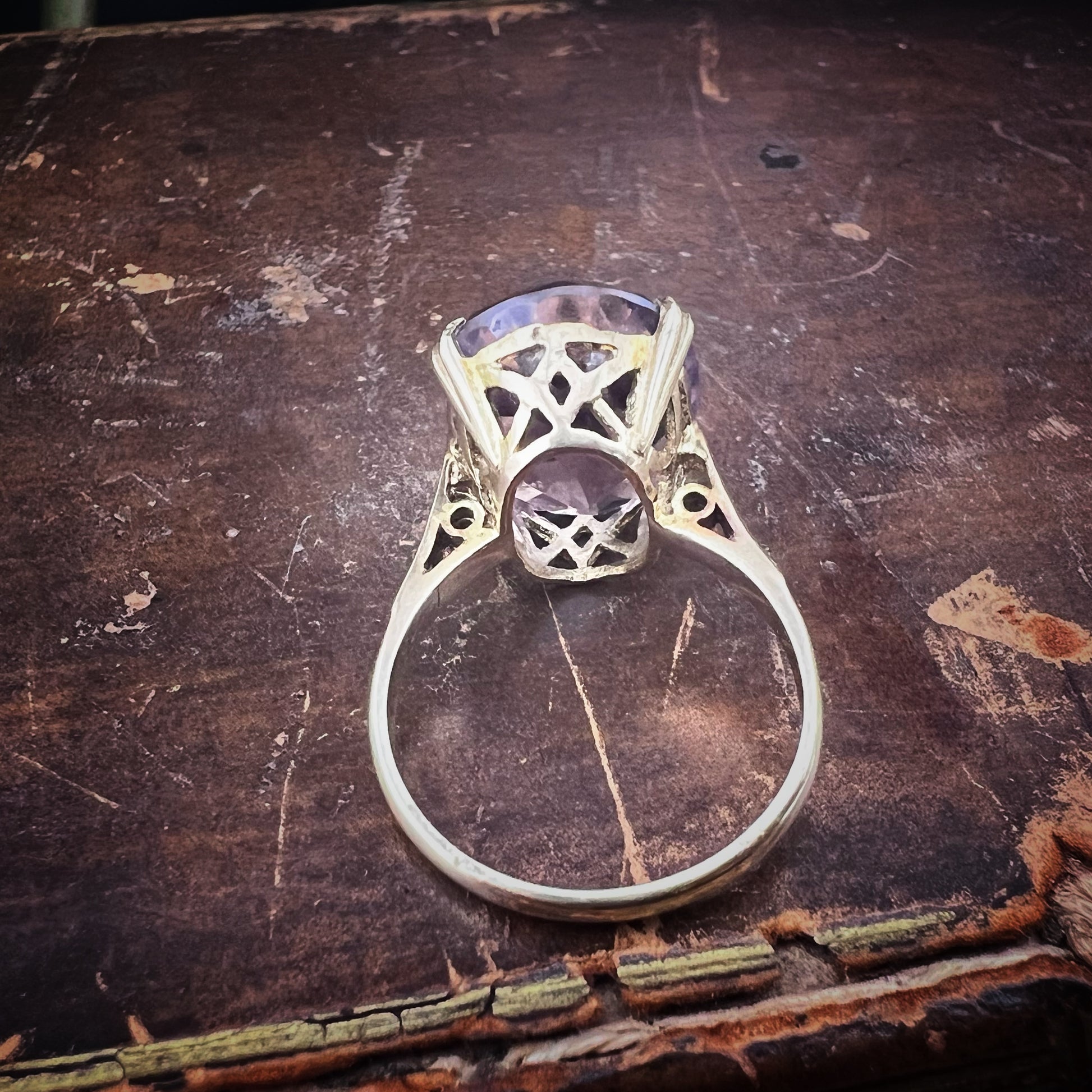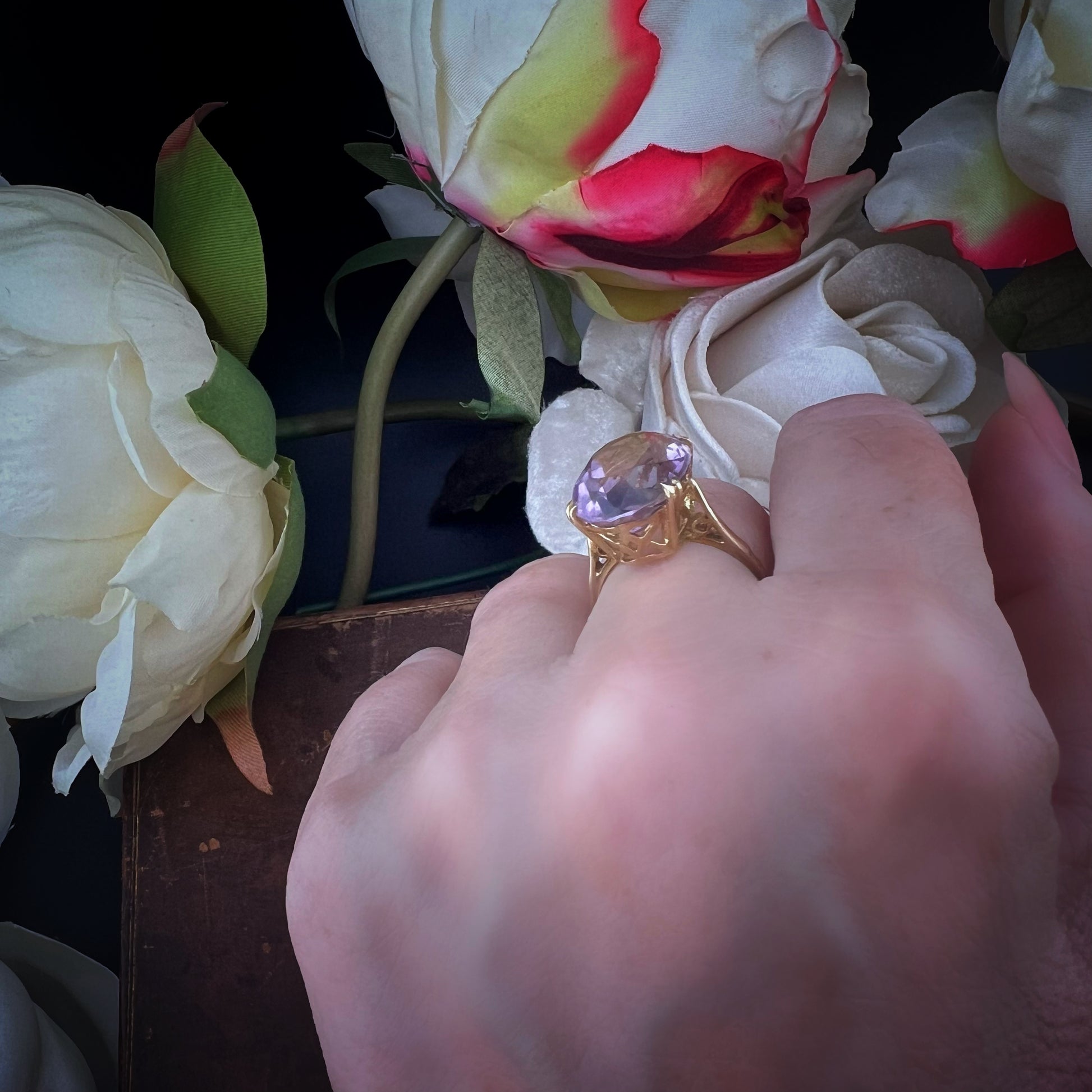 Elegant and timelessly alluring, this vintage cocktail ring features a natural, faceted oval-cut amethyst with a clear, luminous hue. The generously sized stone is set with four double prongs, enhancing its beauty with understated refinement.