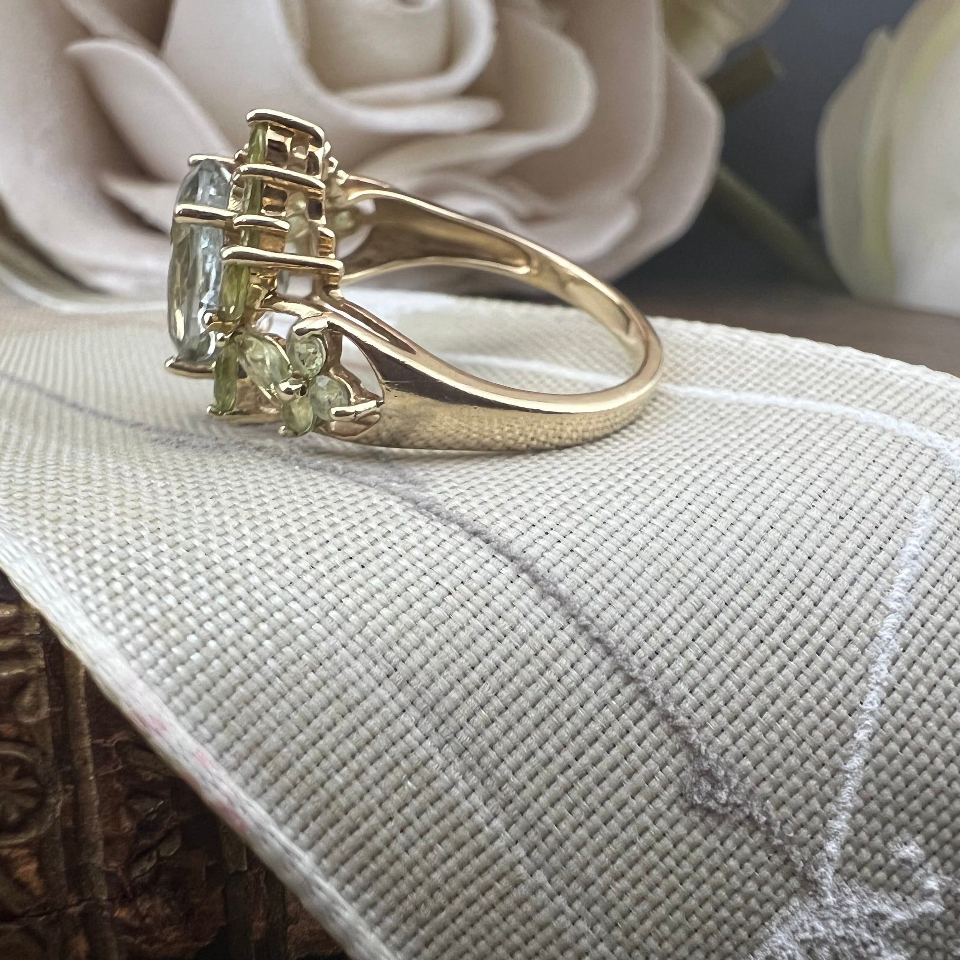 A ring that combines the delicacy of aquamarine with the vitality of peridot, unusual in design and with a strong character, perfect for those seeking a vintage jewel that tells a story of timeless elegance.