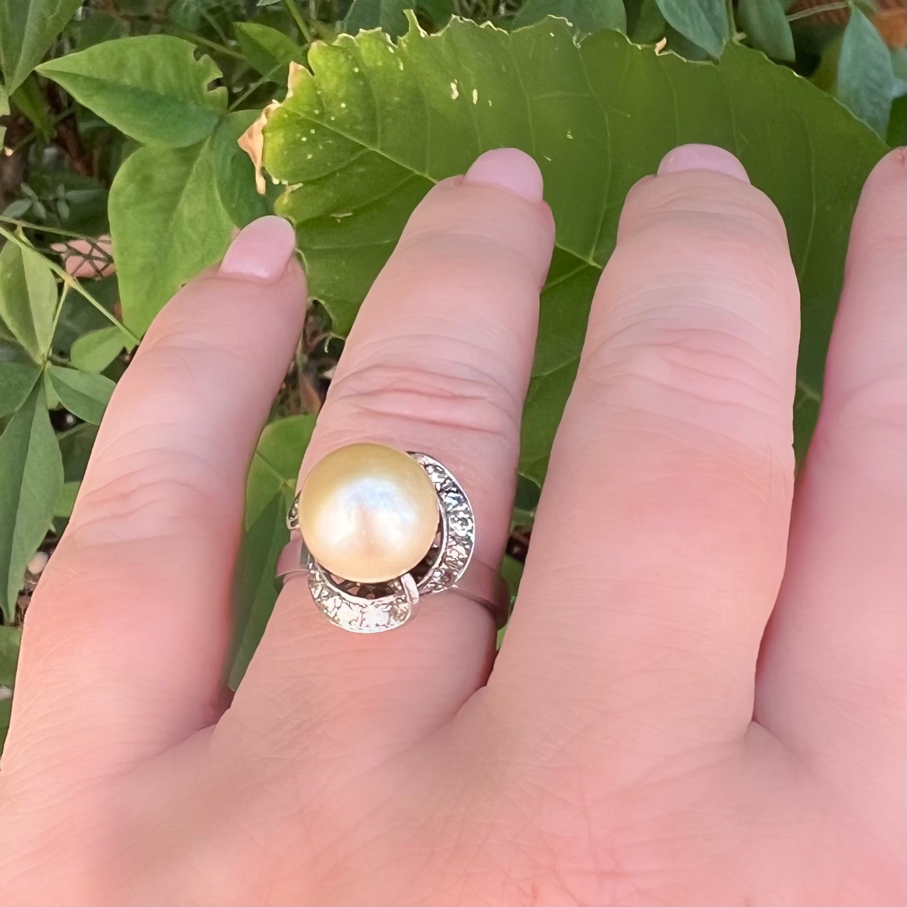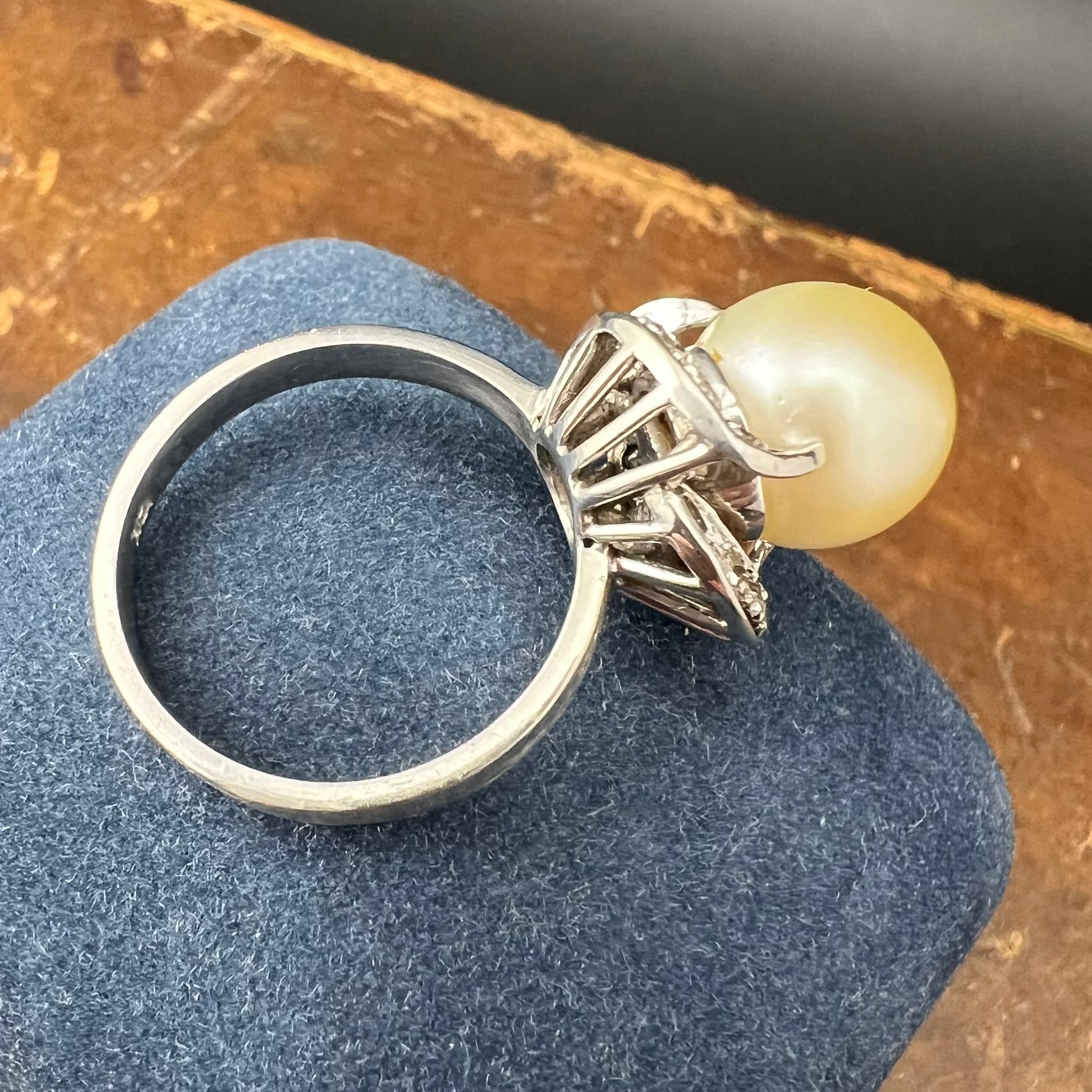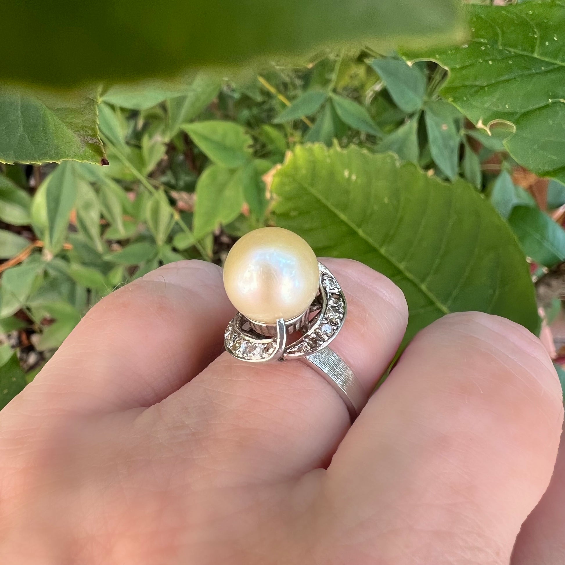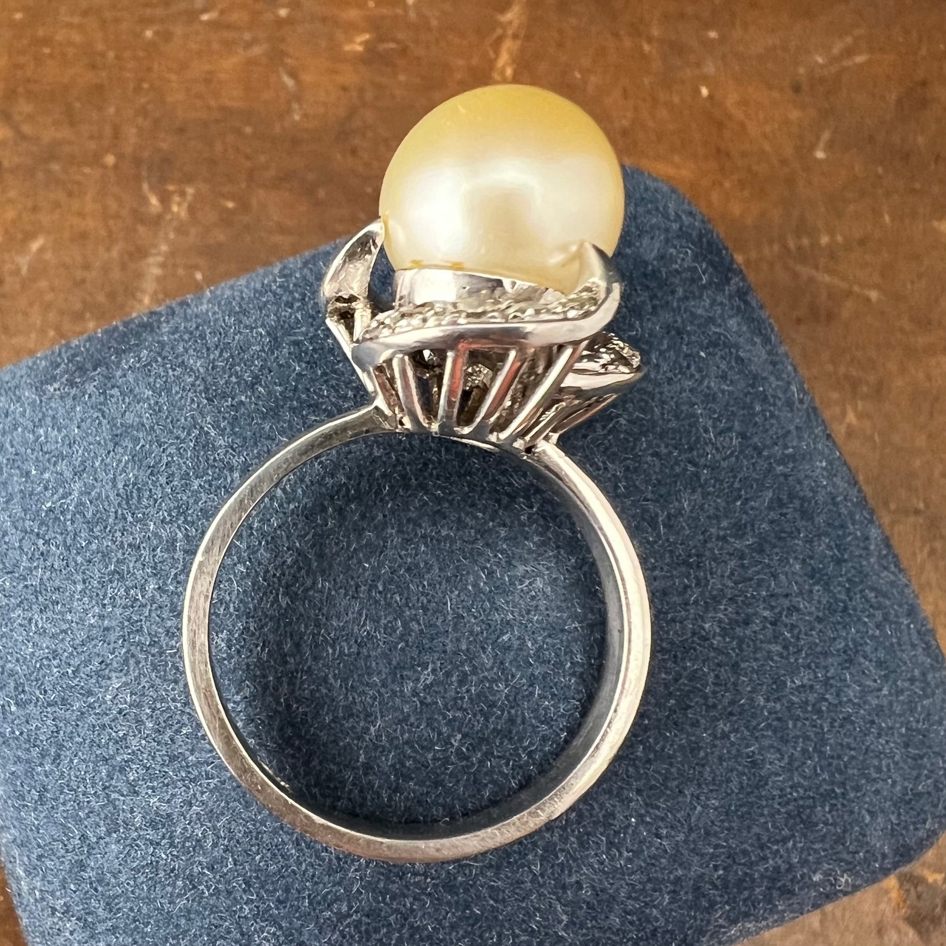 This ring is a vintage piece of jewelry from the 1960s, crafted from 18-karat white gold and featuring an elegant and refined design. The ring's main feature is a natural cream-colored cultured pearl measuring 11 mm in diameter. The pearl is set at the center of the ring's head, which measures 14.5 mm in diameter and 15.5 mm high. The head of the ring is further embellished with three helix elements, each set with 15 round-cut diamonds, for an estimated total of approximately 0.30 carats. The ring weighs 5.68 grams.