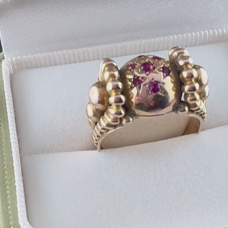 The central hemisphere is studded with 7 natural round-cut rubies.