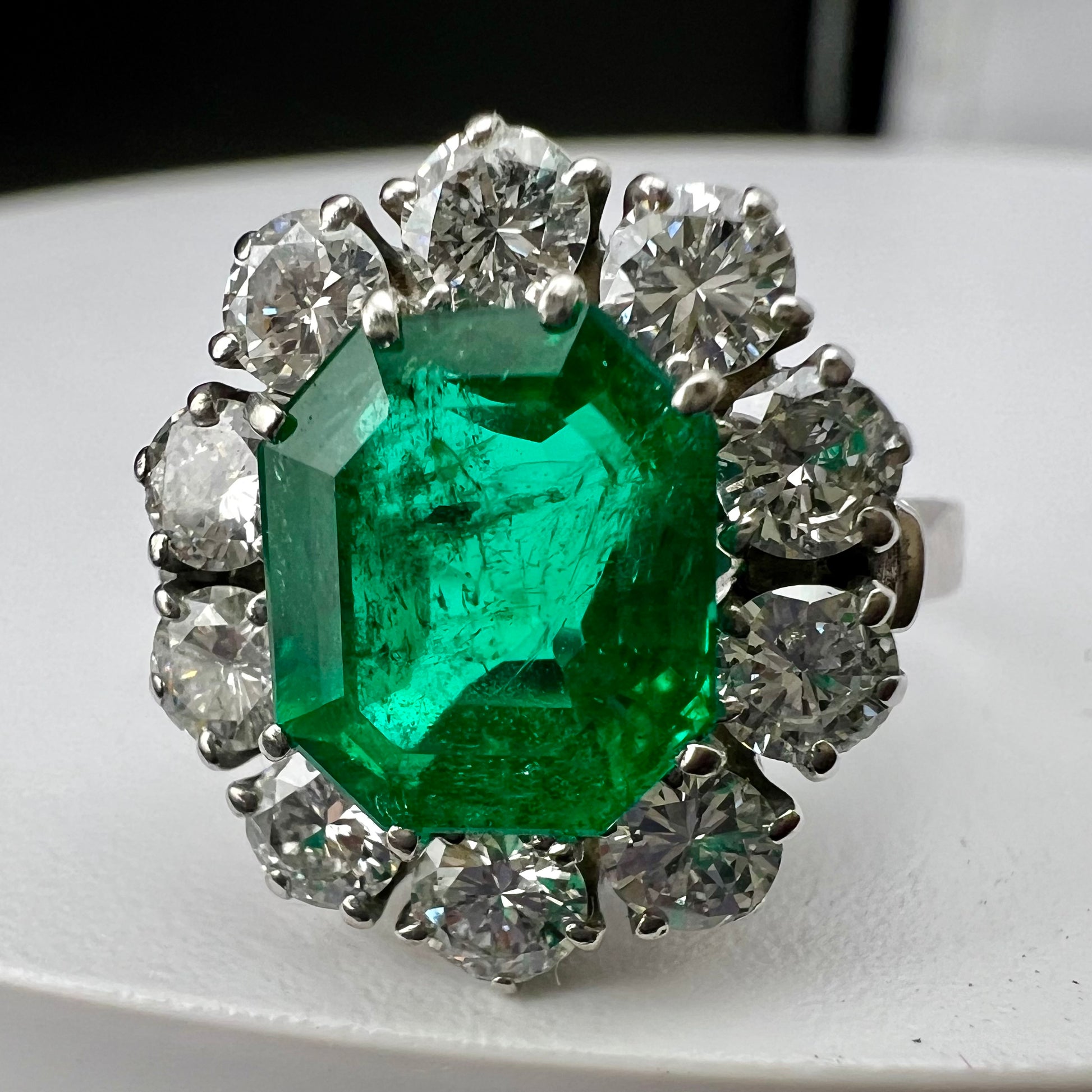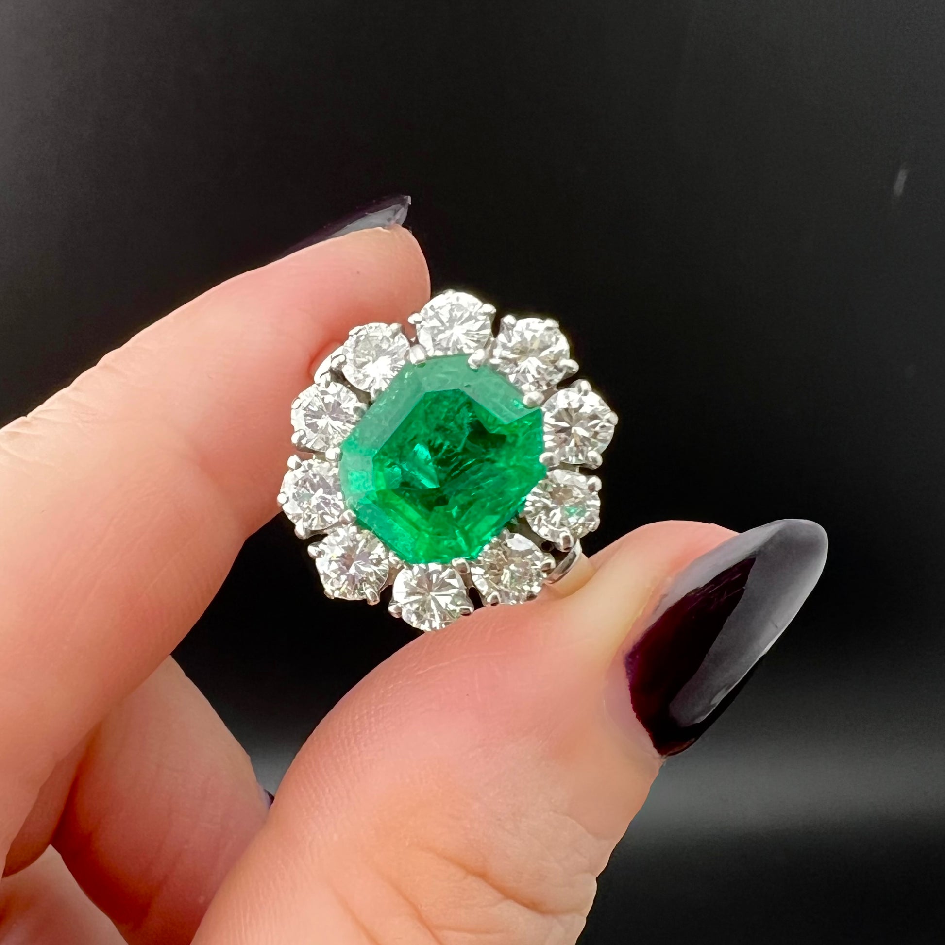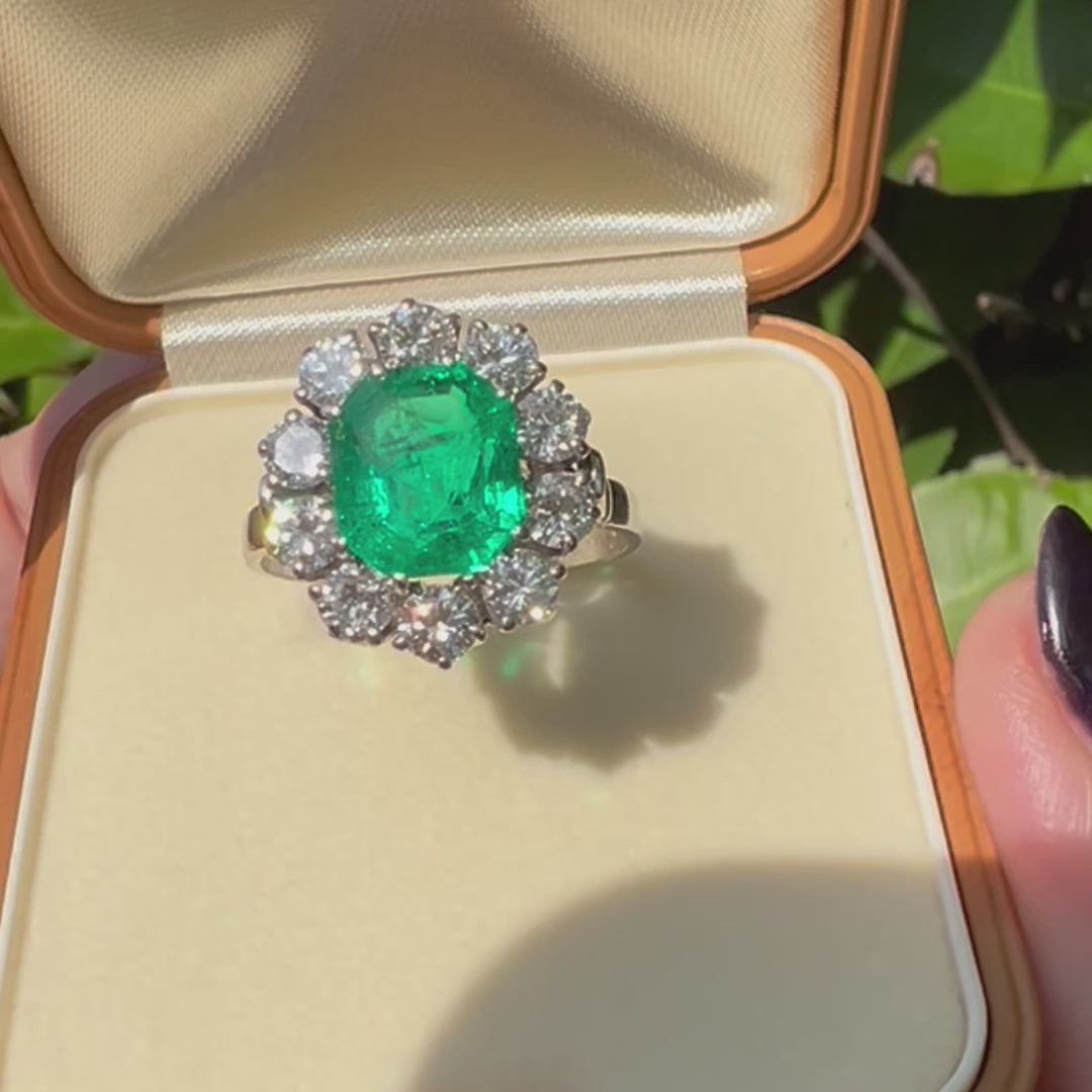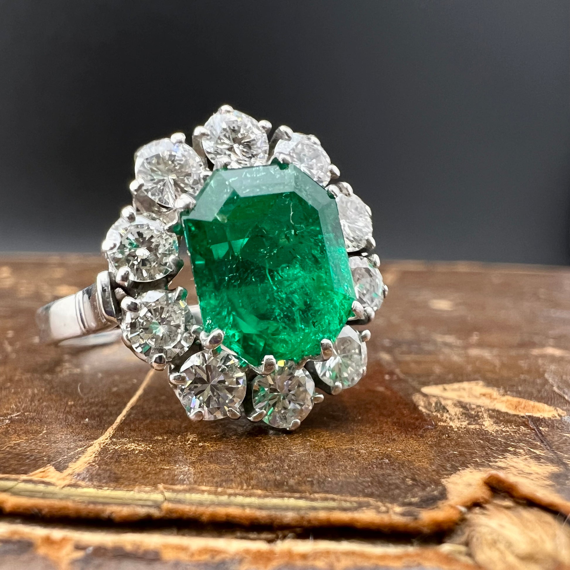 A stunning antique daisy ring, embellished with a central emerald and surrounded by brilliant diamonds. This natural Colombian emerald, exceptional in its rarity and beauty, was kept in a safe for decades and now shines in all its magnificence. This precious stone, never treated, represents a rarity we are no longer accustomed to seeing.