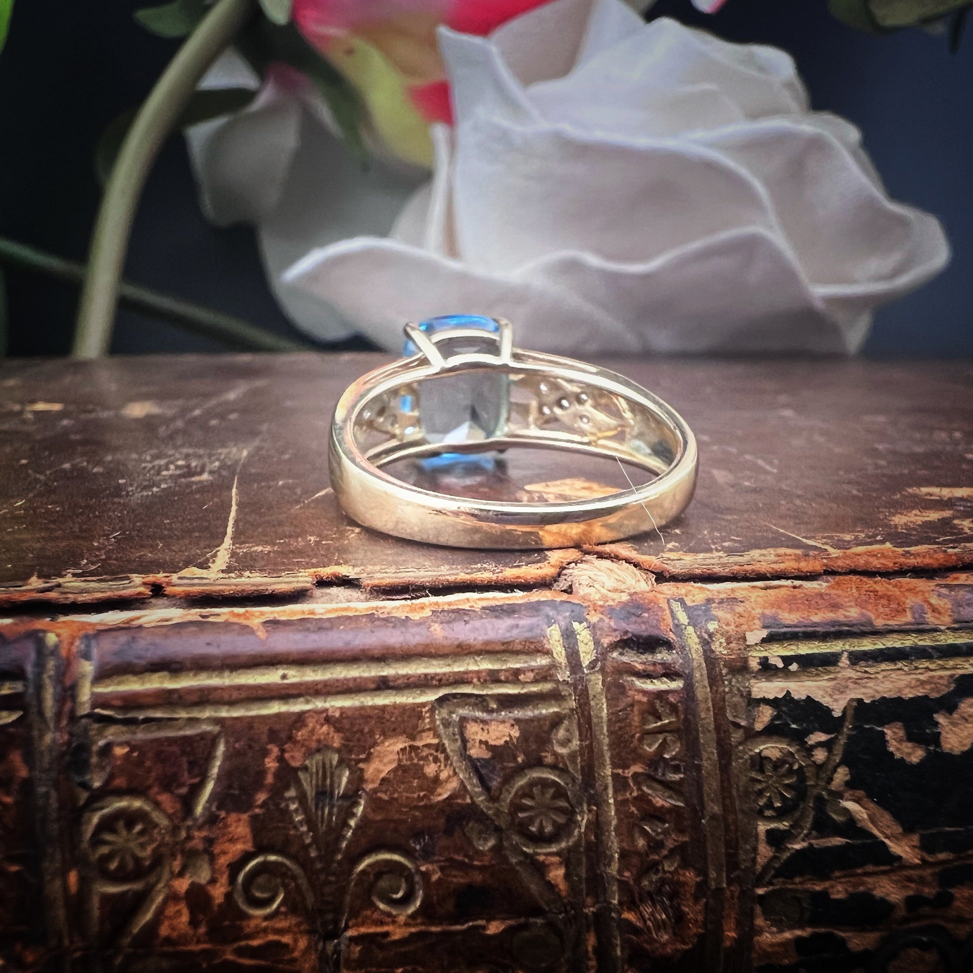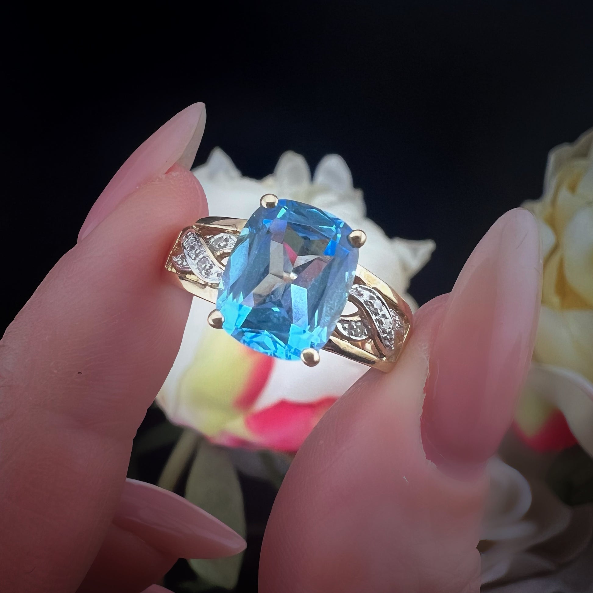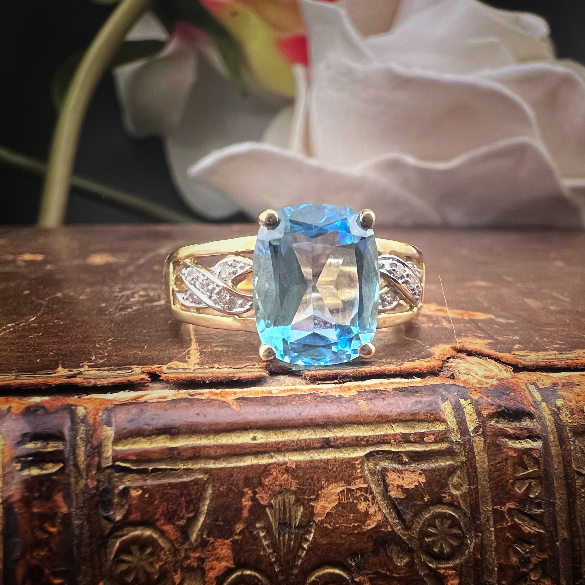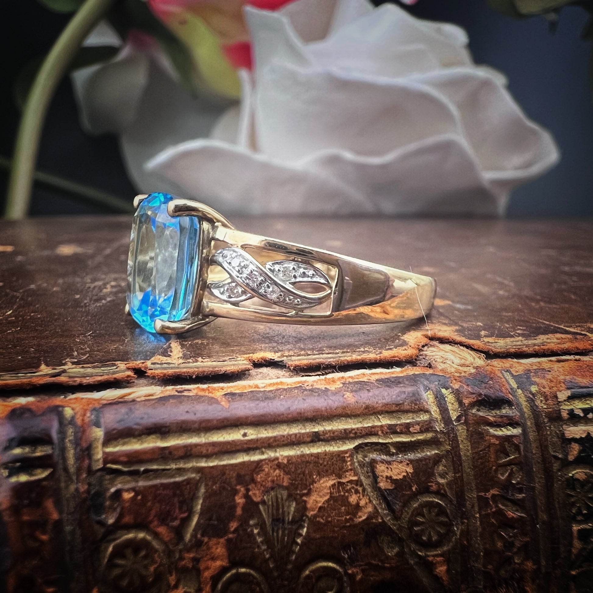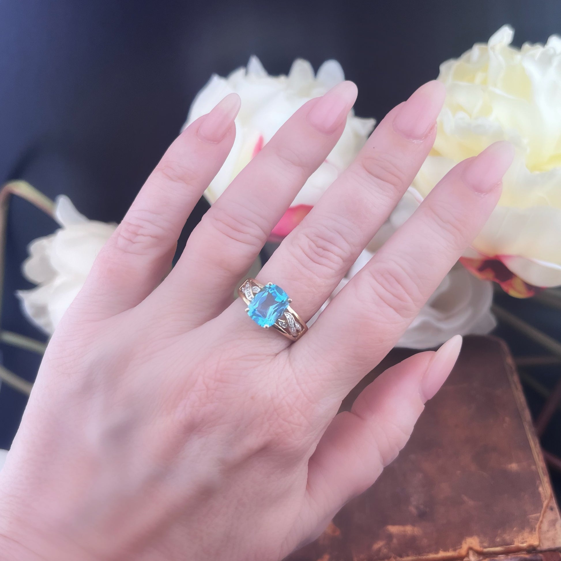 Because it combines the freshness of blue topaz with the preciousness of gold and diamonds. It's a ring that won't go unnoticed, capable of enhancing the wearer with discreet refinement. A well-preserved English vintage piece, authentic and original, ideal for those who love jewelry with soul.