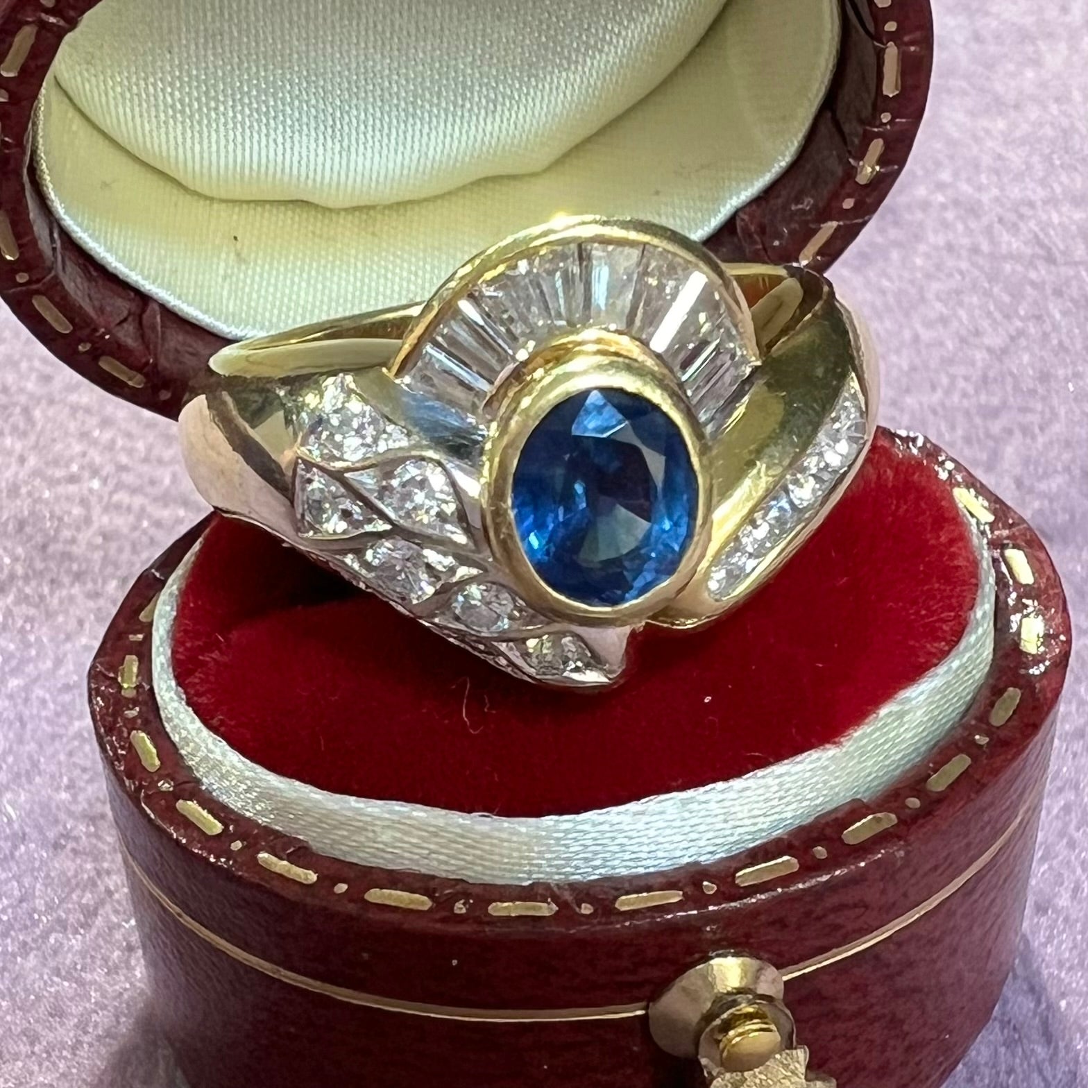 - **Sapphire:** Oval, vivid blue, estimated 1 carat in a mounted condition