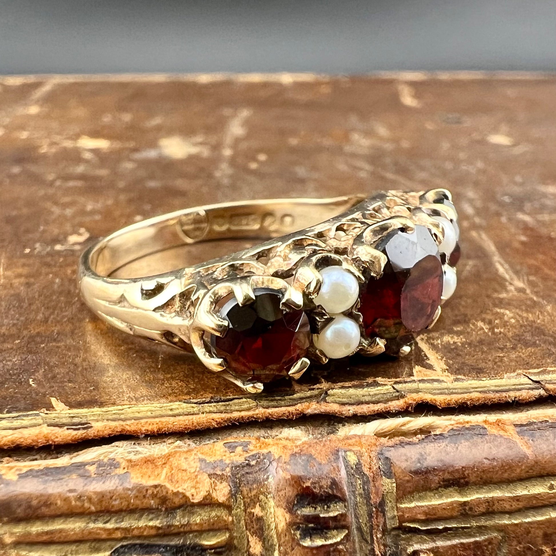 The ring's broad band is adorned with three enchanting garnets, with the largest central gem immediately catching the eye. Each garnet is meticulously set, punctuated by two delicate pearls on either side of the main gem, creating the perfect balance of luxury and sophistication.