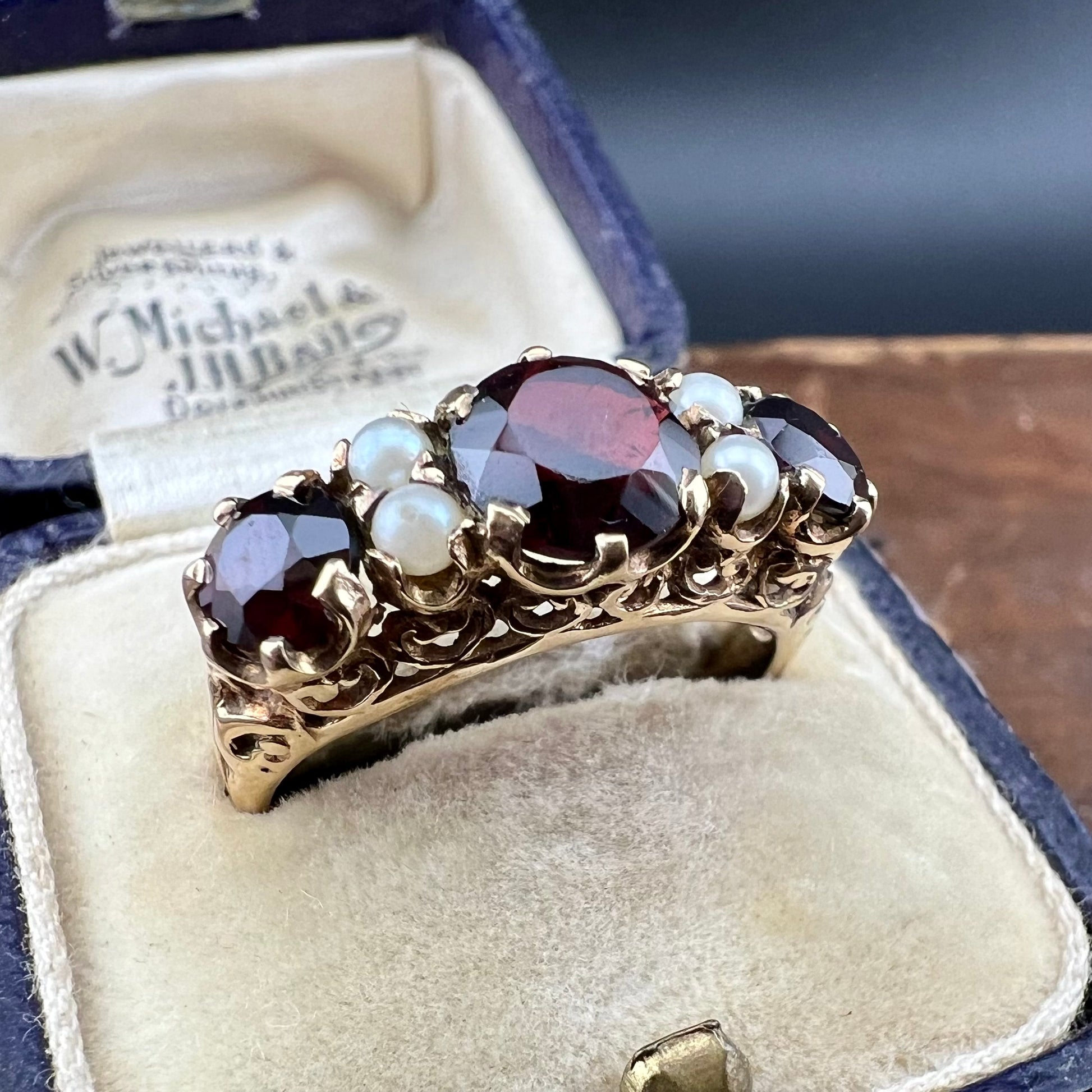 Giving this vintage garnet and pearl ring as a gift is a gesture of love and style. Perfect for an anniversary, birthday, or any special occasion, this ring is more than just a piece of jewelry, but a piece of history to wear. Garnets, symbols of passion and energy, along with pearls, emblems of purity and wisdom, make this ring a meaningful and memorable gift for a loved one.