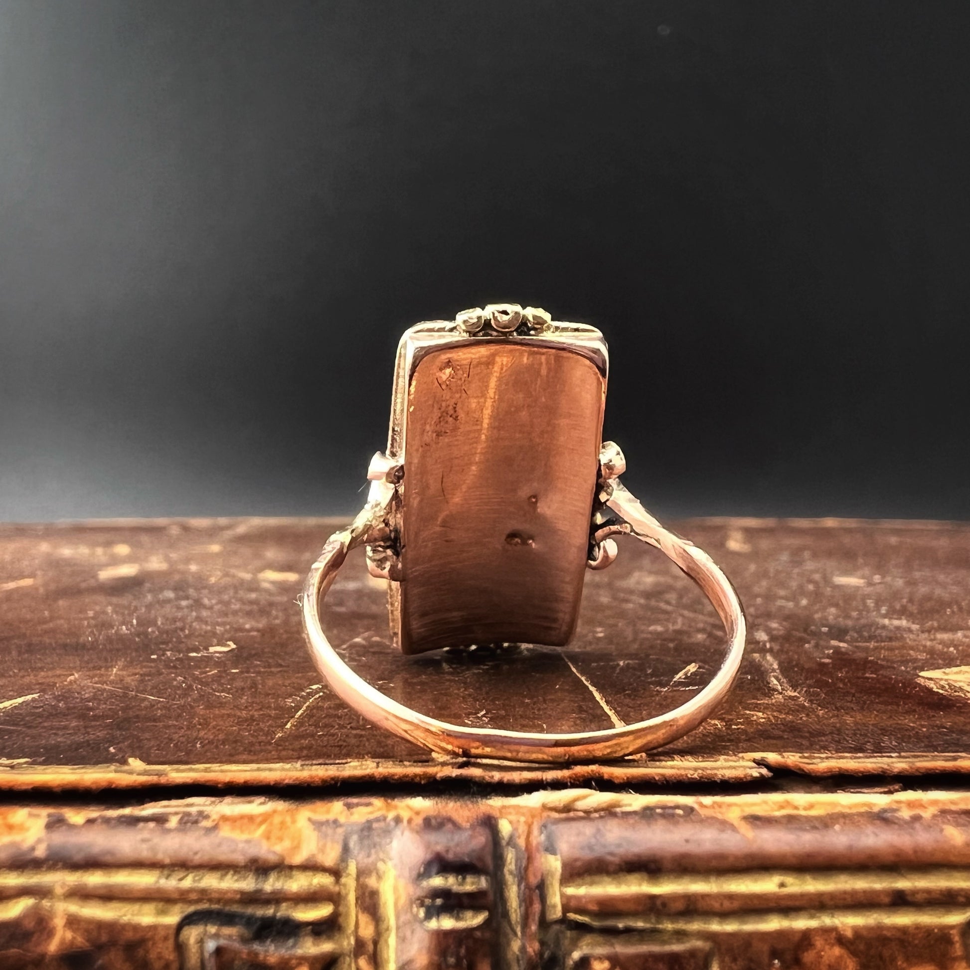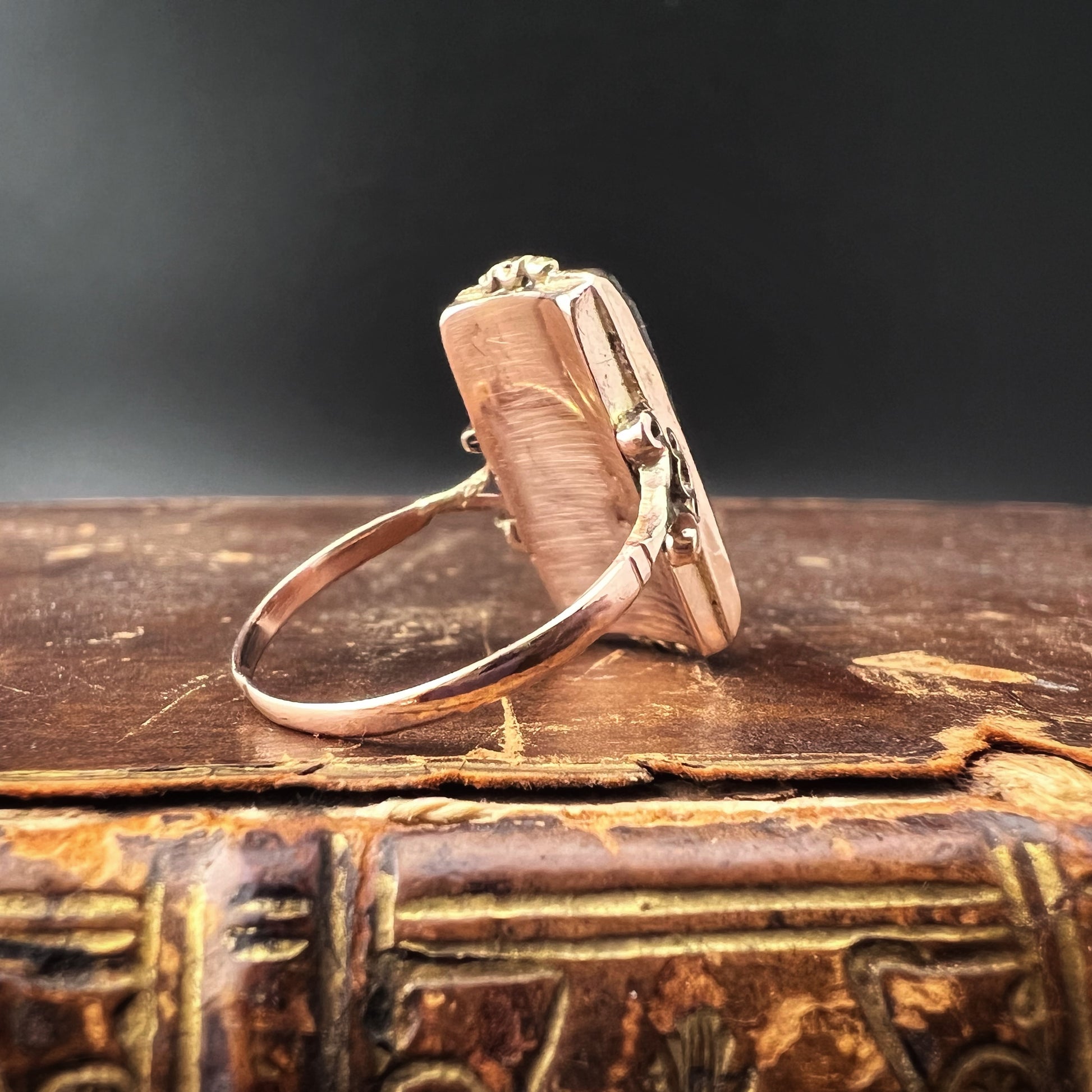 This ring could be associated with the tradition of mourning rings , popular in the United Kingdom during the Victorian era and early 1900s. These jewels, often featuring black onyx and refined gold details, were worn to honor the memory of a loved one, representing a symbol of respect and elegance. Today, however, these rings are no longer exclusively tied to this function: their timeless appeal makes them ideal as stylish accessories, perfect for expressing a refined personality and appreciating vintage jewelry.