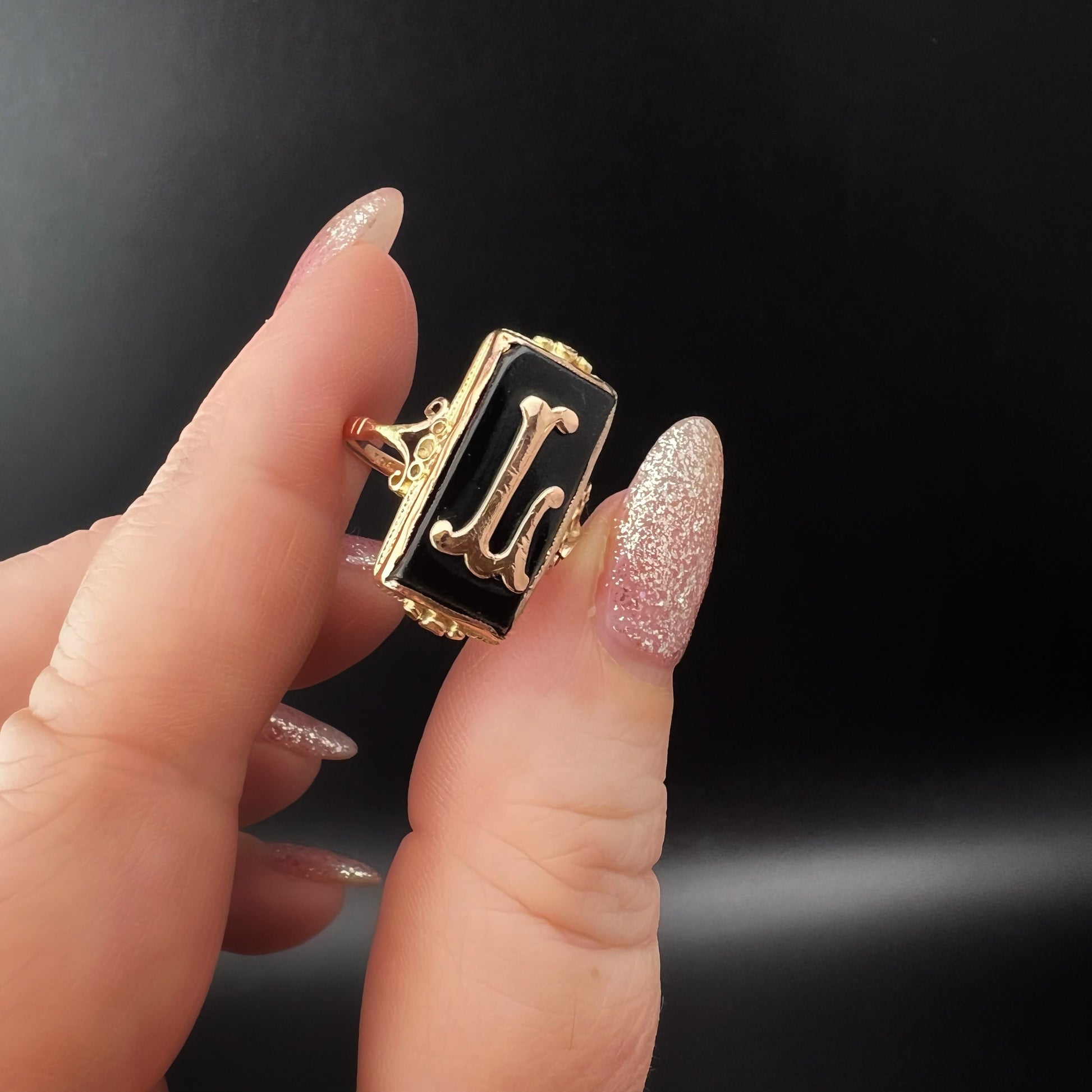 The central element is a rectangular, polished black onyx, topped with a gold "L" in a contemporary style, lending a touch of class and uniqueness. The entire structure is crafted from 9-karat yellow gold, an authentic example of English artisanal jewelry from the period.
