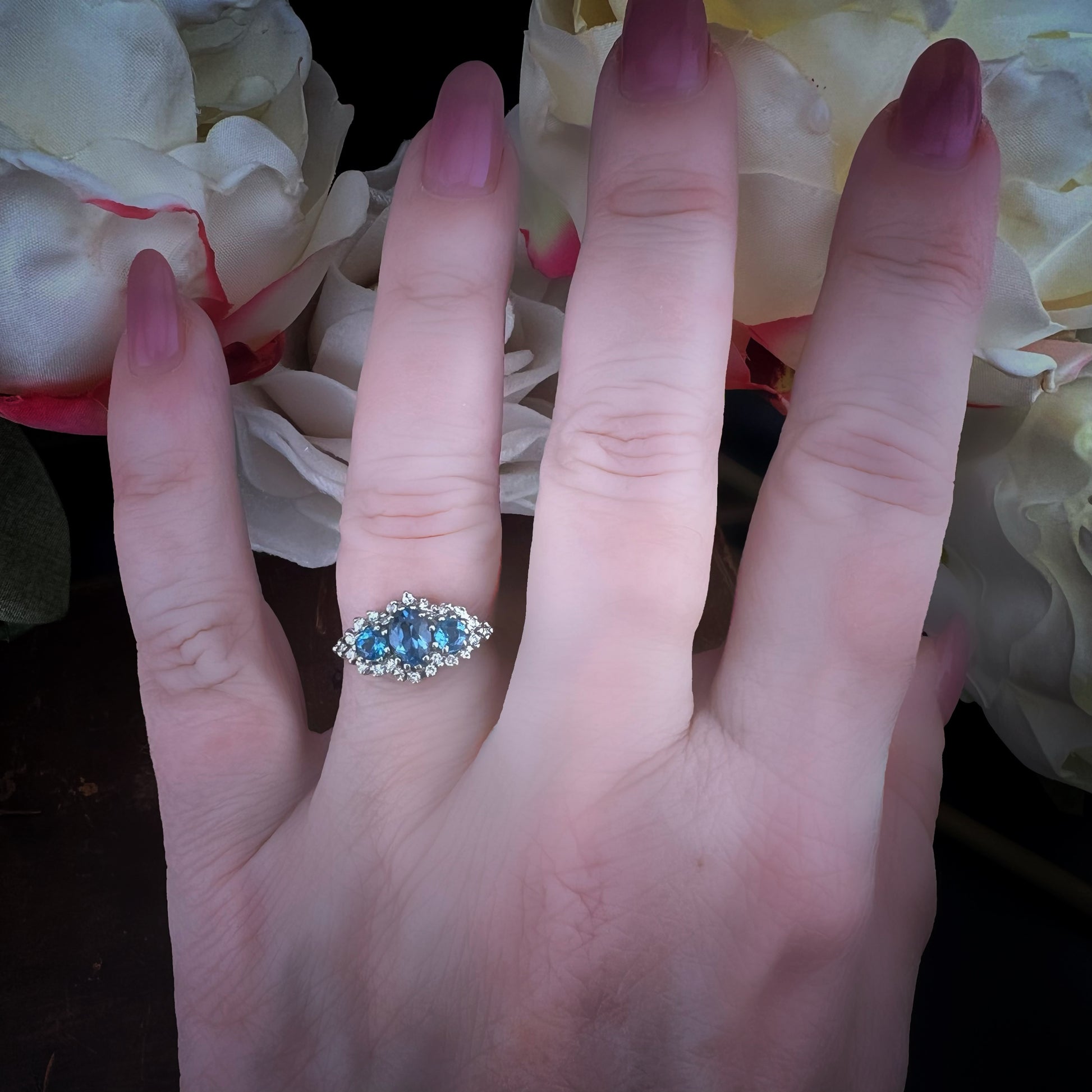 Vintage 18k white gold ring with an elegant front composition made with vibrant blue topazes and diamonds.