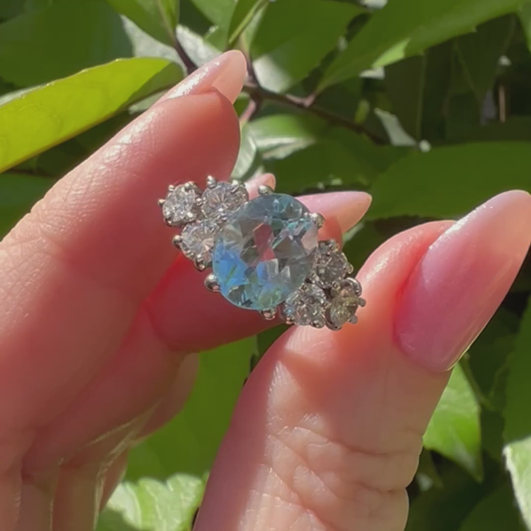 A vintage ring with an ethereal charm, where the delicacy of pale blue topaz meets the pure brilliance of diamonds, creating a symphony of light and refinement.