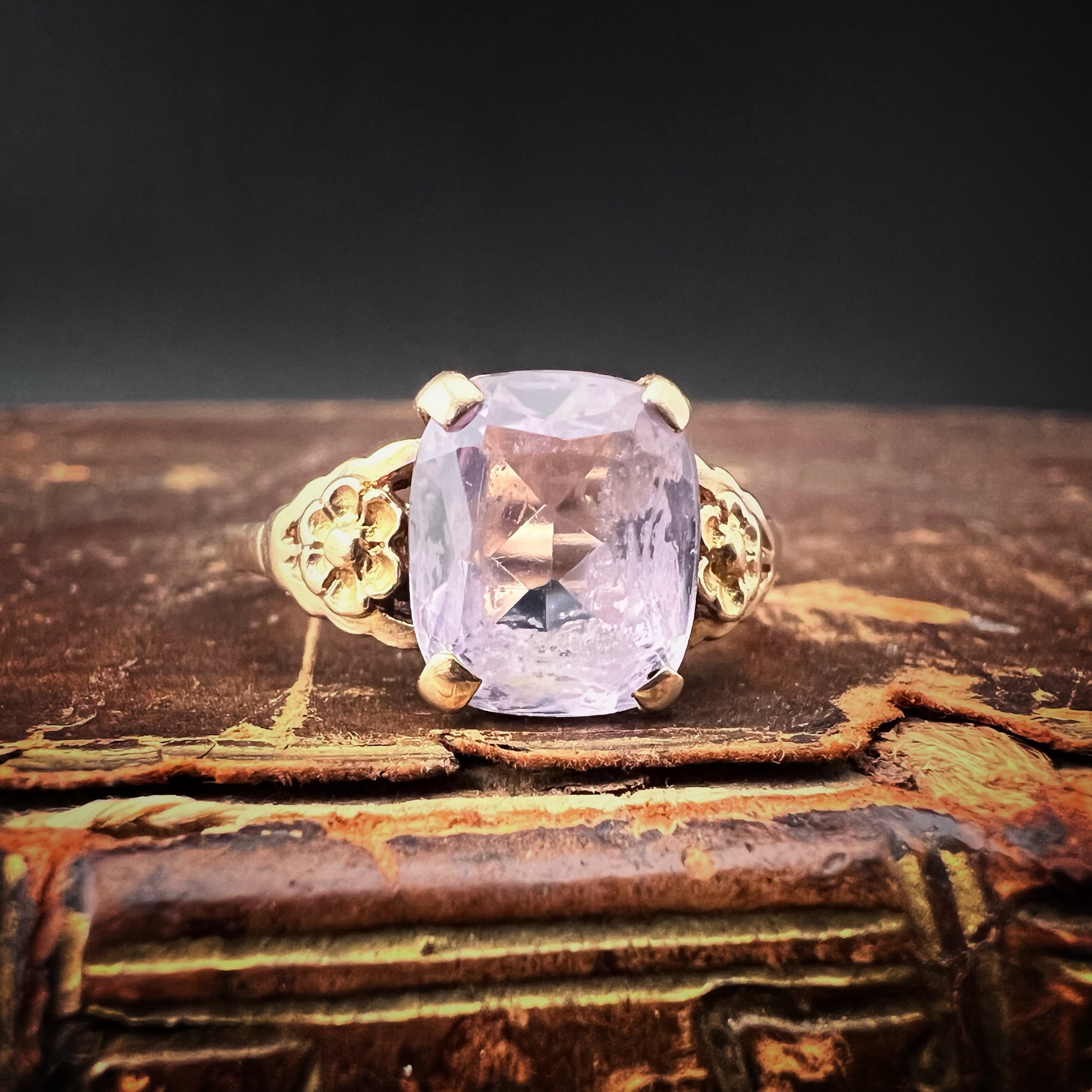 Vintage 9k yellow gold ring, embellished with a stunning natural emerald-cut clear amethyst, framed by a delightful flower on each side. This charming piece, crafted in the 1950s according to traditional English goldsmithing, combines elegance and sophistication in a timeless design. Perfect for those who appreciate the delicate details and charm of vintage jewelry.