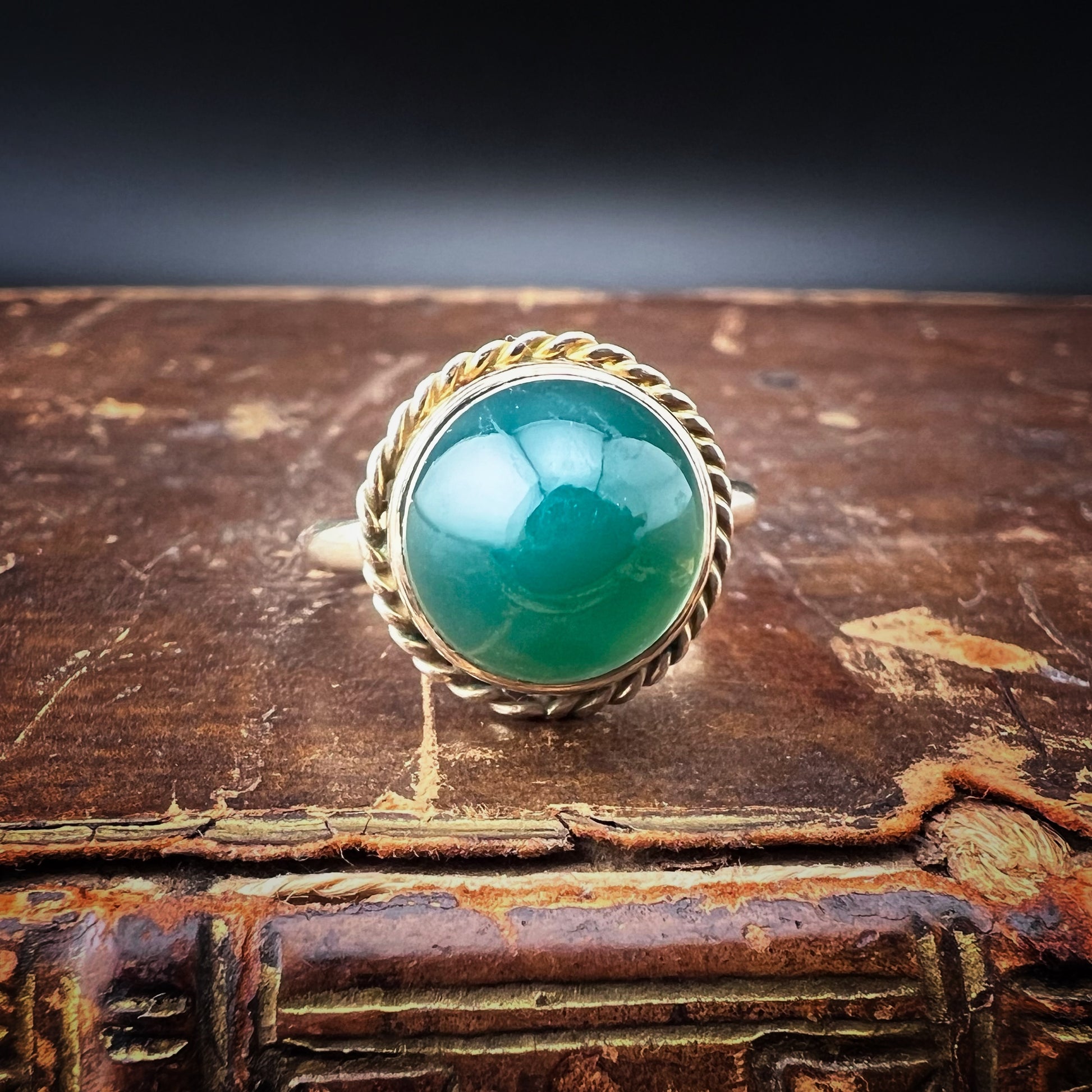 The bezel setting, with its knurled edge framing the ovoid chrysoprase cabochon, evokes a futuristic, streamlined aesthetic. The understated shank doesn't interrupt the fluidity of the line, highlighting the stone as the undisputed protagonist.