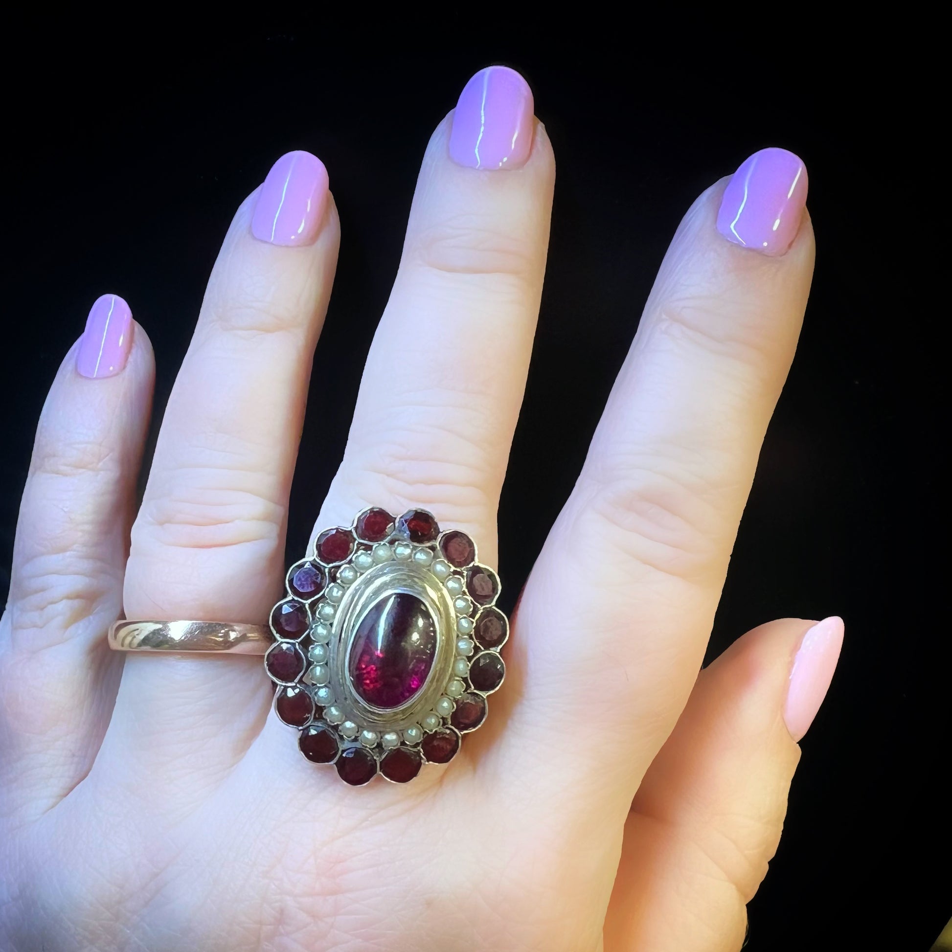 The garnet is surrounded by an inlay of 25 natural pearls , which lend delicacy and brilliance, and by a double crown of 16 expertly set round-cut garnets (5 mm). The threaded shank ends in the bezel with two elegant hand-chased tongues, revealing the attention to detail of the time.