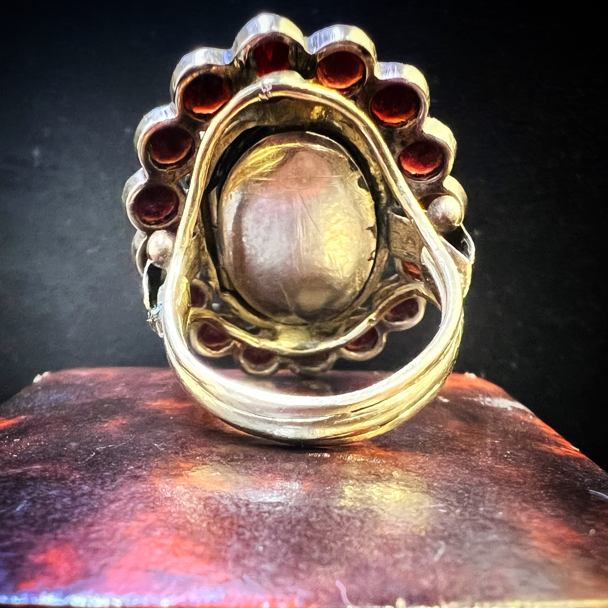 A refined 19th-century Italian ring that perfectly combines elegance and hidden functionality, perfect for those who love jewelry with a story to tell. This stunning piece stands out for its large oval head (30 x 26 mm) and the striking presence of a central cabochon garnet (12.2 x 8.6 mm), a precious stone with a unique and warm brilliance that captures the light spectacularly.