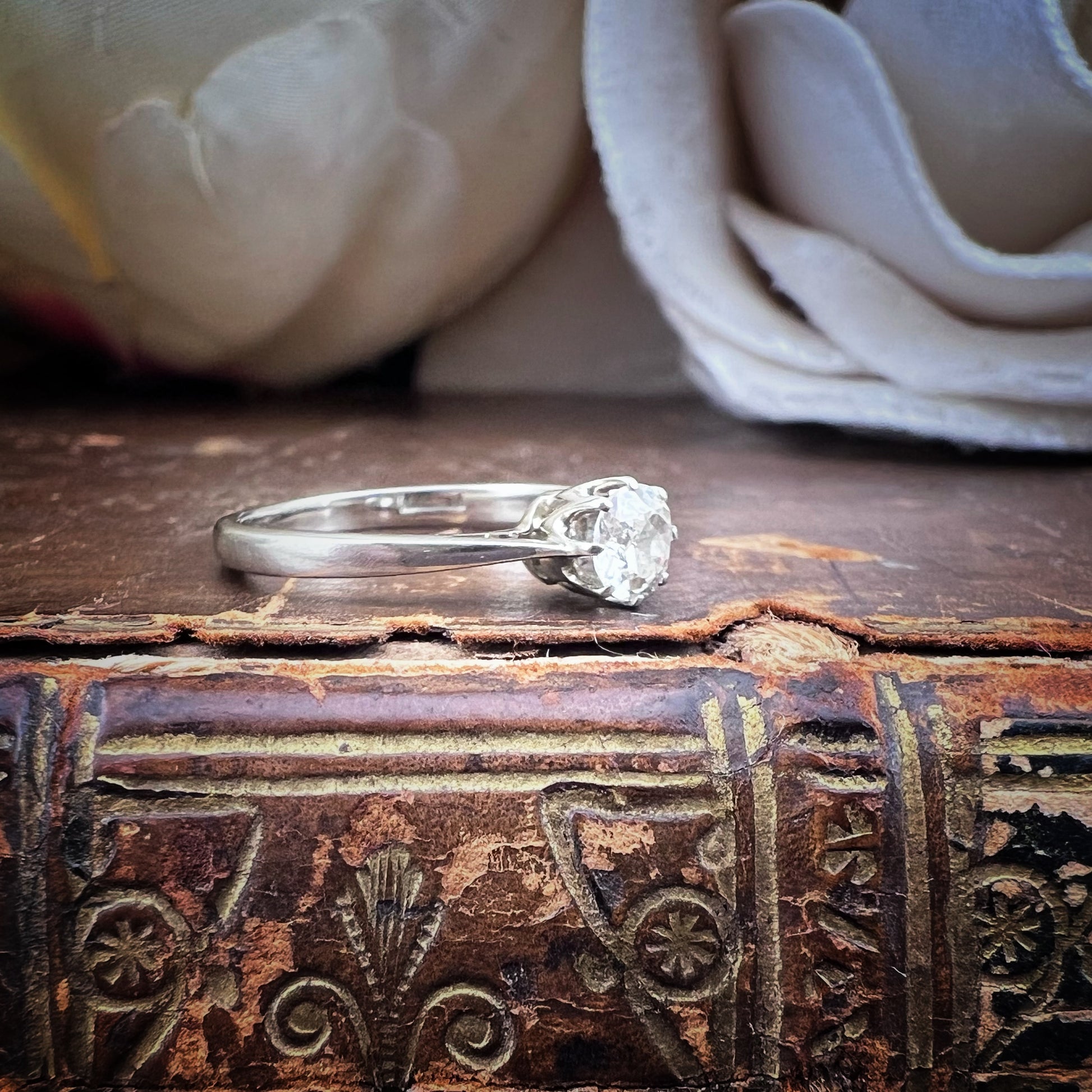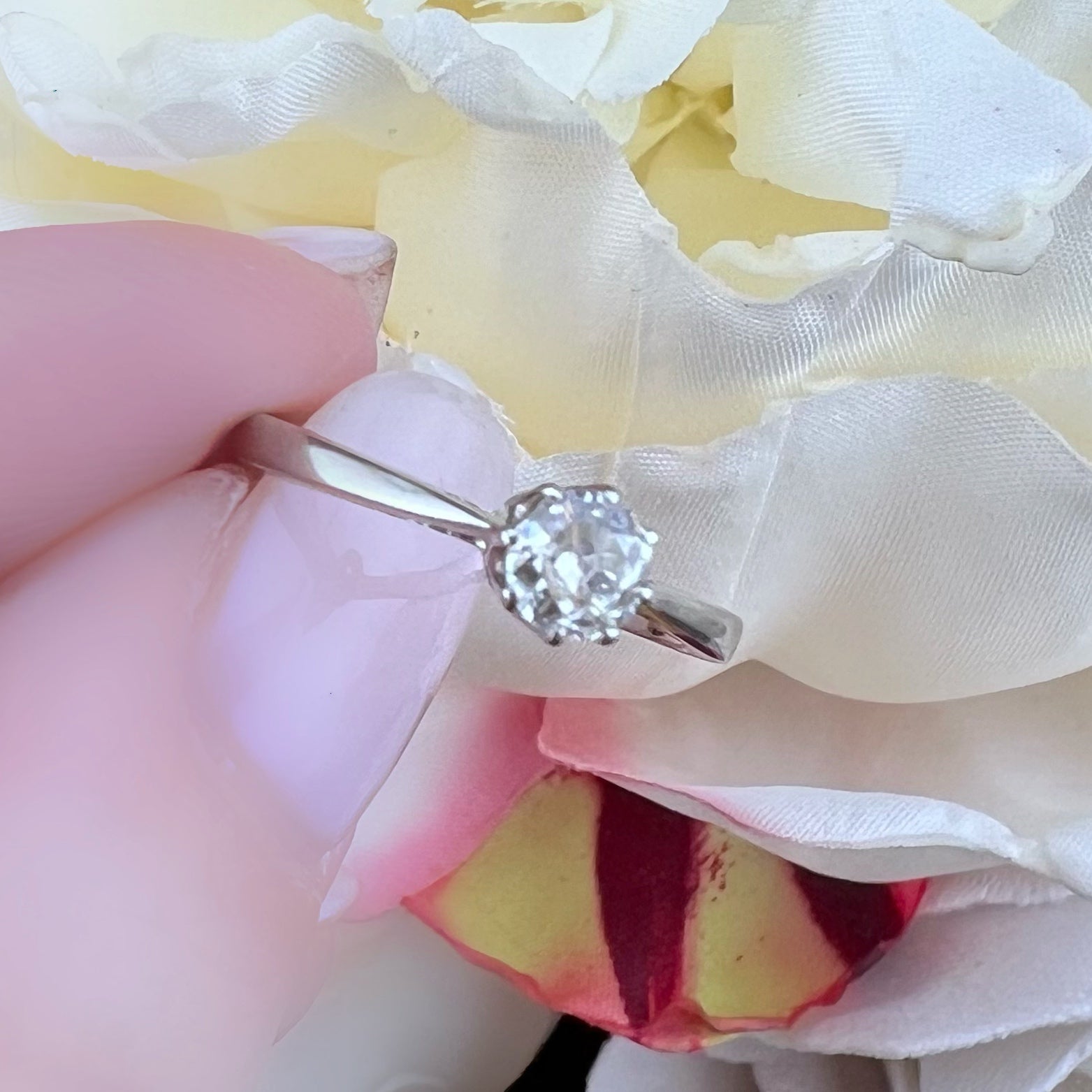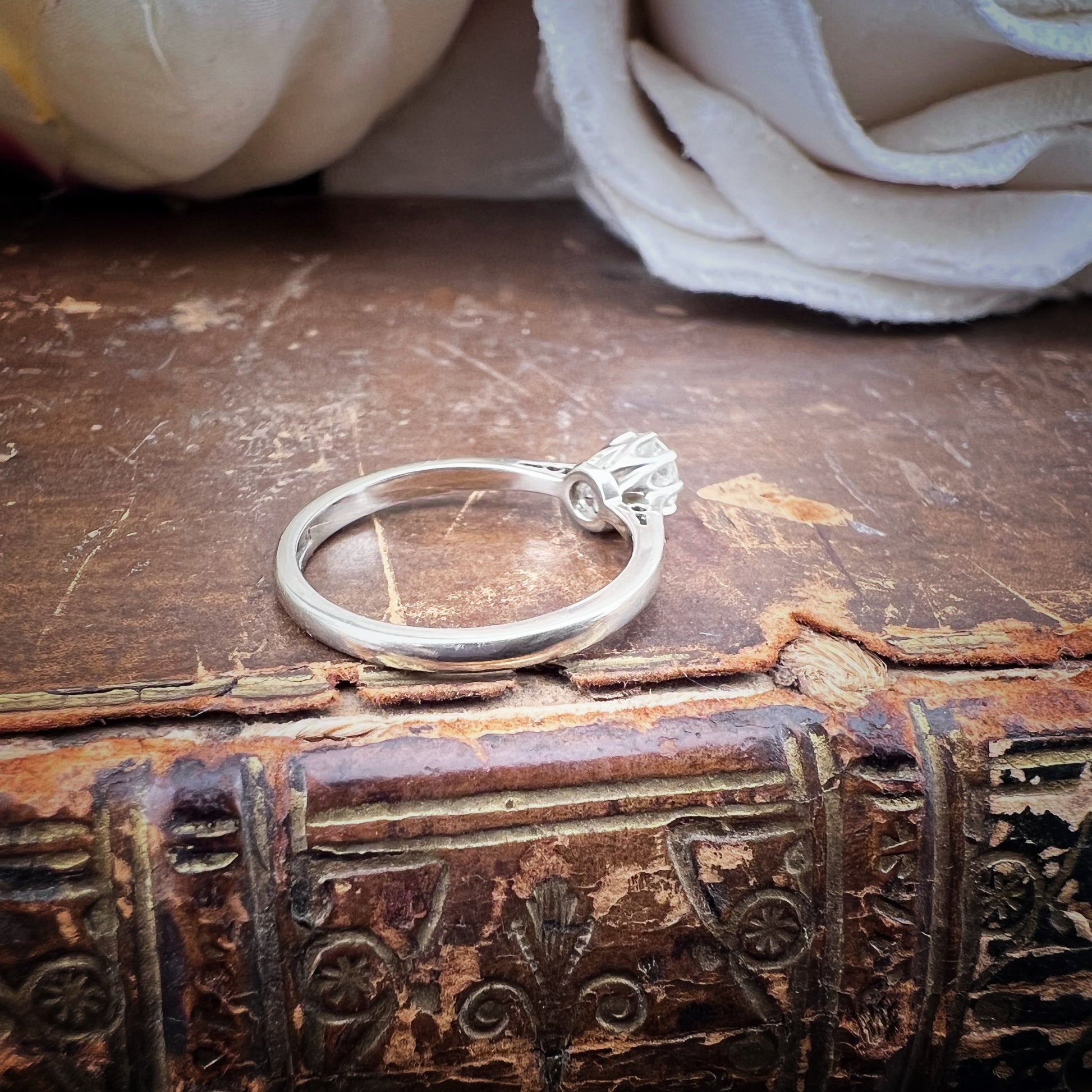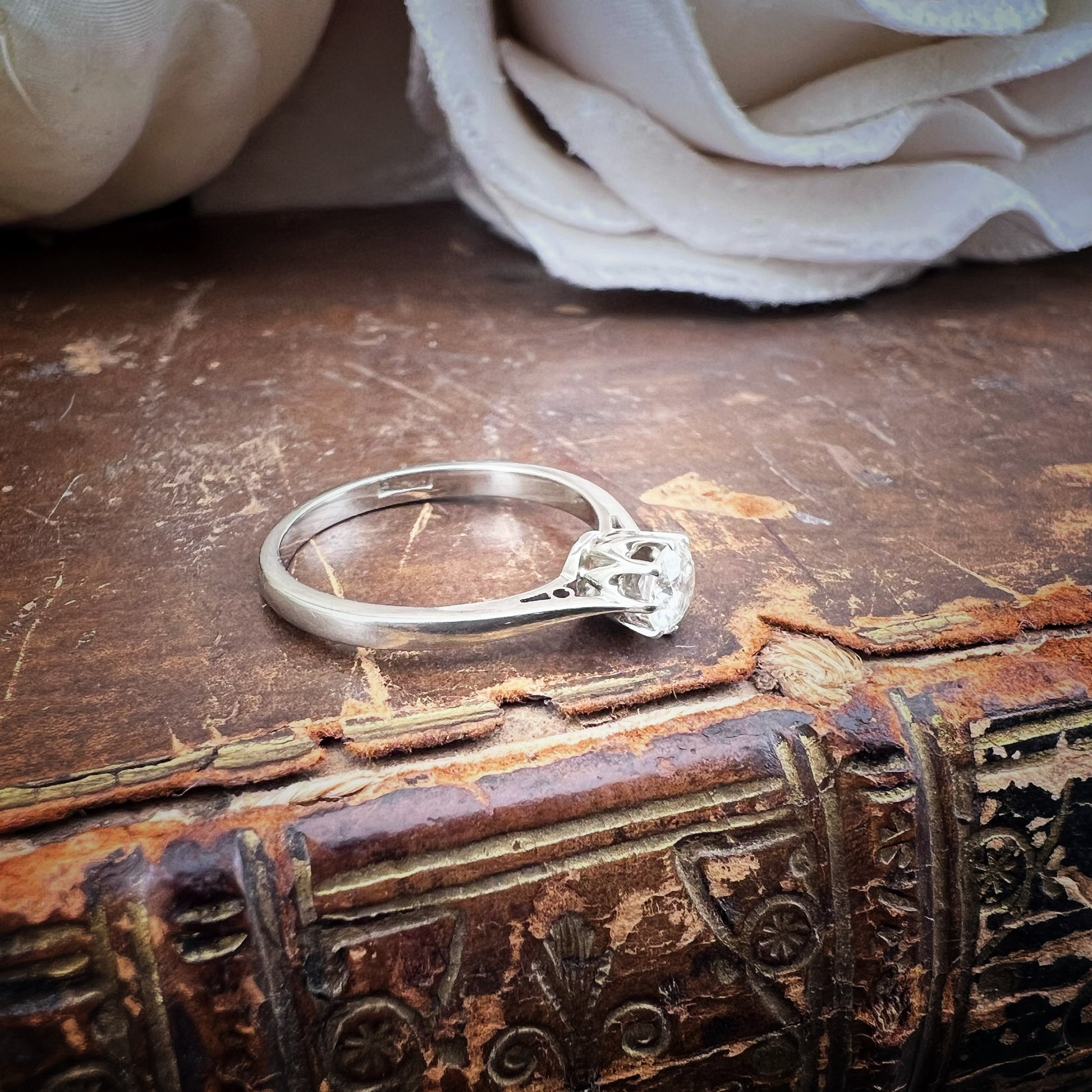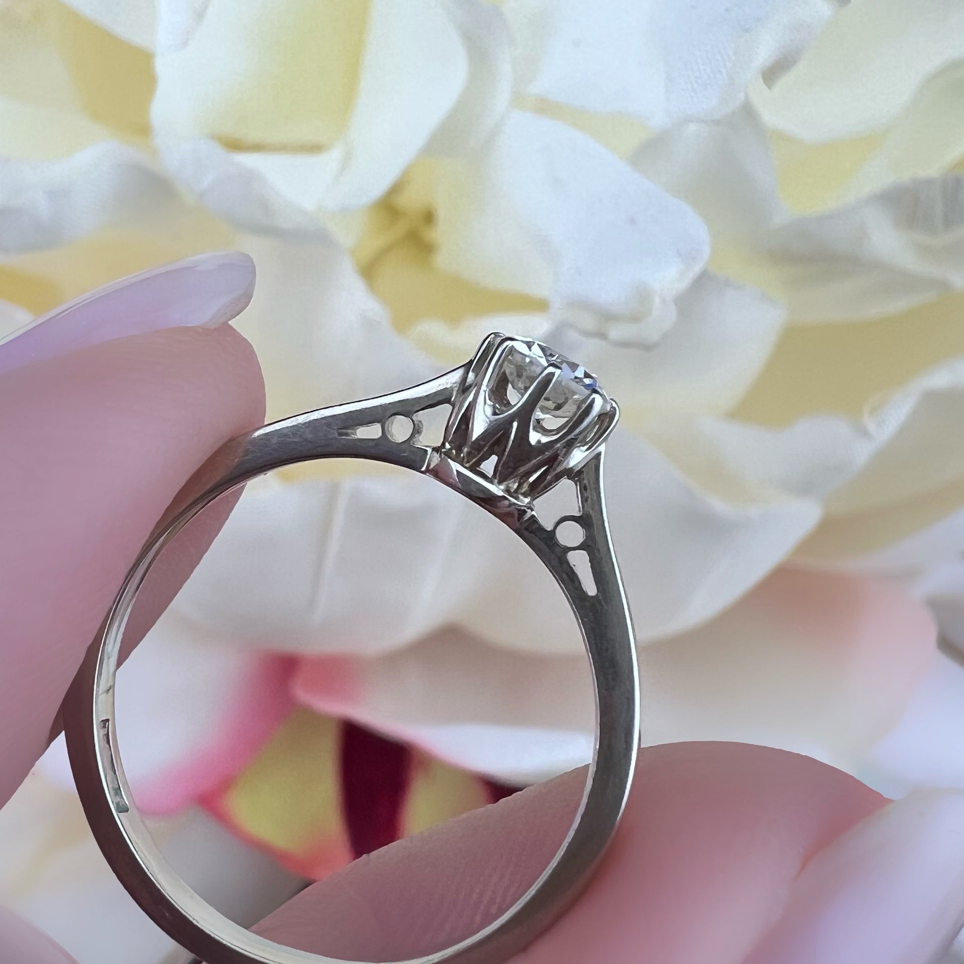 Timeless elegance and refined details define this stunning vintage solitaire ring, crafted from 18k white gold.