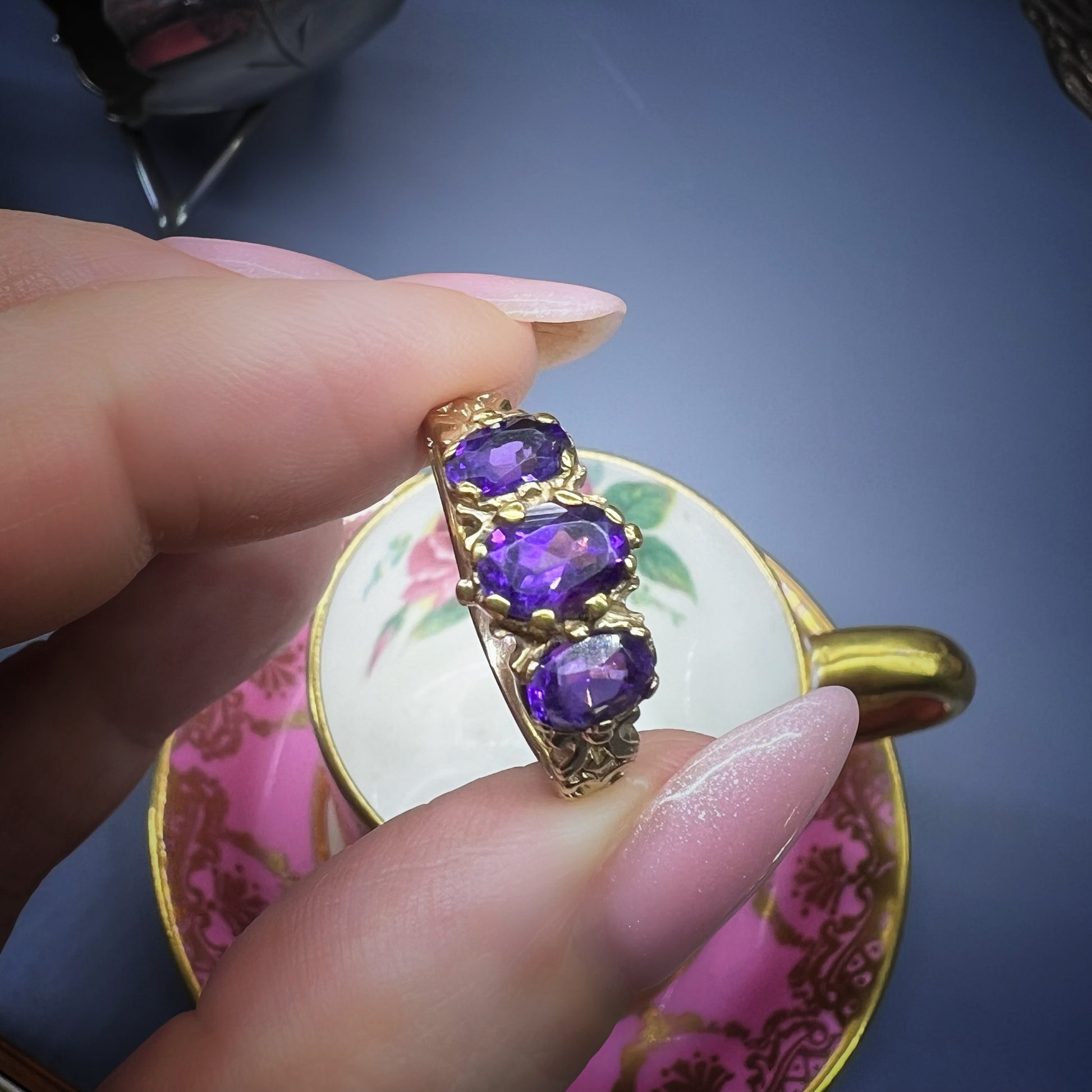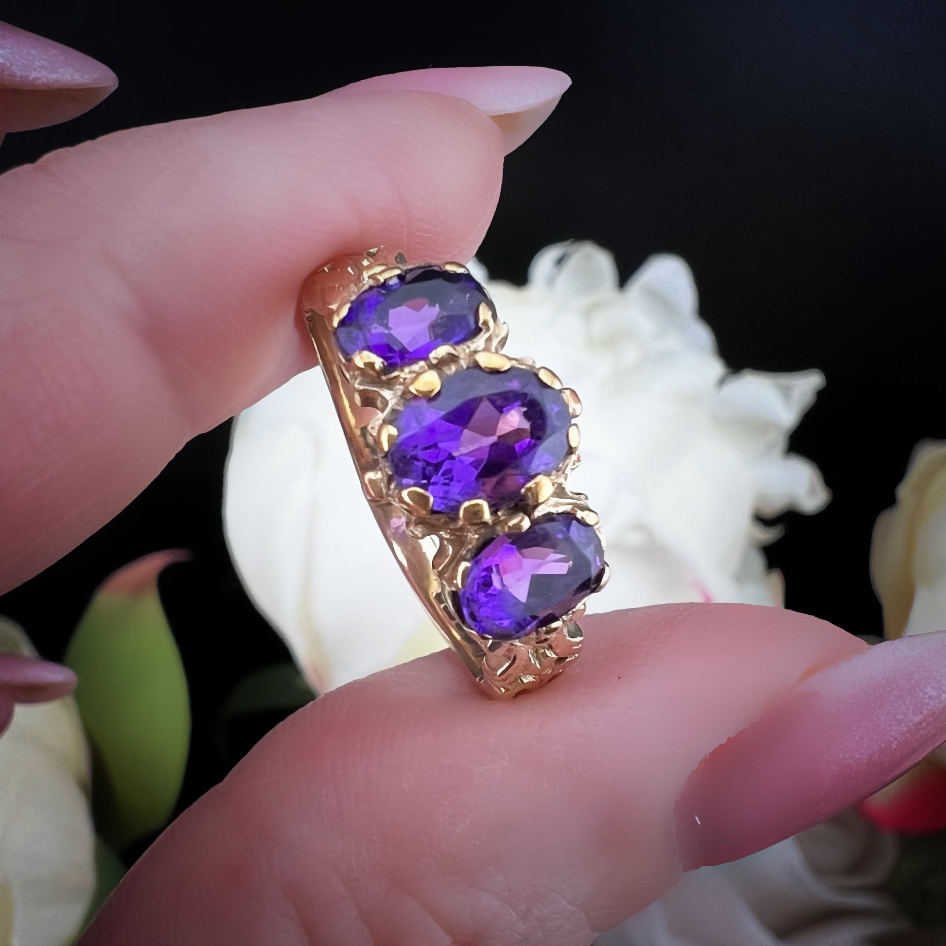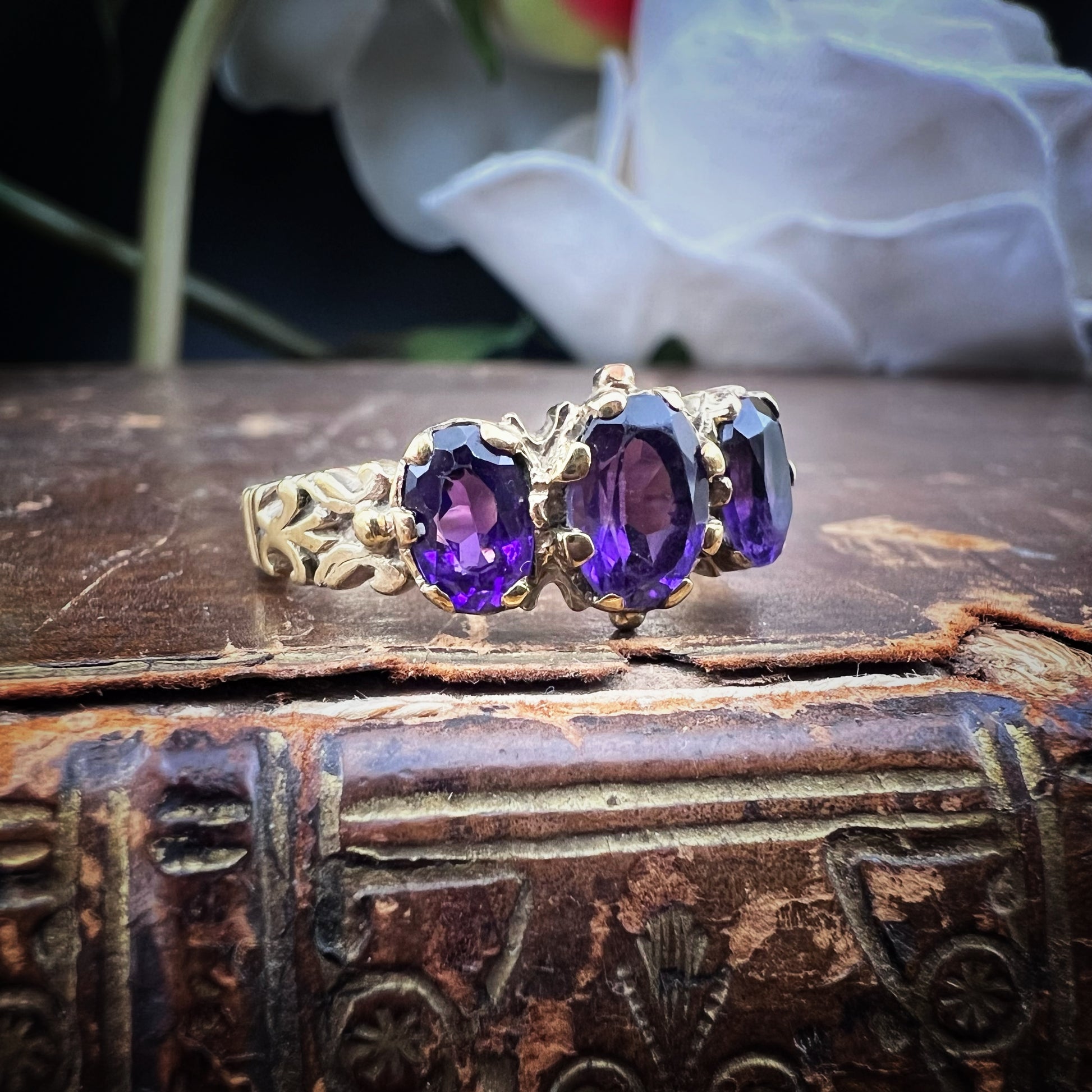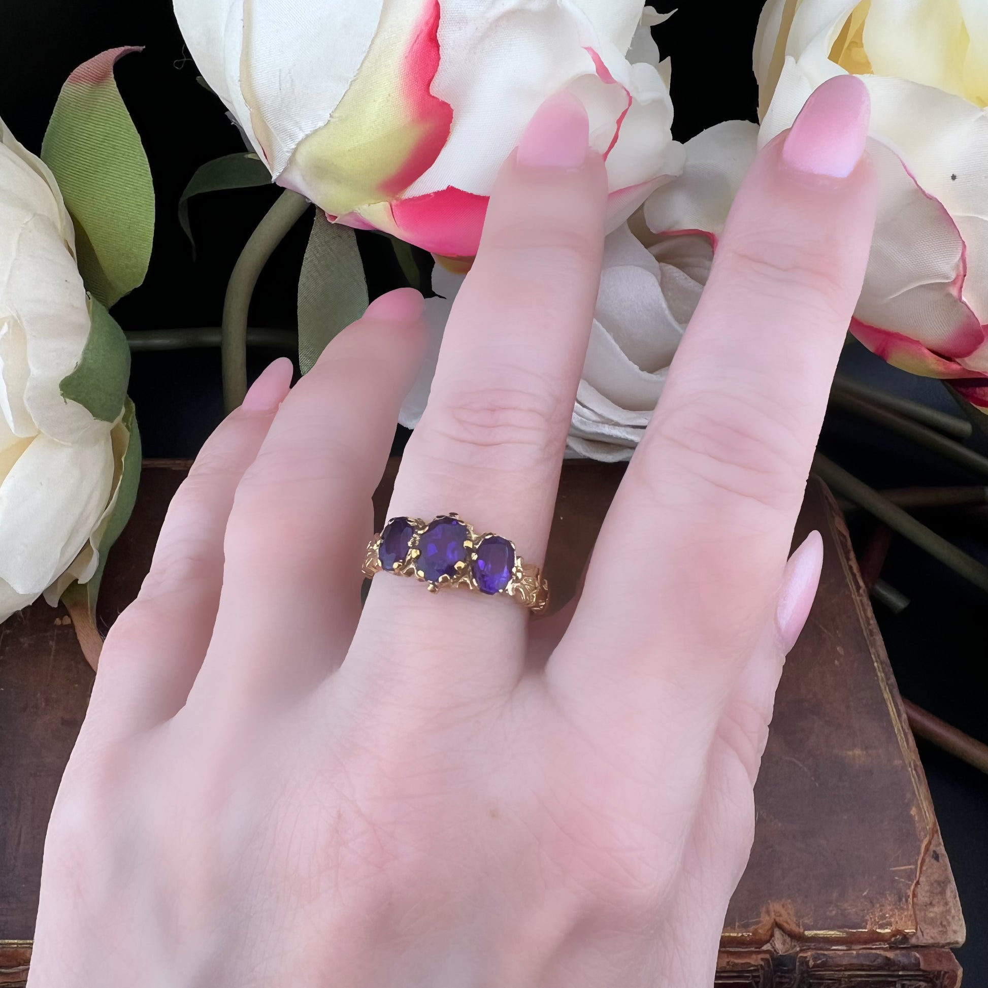 A fine example of vintage English jewellery, this enchanting trilogy ring combines the timeless appeal of Victorian-inspired design with three stunning deep purple amethysts.