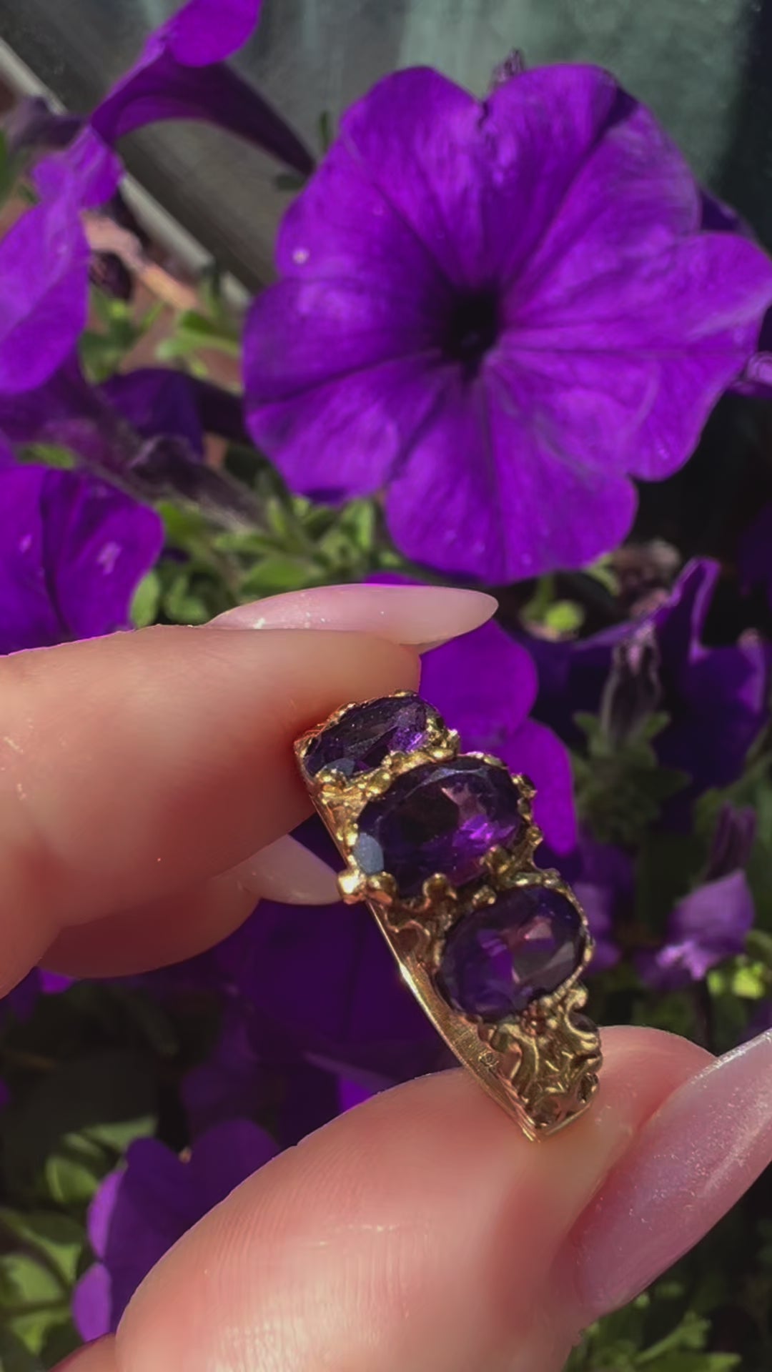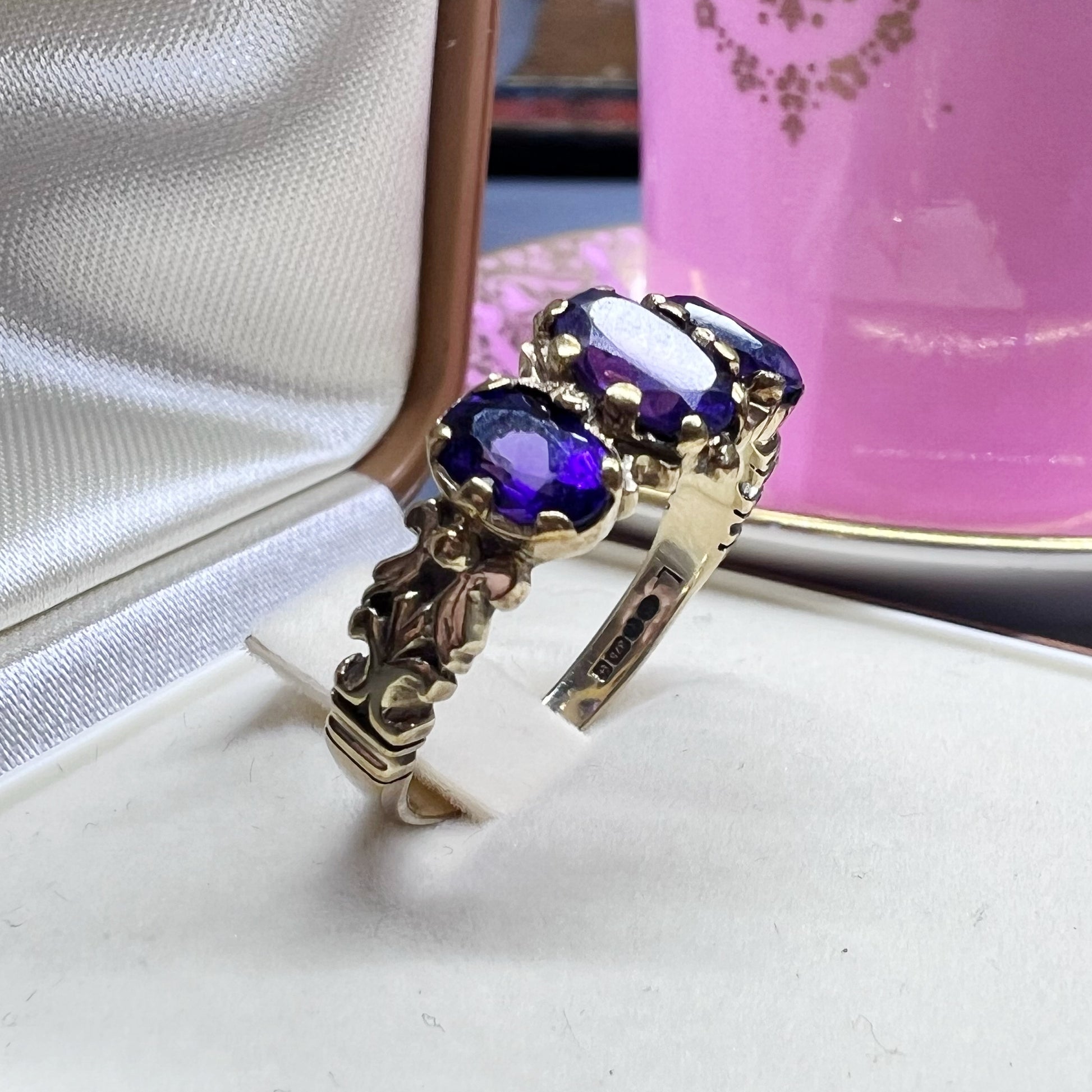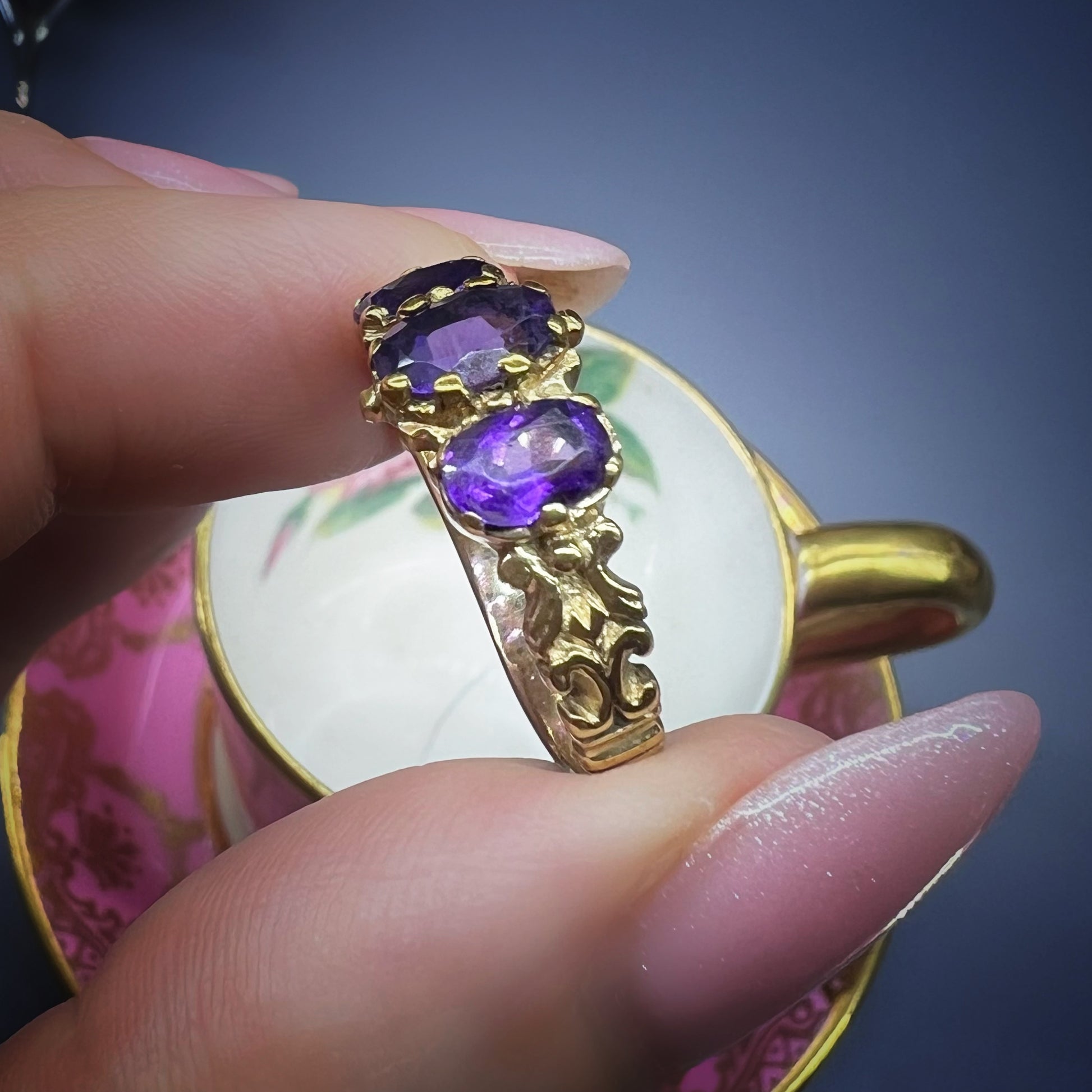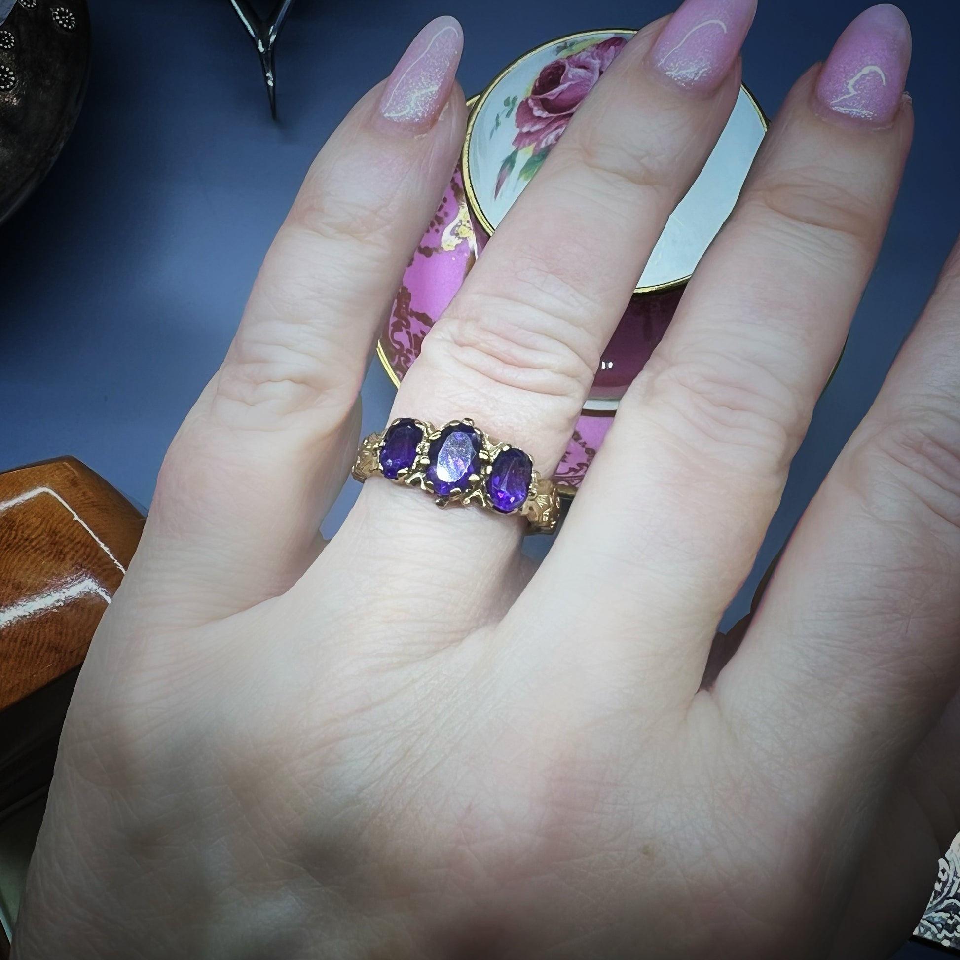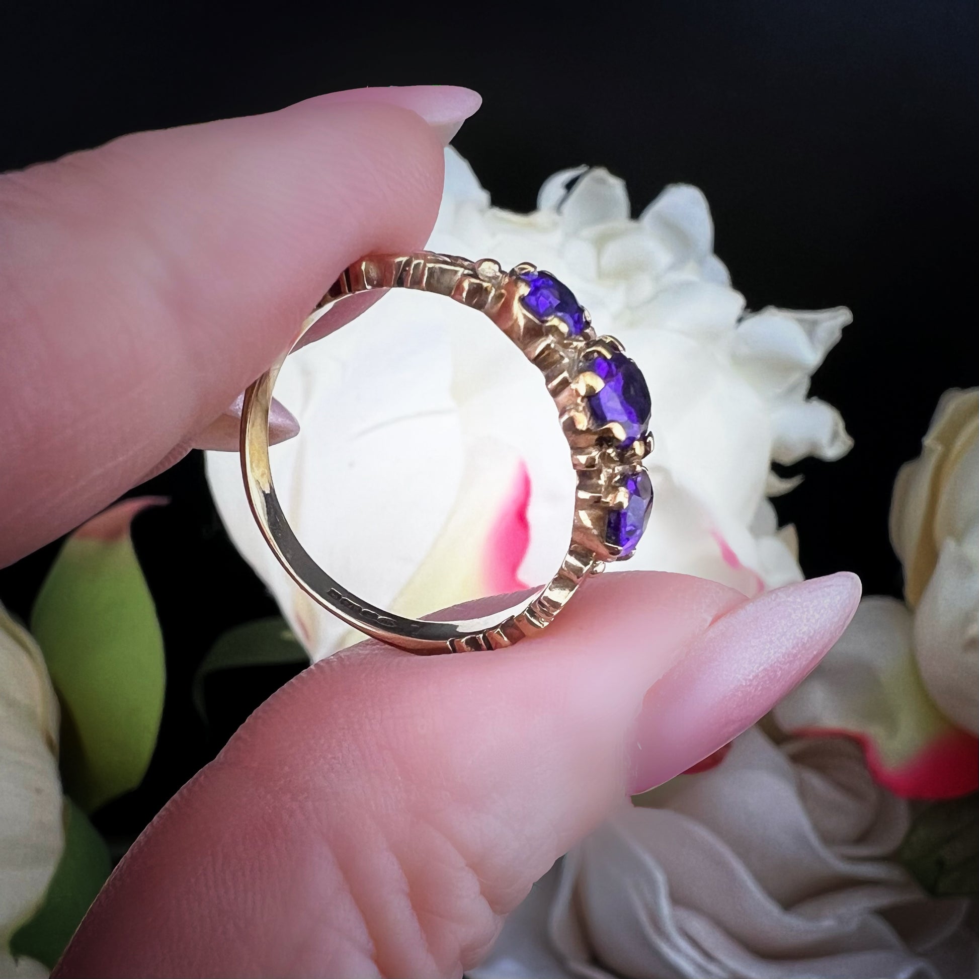 A fine example of vintage English jewellery, this enchanting trilogy ring combines the timeless appeal of Victorian-inspired design with three stunning deep purple amethysts.