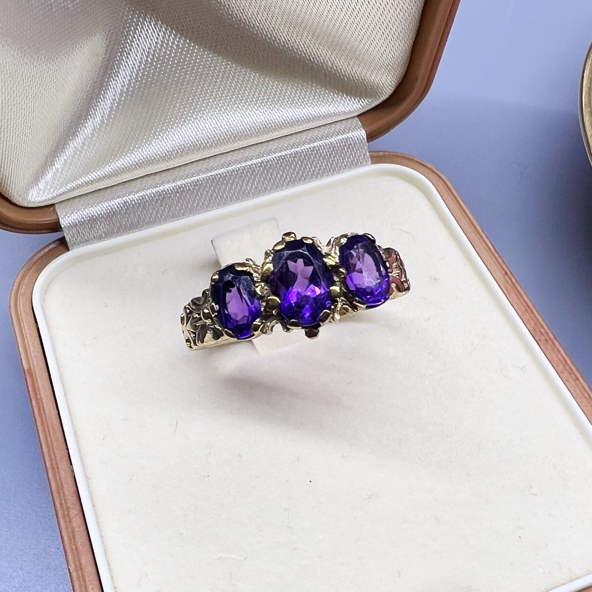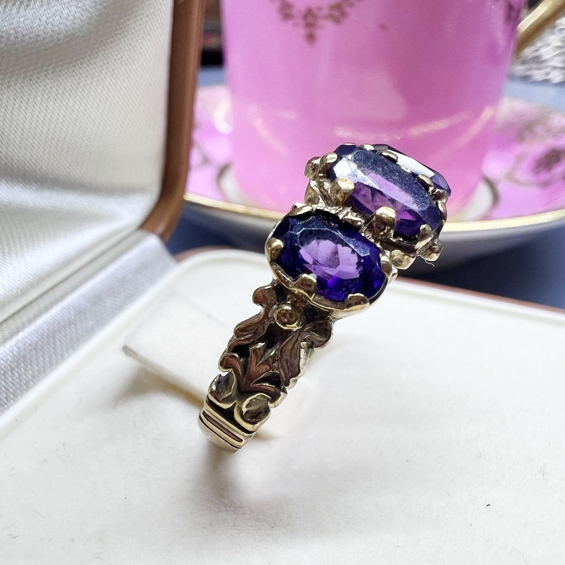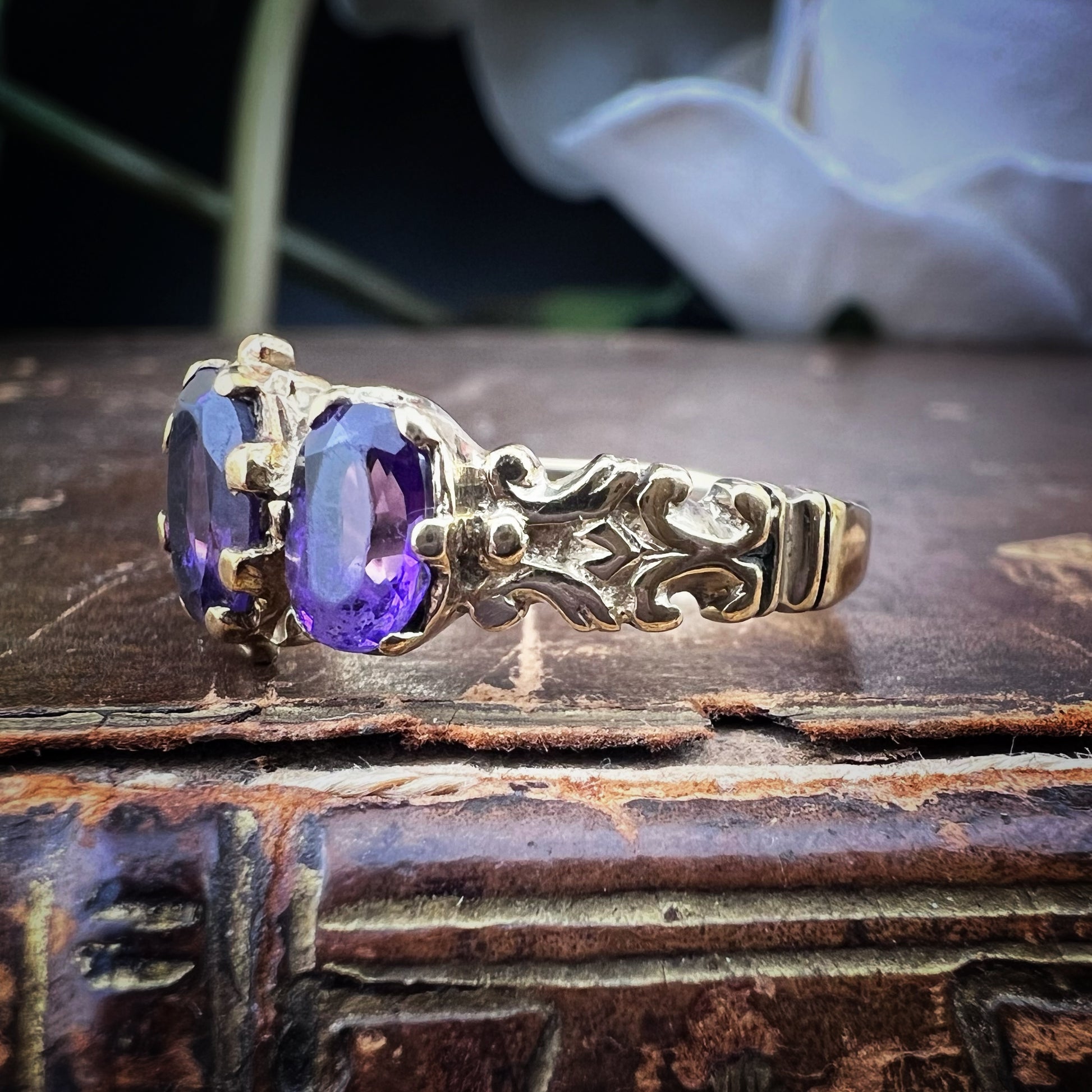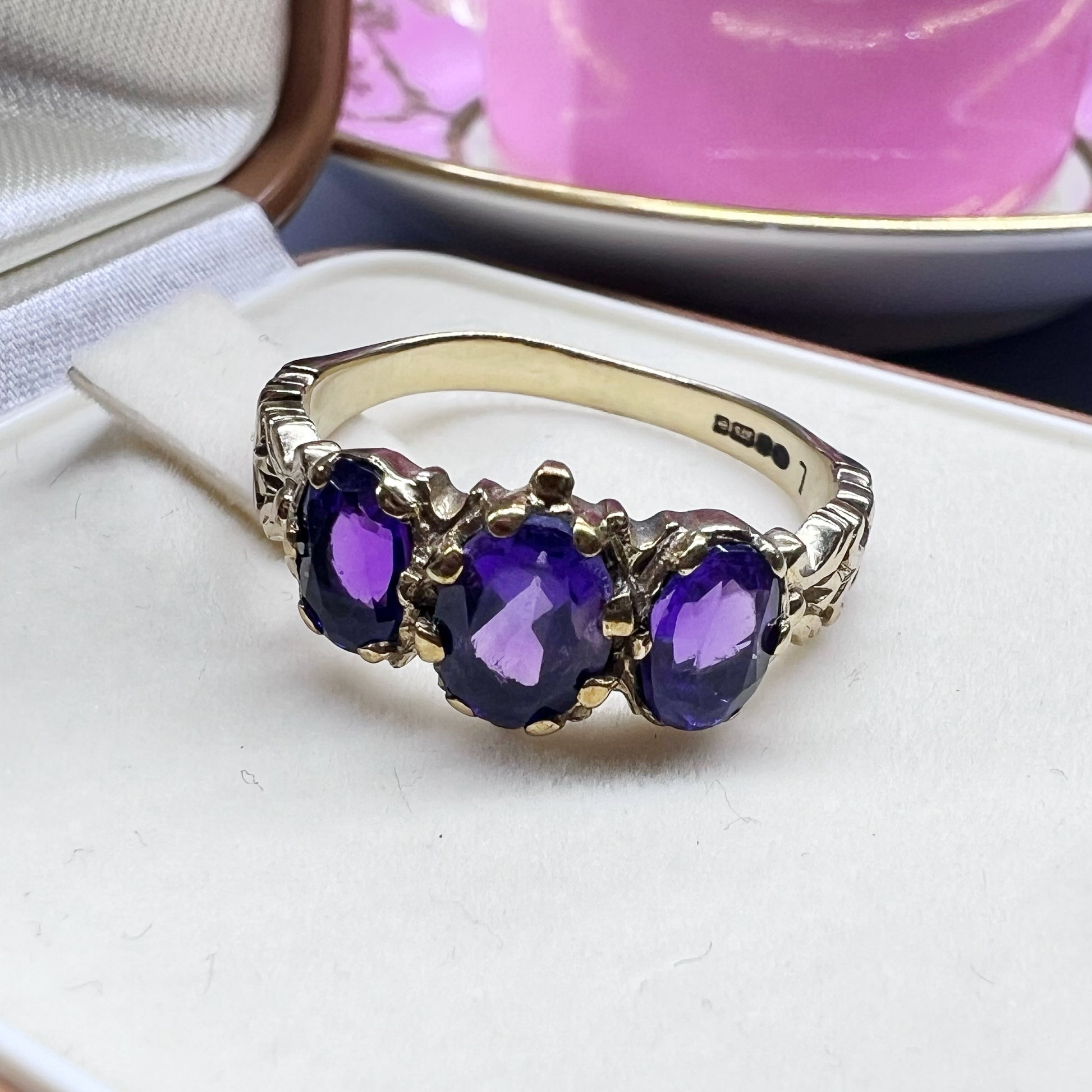 A fine example of vintage English jewellery, this enchanting trilogy ring combines the timeless appeal of Victorian-inspired design with three stunning deep purple amethysts.