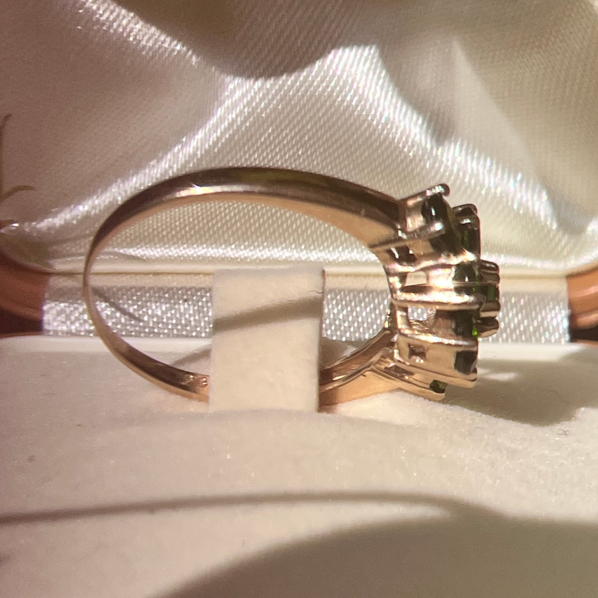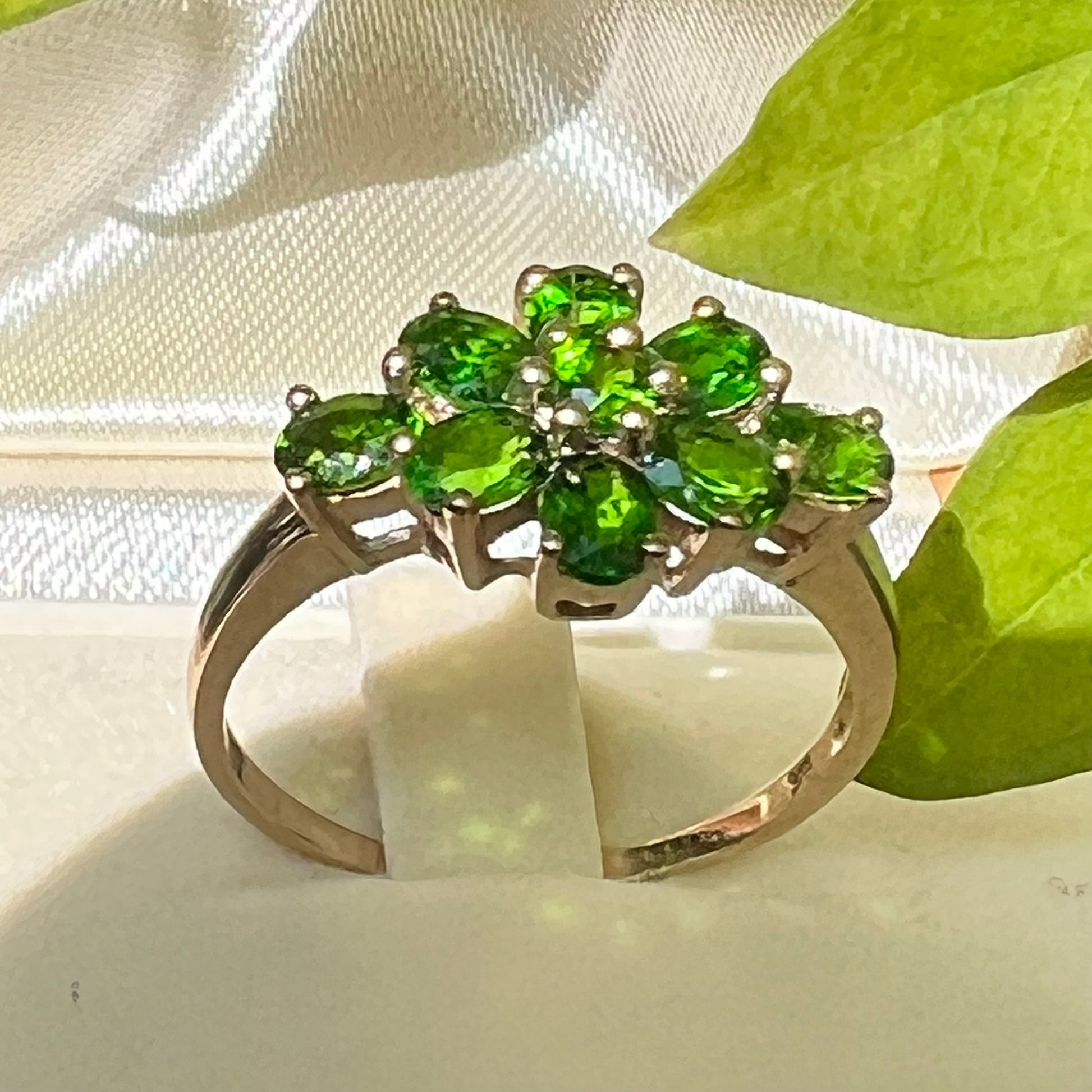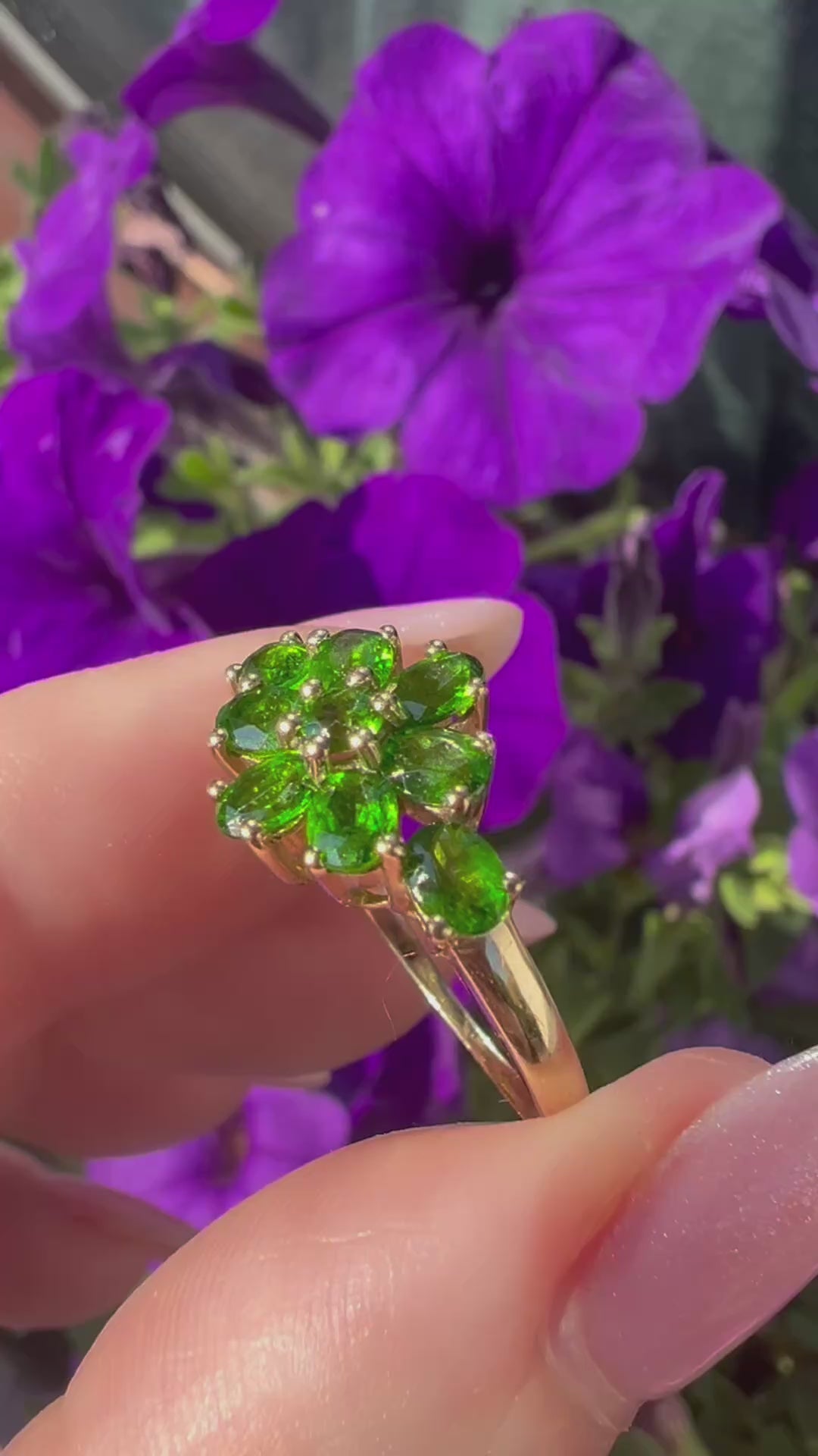 The 9-carat yellow gold setting, faithful to the English goldsmith tradition, houses a flower composed of seven intense green chrome diopside gems, arranged in a daisy shape around a round central stone.