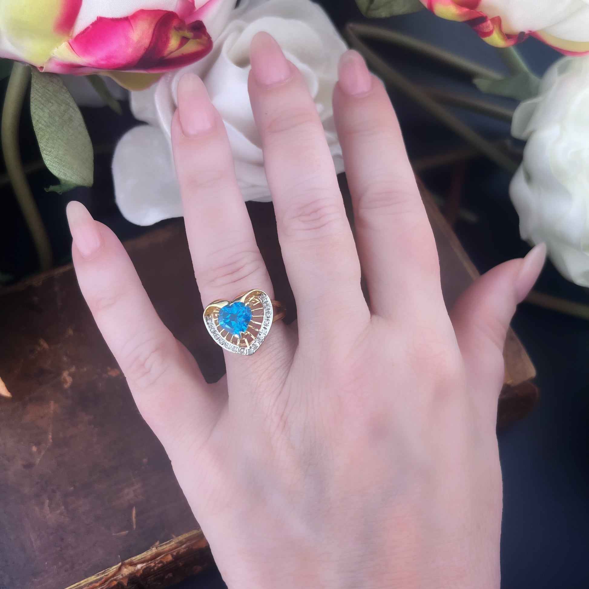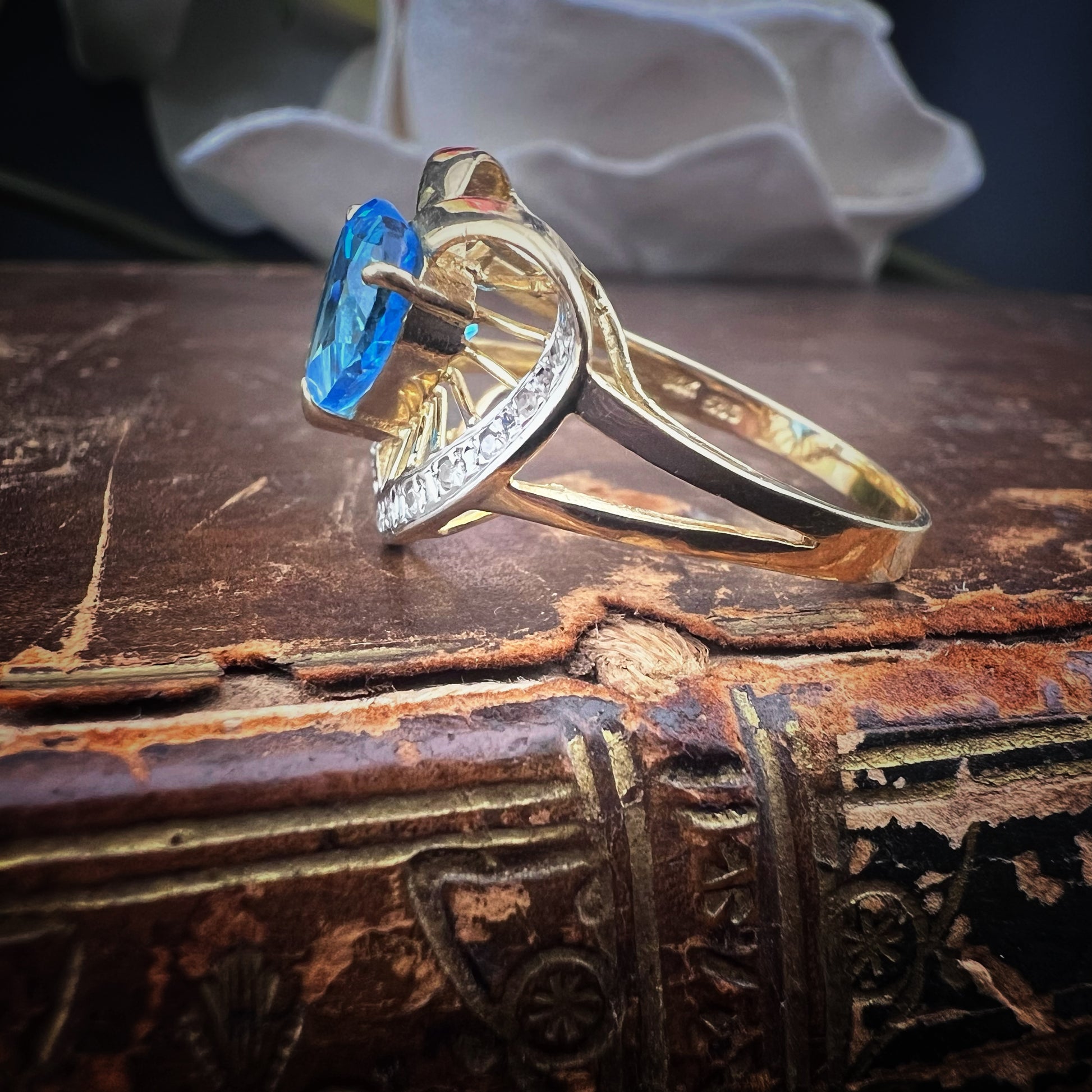 This ring is perfect for those who love vintage jewelry with strong symbolic value. The heart, topaz, and diamonds combine to tell a story of love, beauty, and sophistication. An everlasting gift for a special someone.