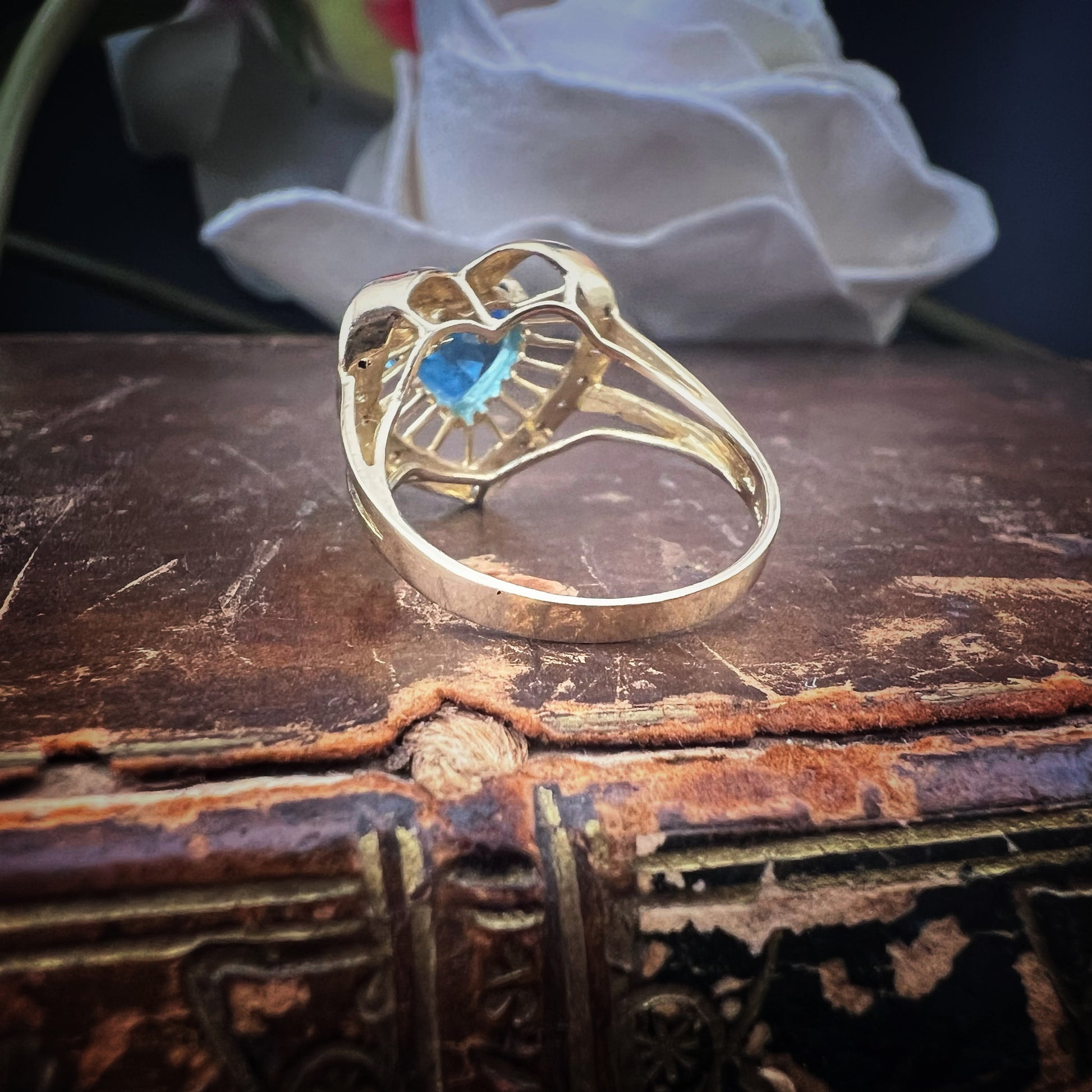 A timeless jewel, this American vintage ring stands out for its romantic and intricate design. Crafted from 14-karat gold, the piece features a heart shape framing a brilliant heart-cut blue topaz, expertly set in a sunburst pattern that lends lightness and depth to the design.