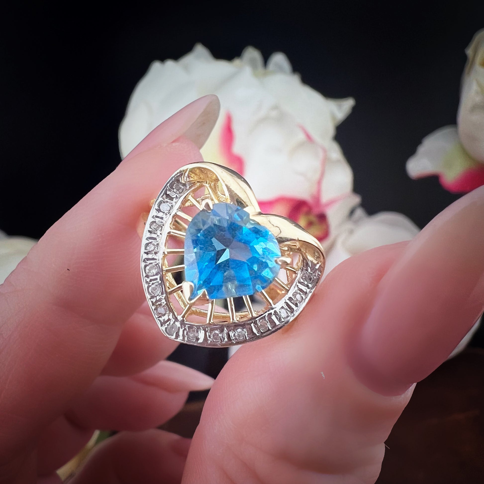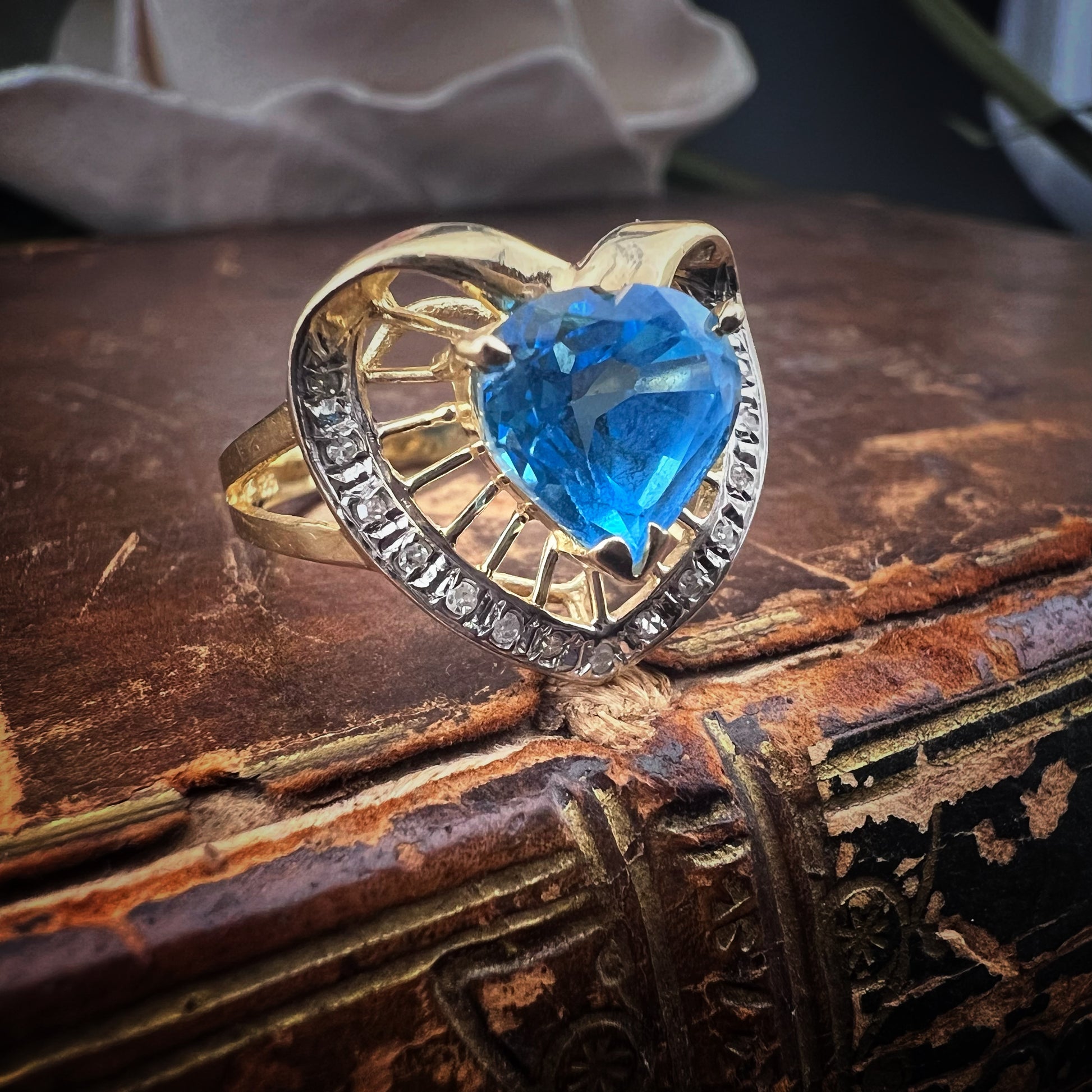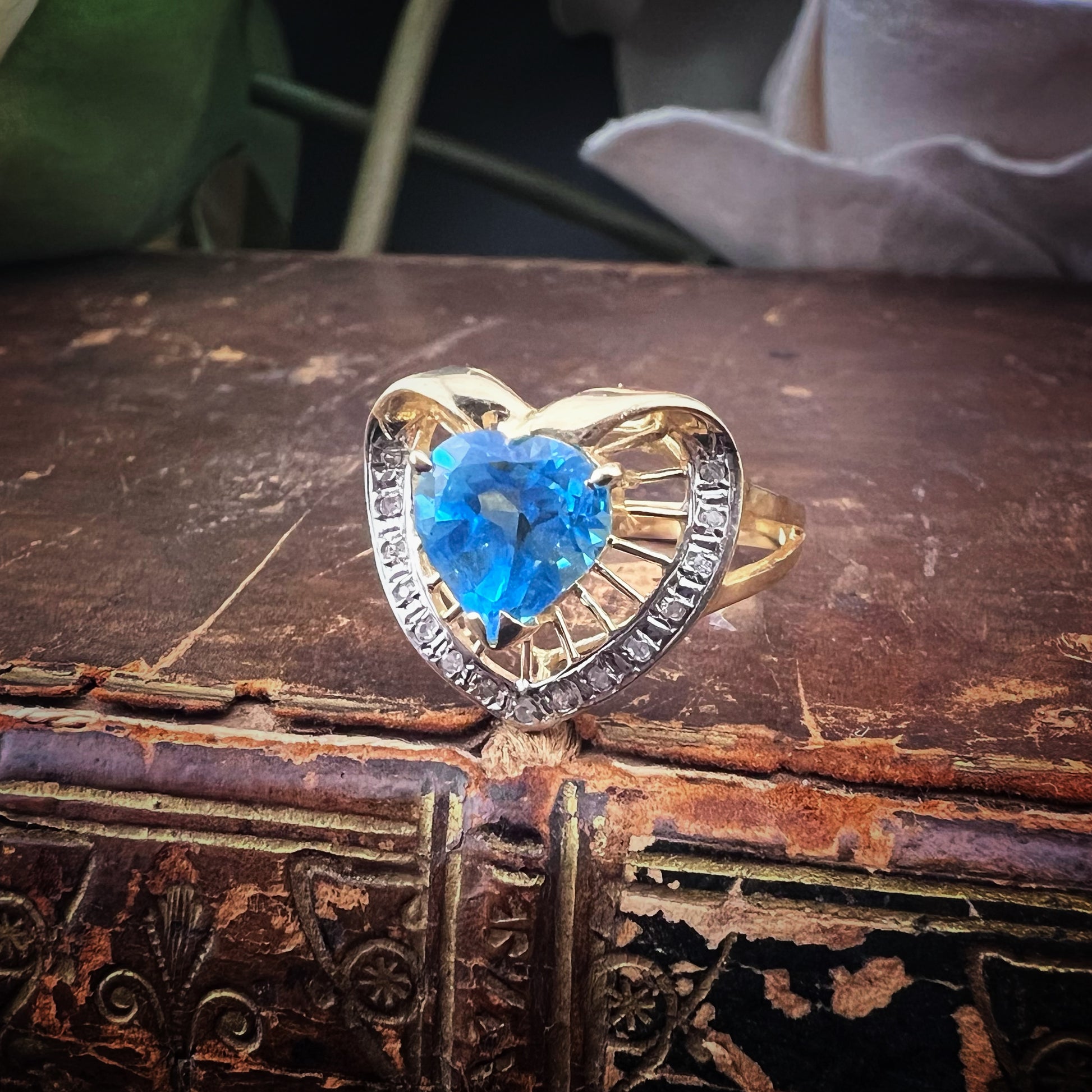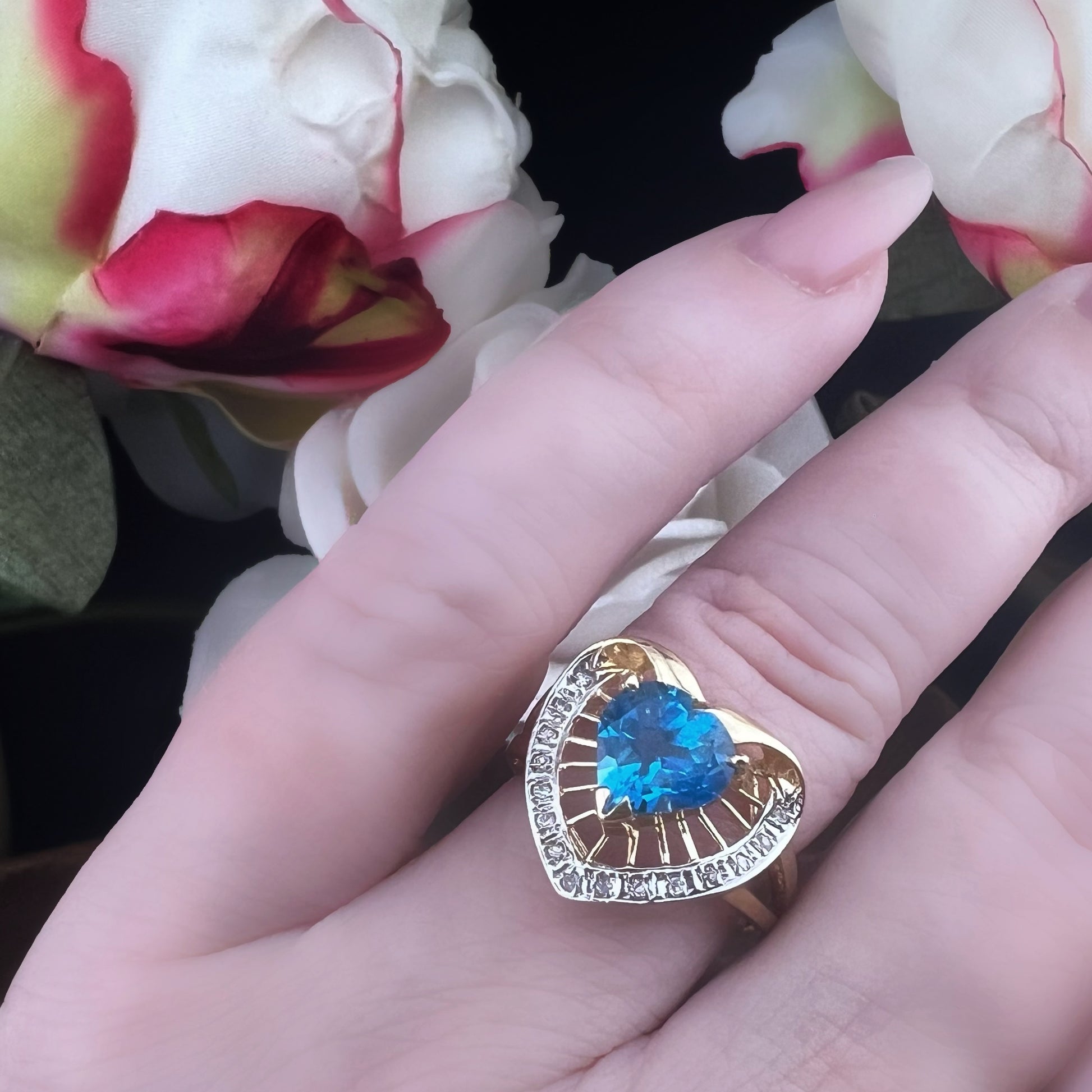 Vintage American 14K Gold Heart-Shaped Blue Topaz and Diamond Ring