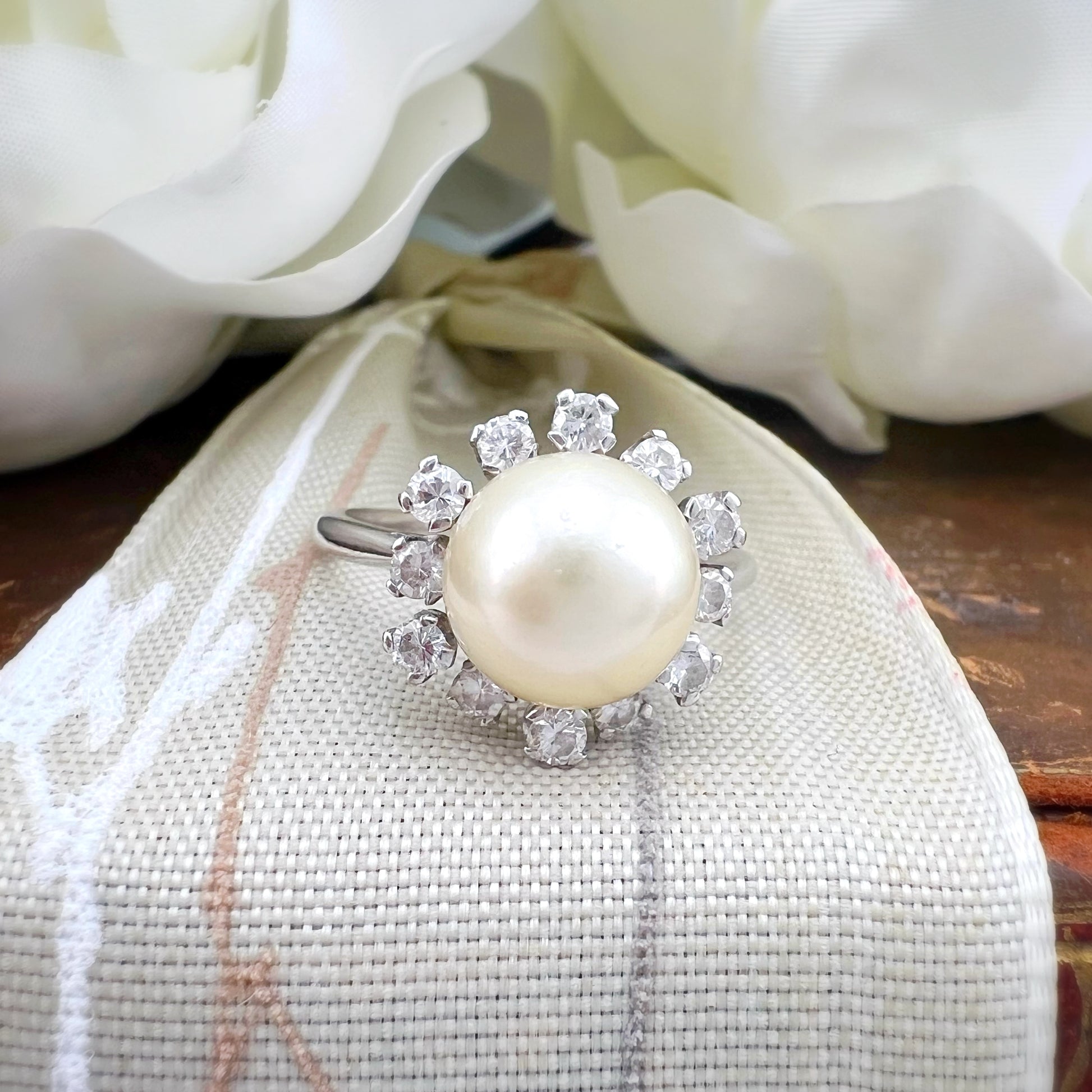 Vintage Asprey 18K White Gold Pearl and Diamond Ring