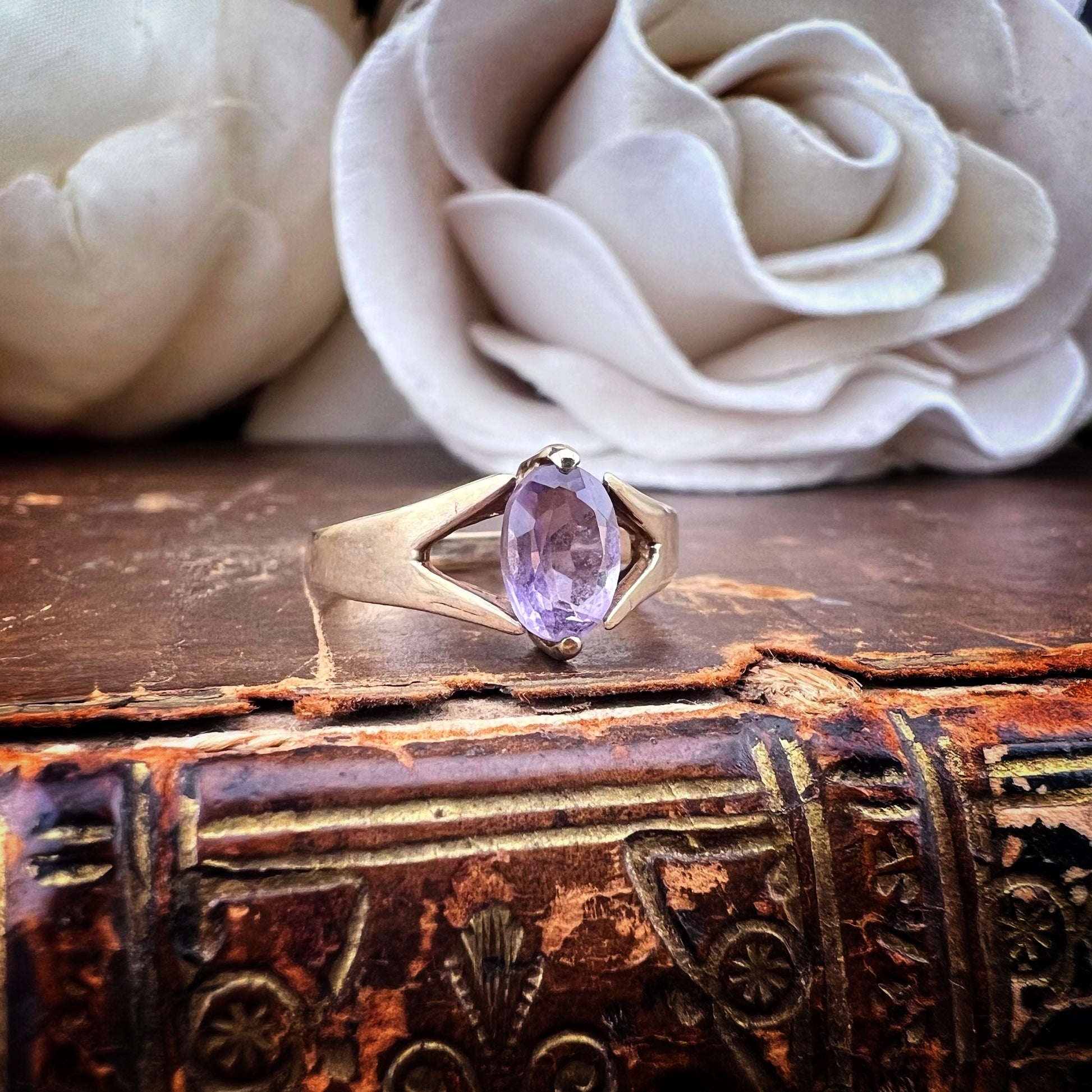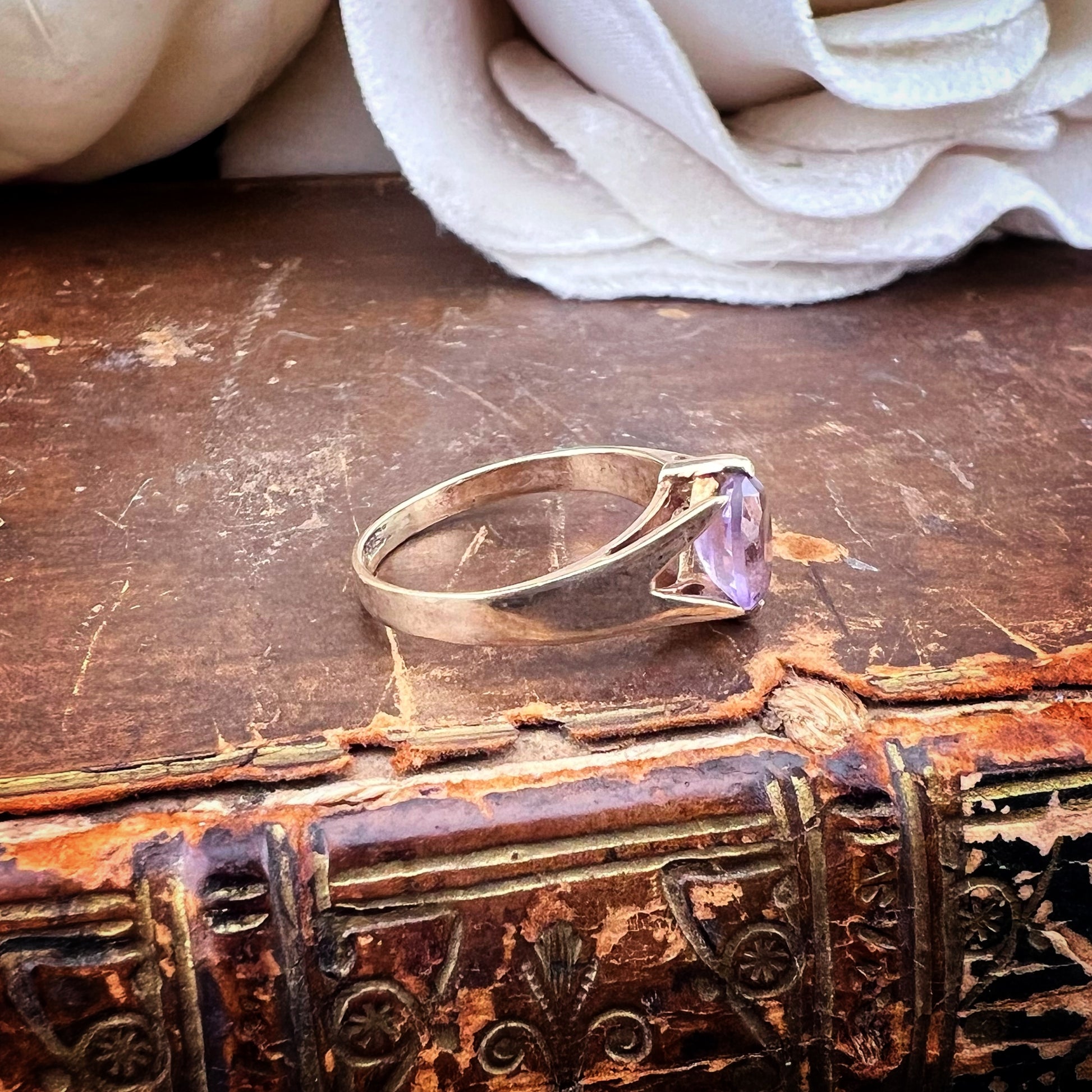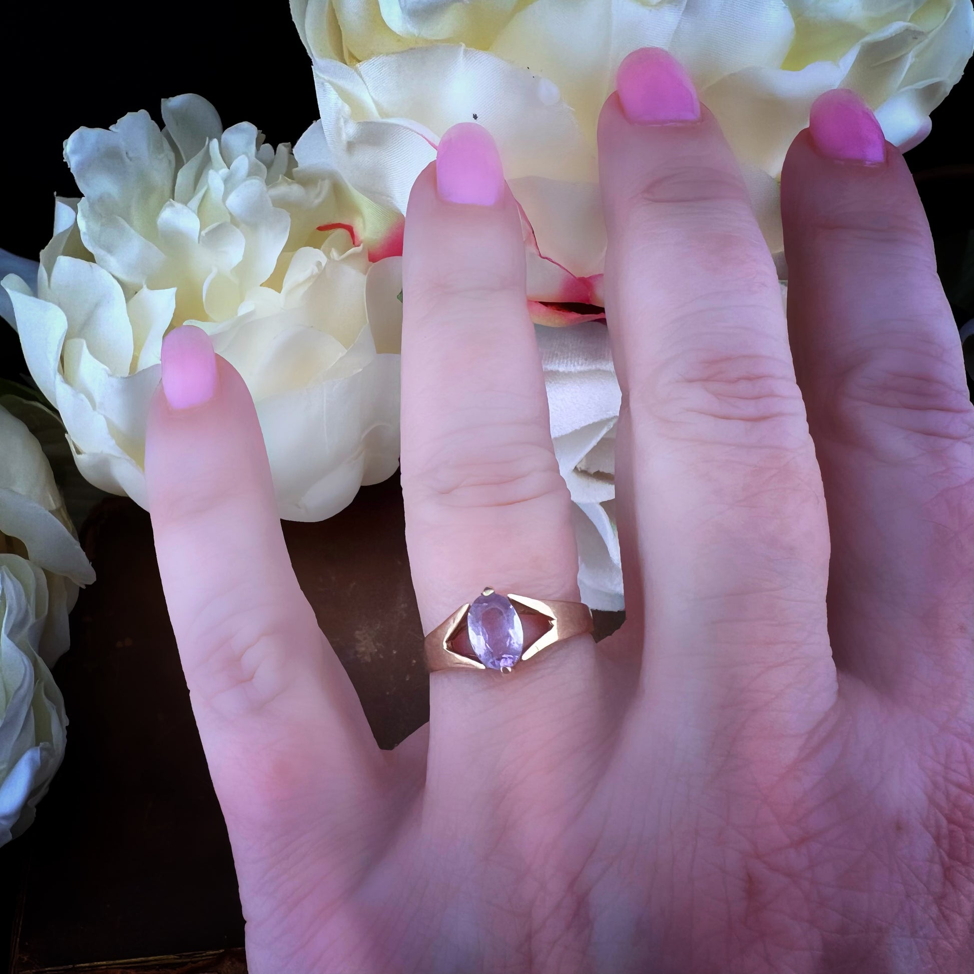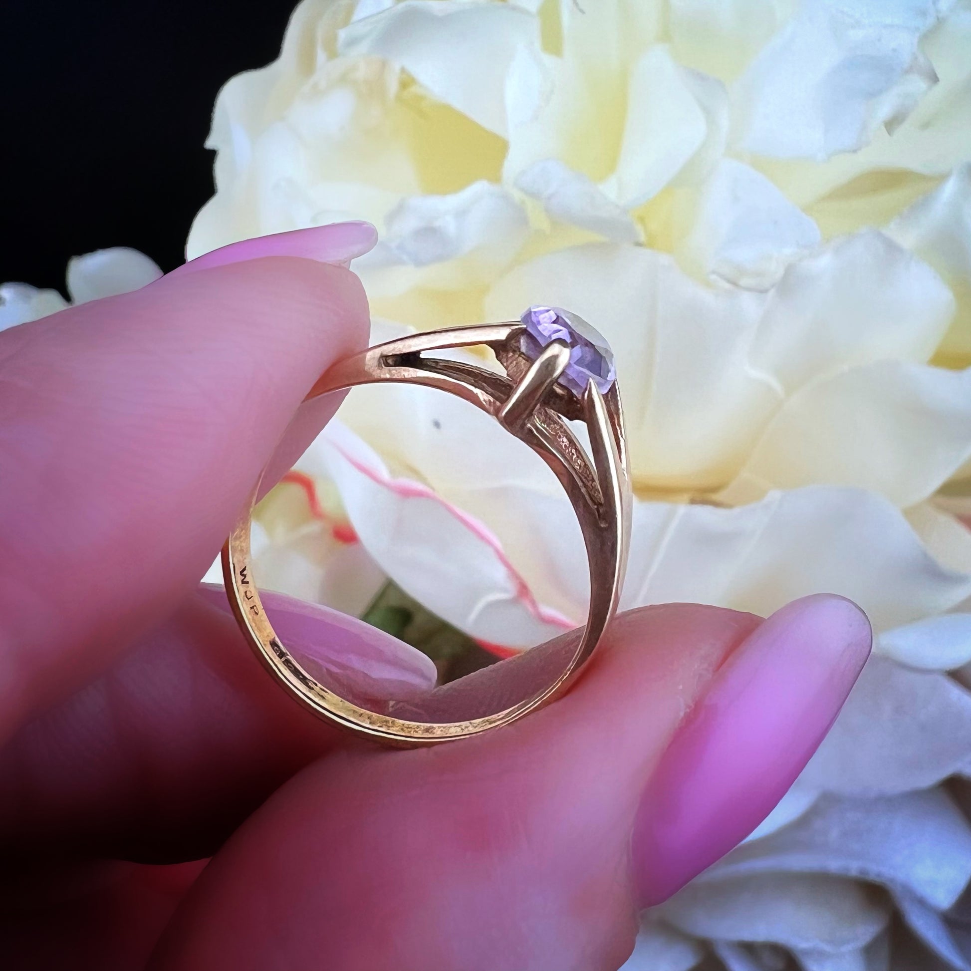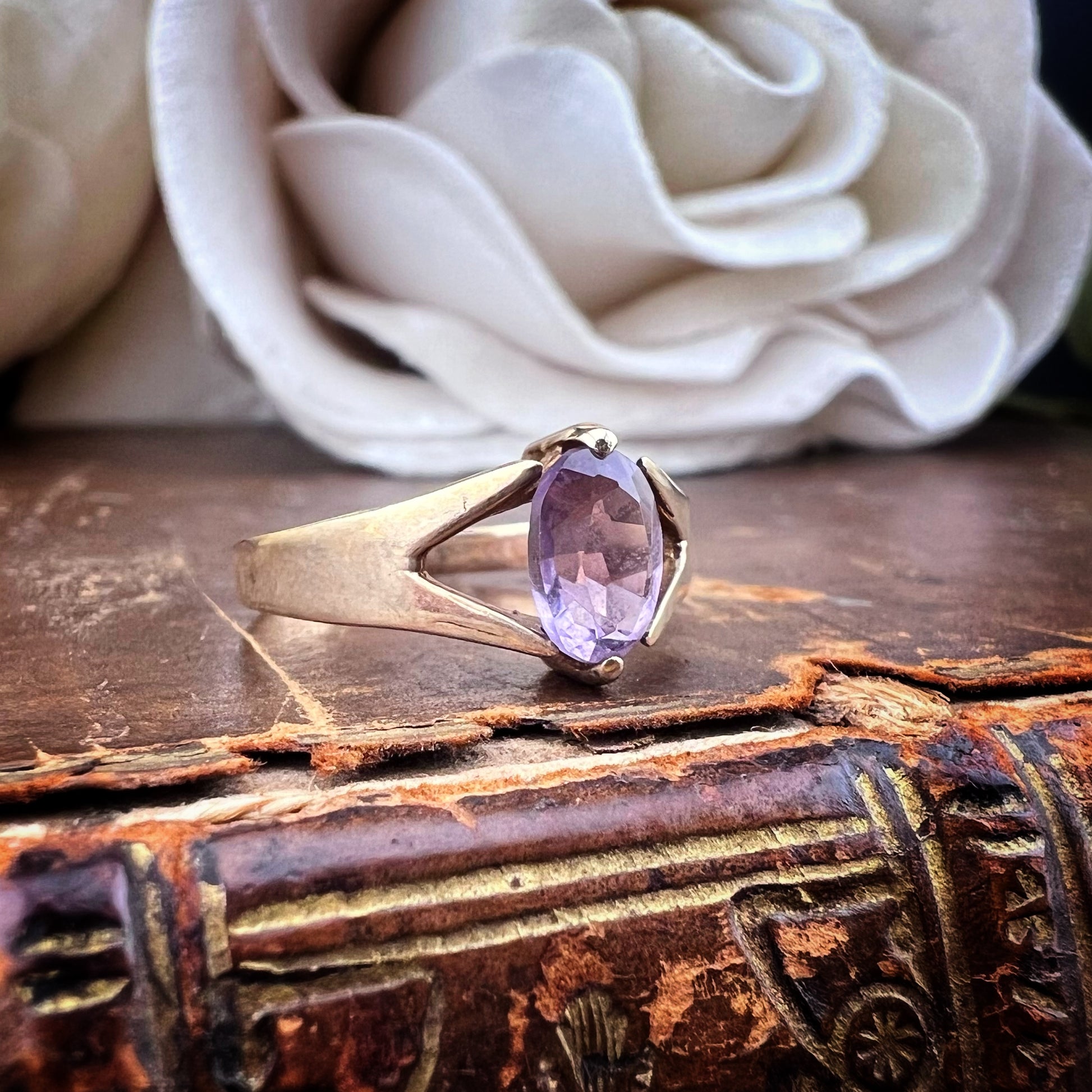 Refined vintage solitaire ring crafted from 9k yellow gold, embellished with a natural oval-cut amethyst (7.5 x 5 mm) in delicate, luminous purple hues. The geometric design with split shoulders lends a light, modern feel to the setting, making this jewel a perfect example of 1970s style.