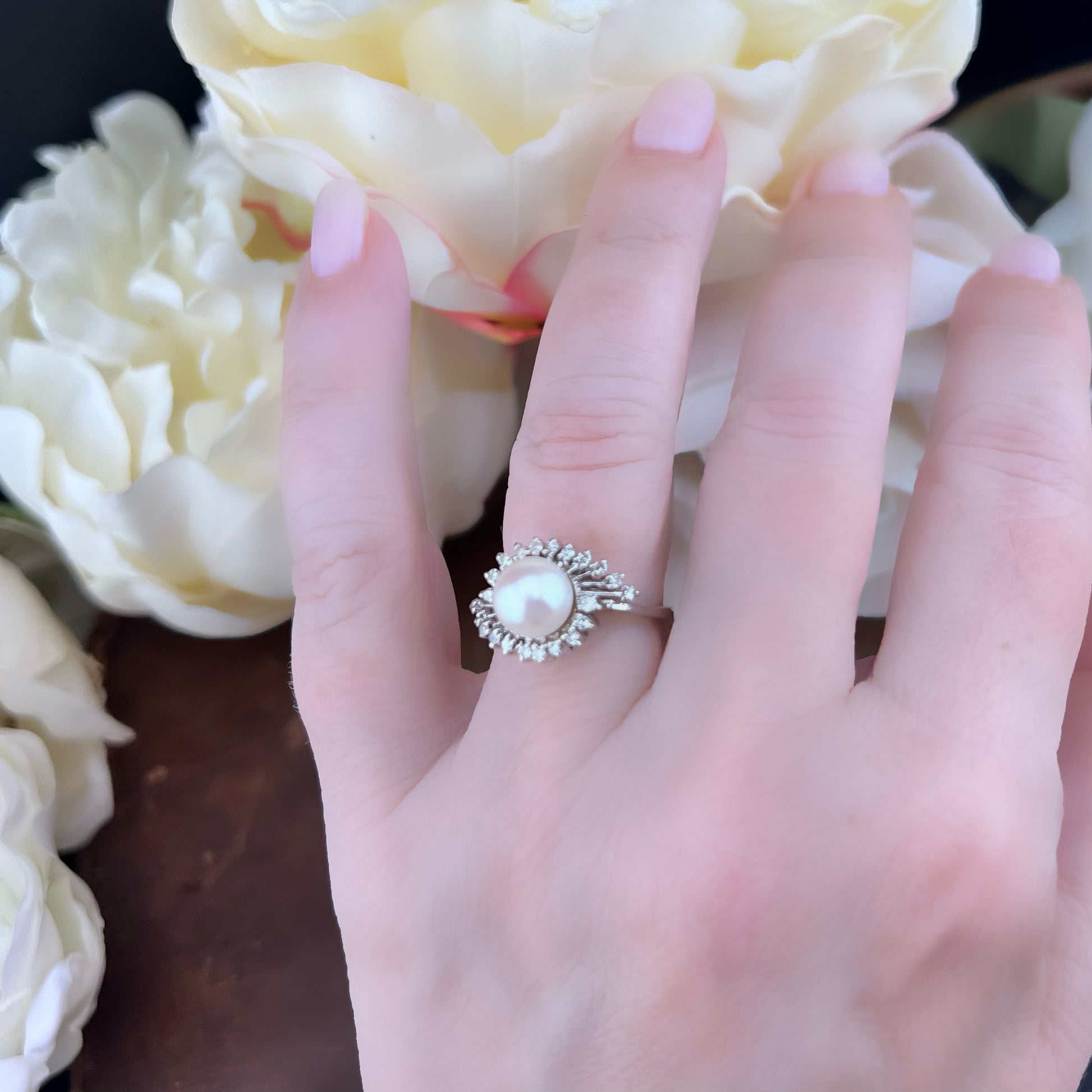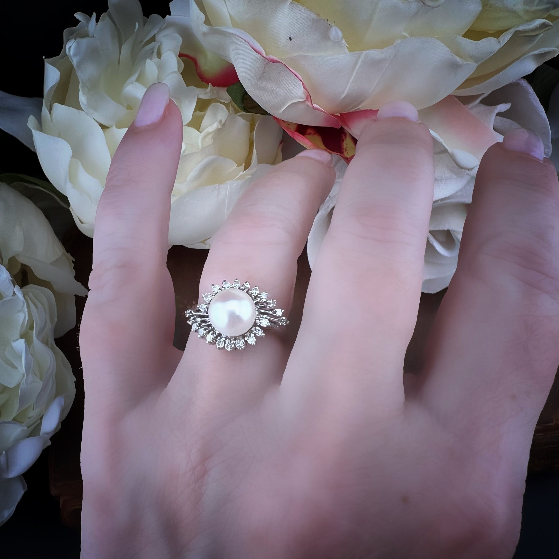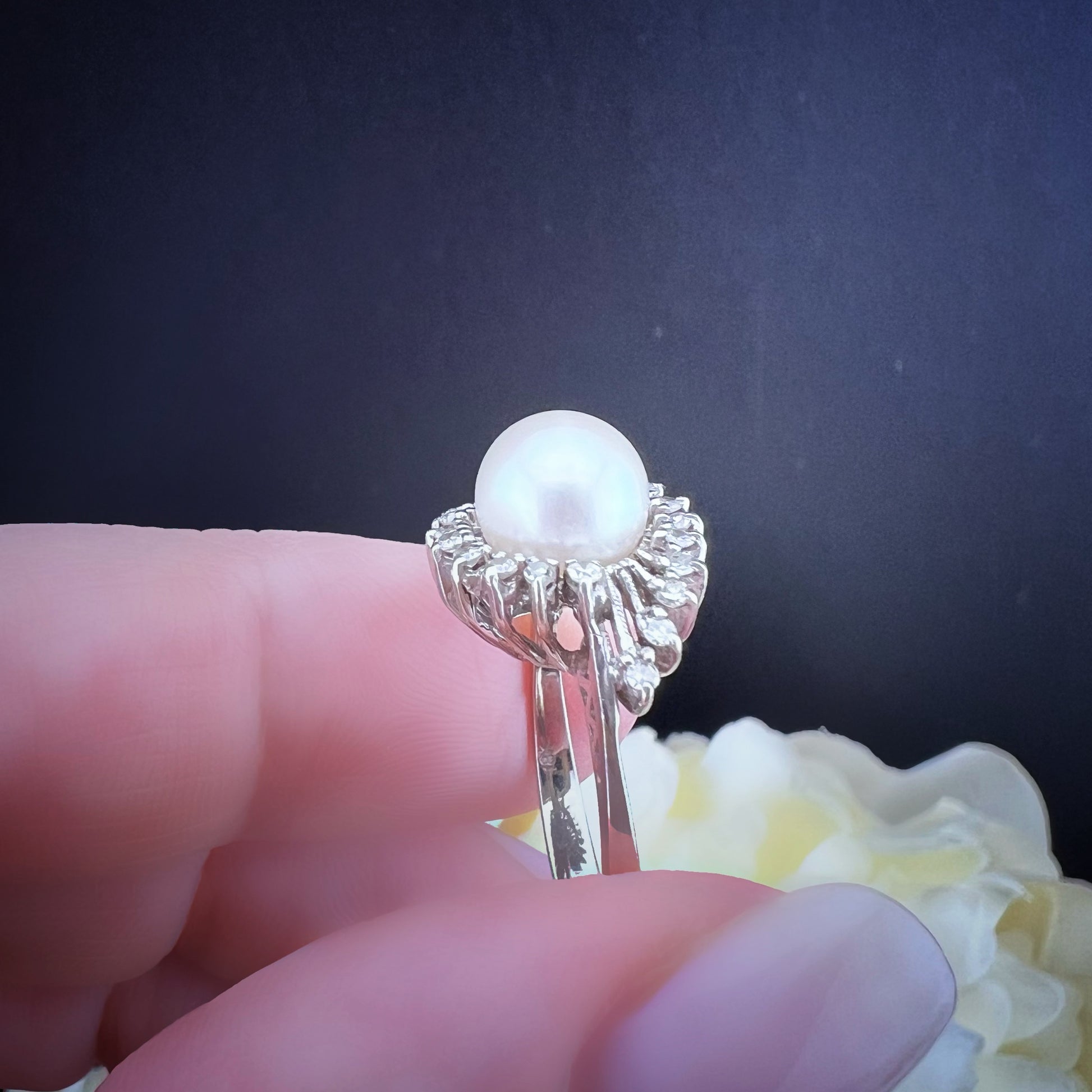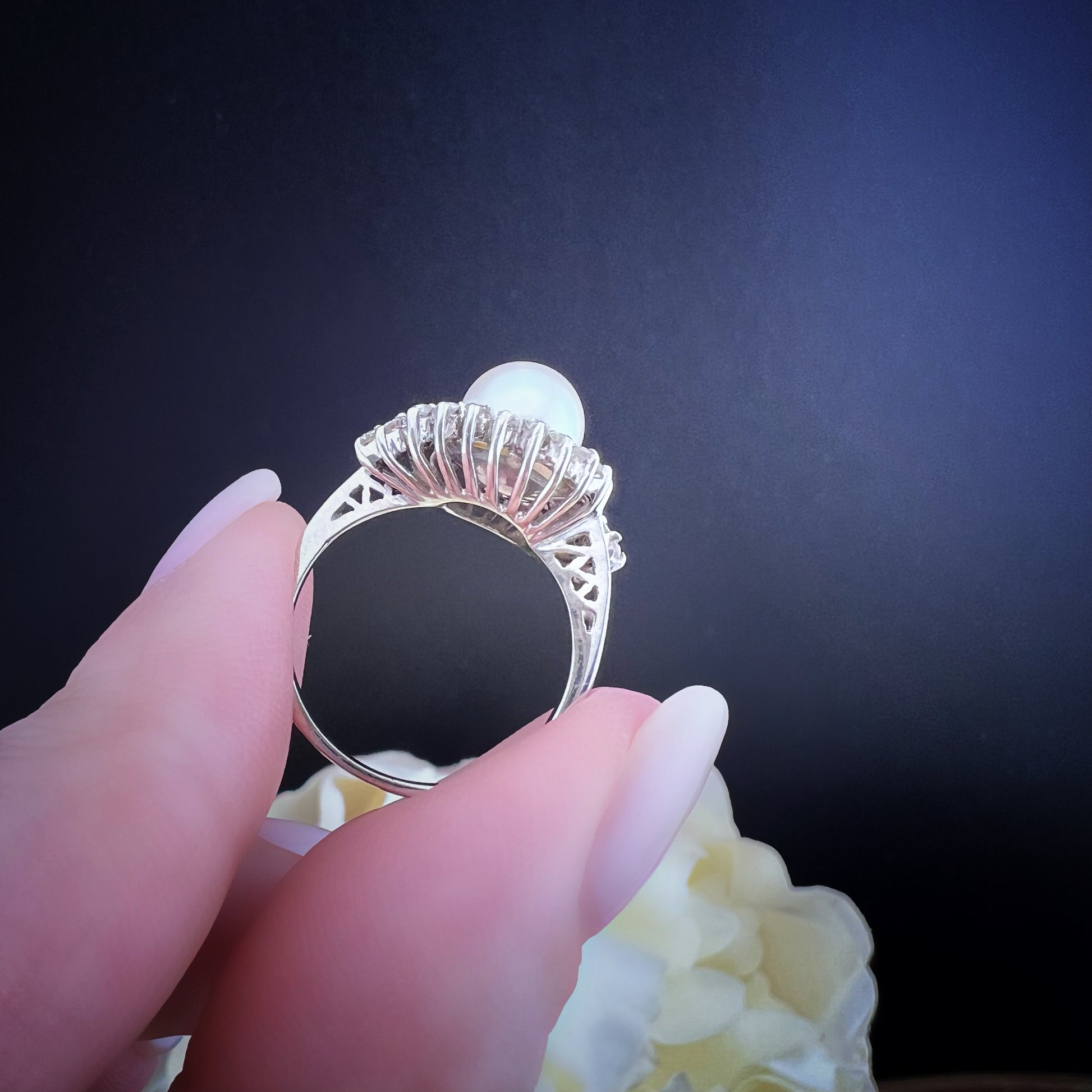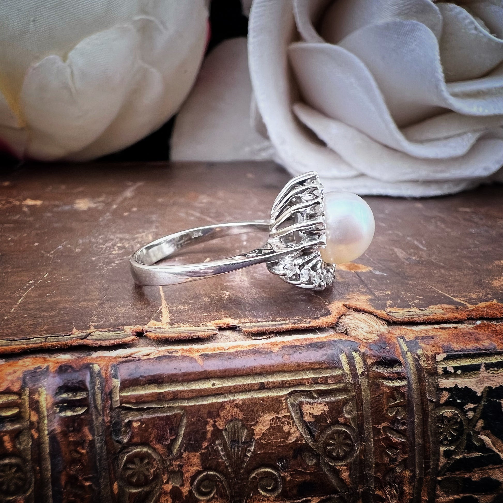 Vintage 18K White Gold Ring with Natural Cultured Pearl and Diamonds – 1950s-1960s