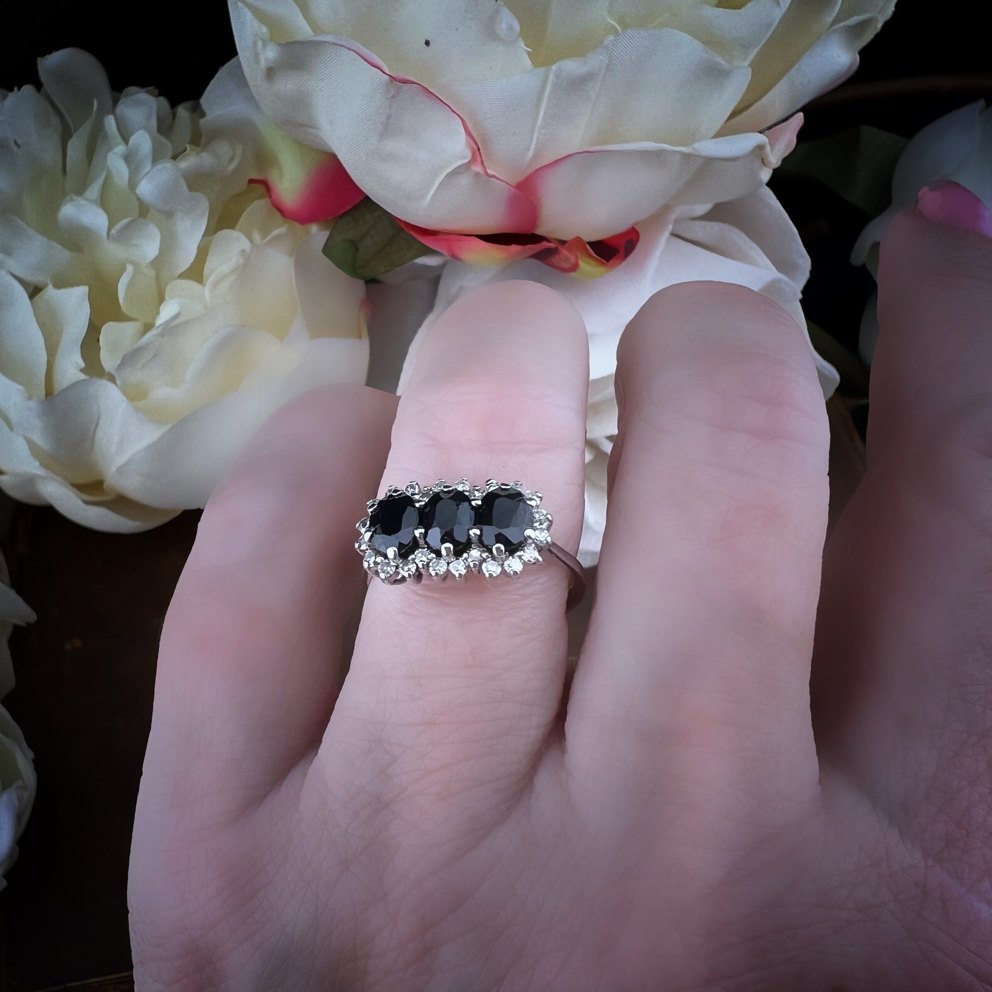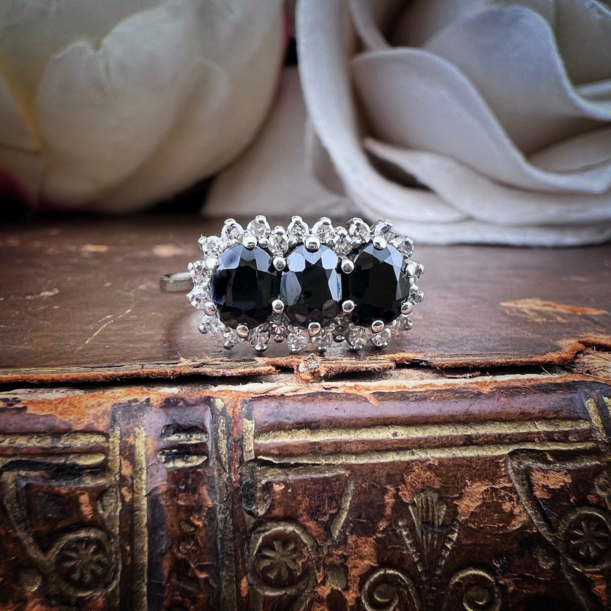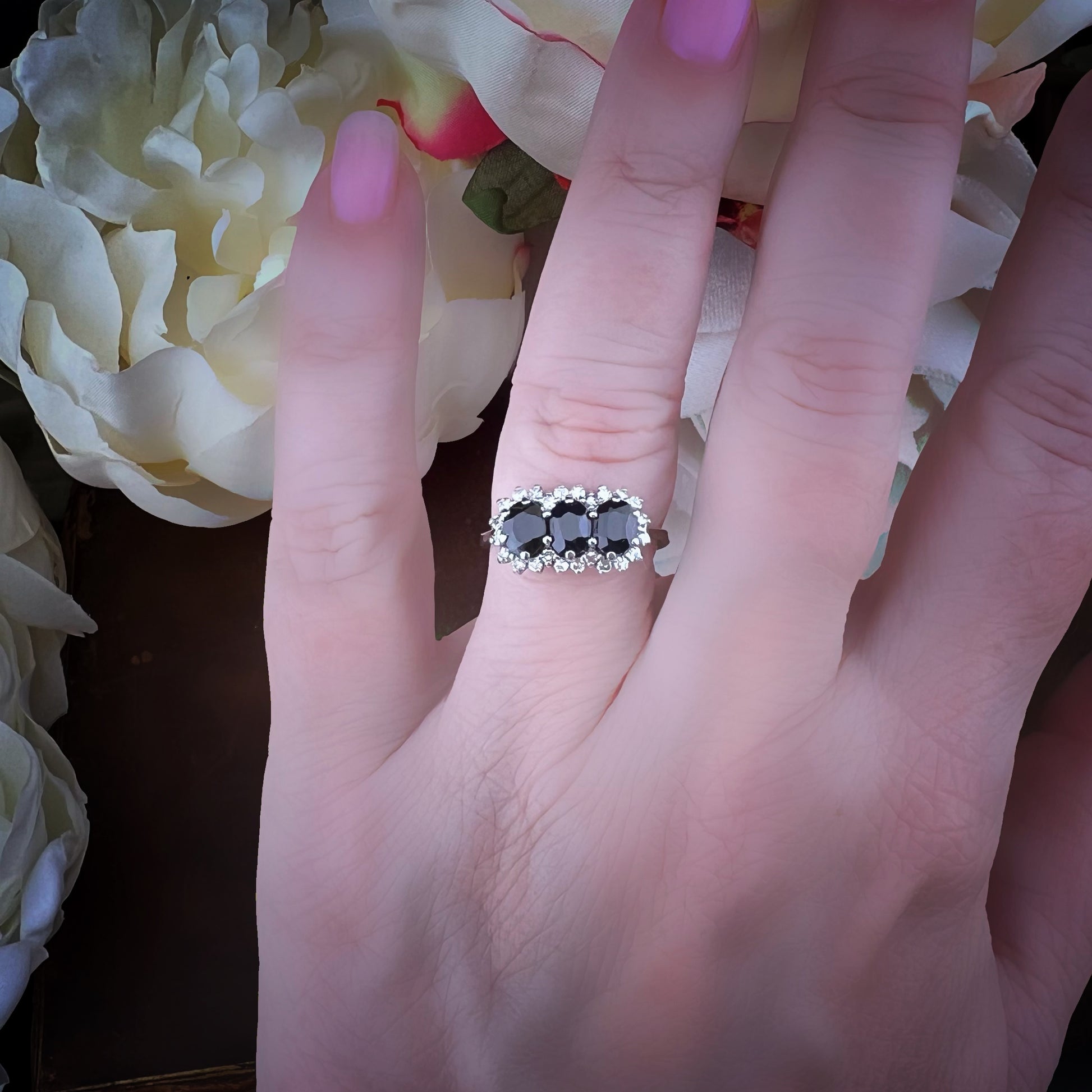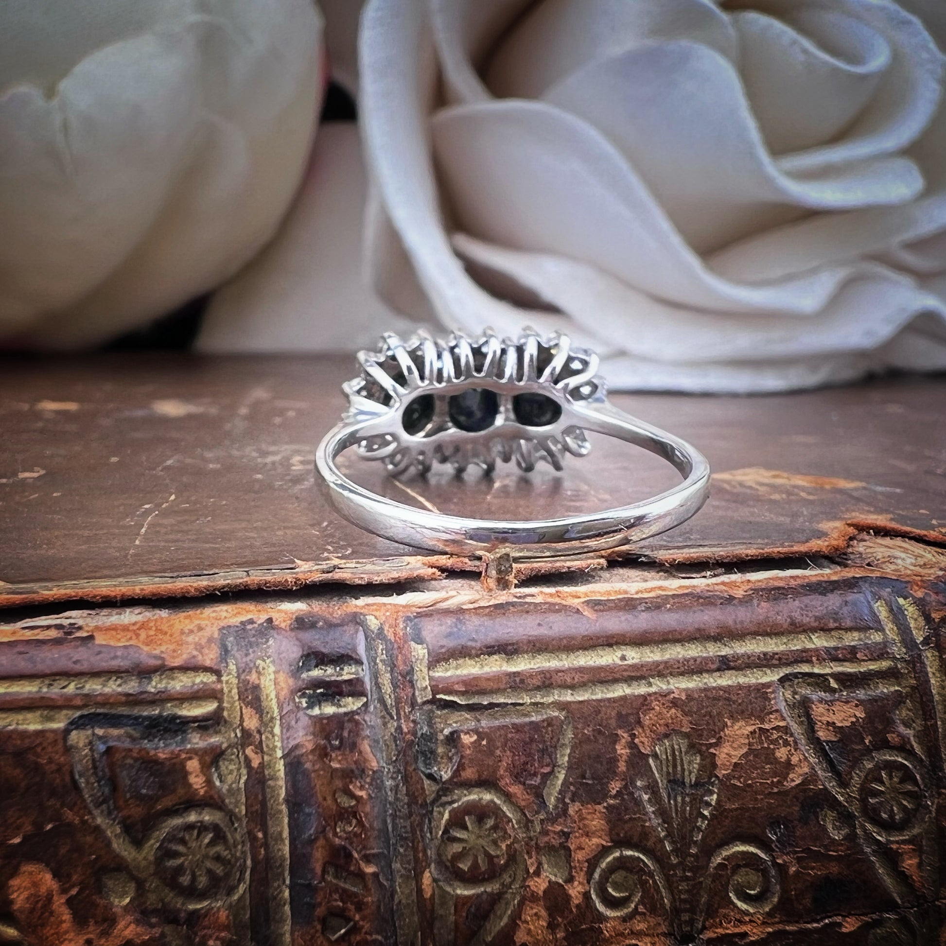 Three 5x4 mm oval-cut sapphires, a deep midnight blue, sit regally on the front of the ring, symbols of wisdom, loyalty, and protection. They are embraced by a sparkling crown of 24 brilliant-cut diamonds, each weighing 0.01 ct, arranged like petals around the sapphire hearts, lending light and movement to every gesture of the hand.